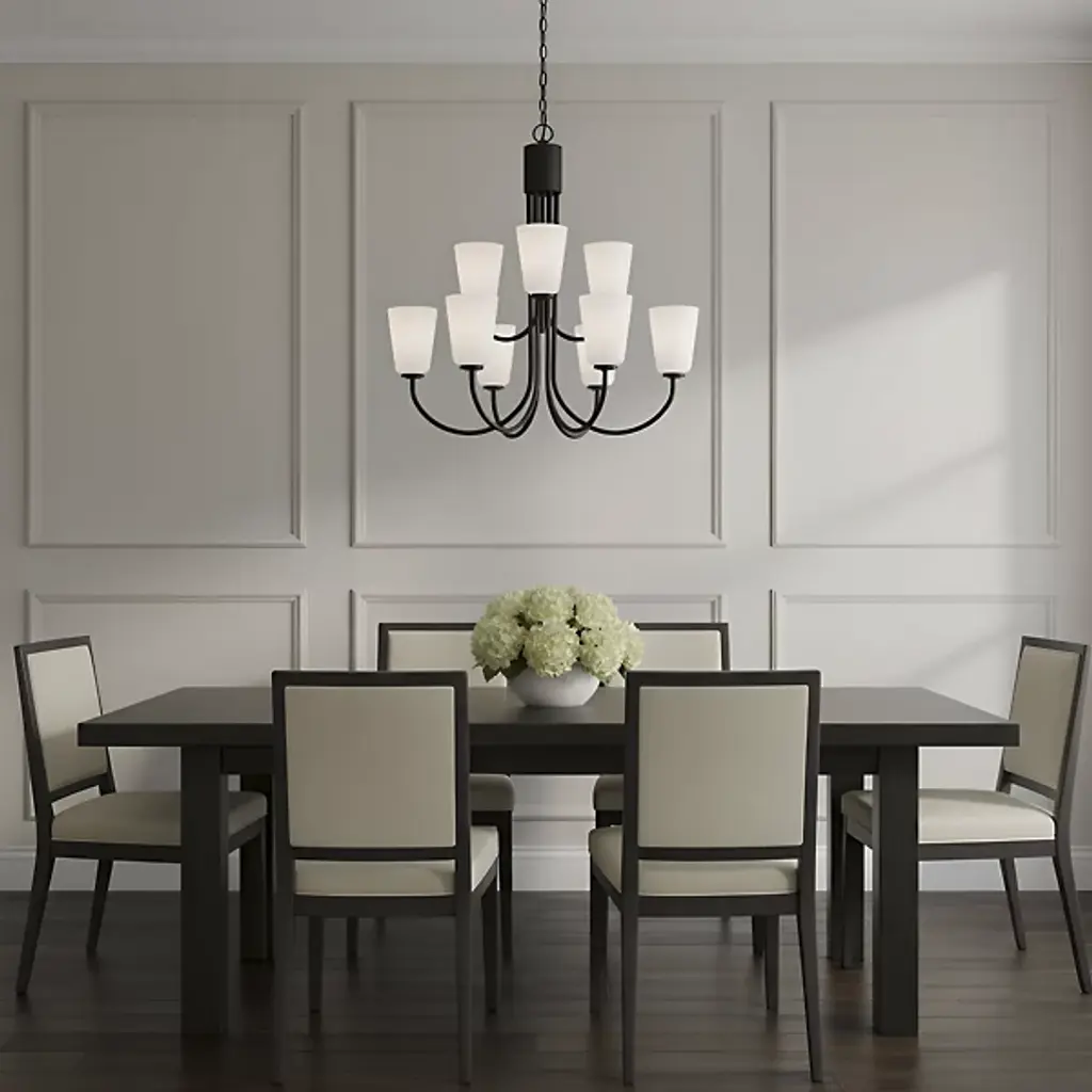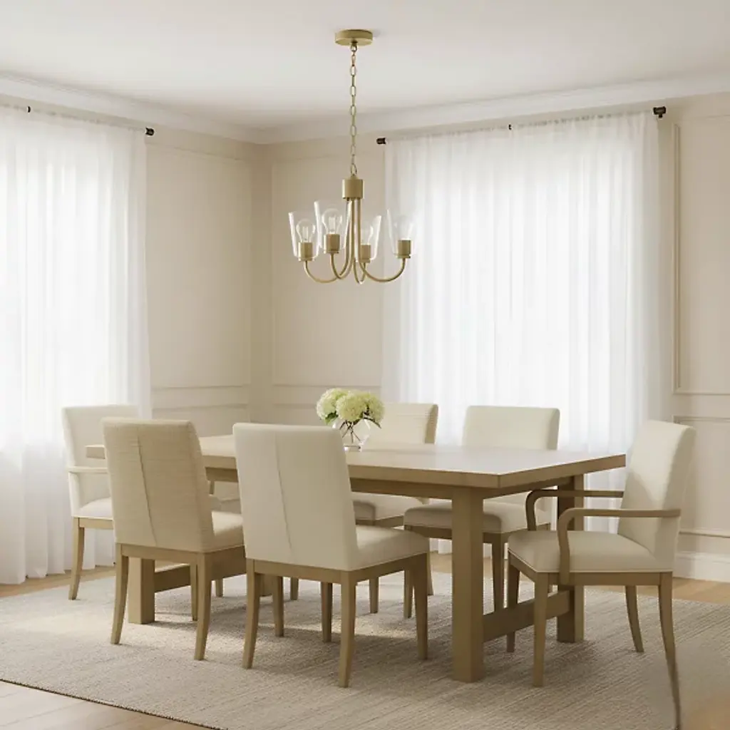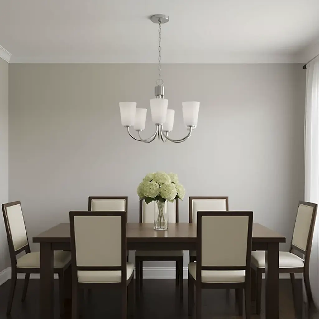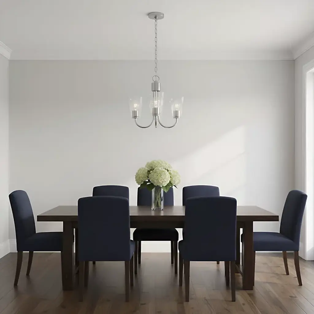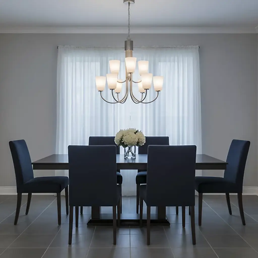 The Miles Multi-Light Chandelier from Generation Lighting arranges multiple tapered shades around curved metal arms that extend from a central hub. Each glass shade softens light output while preserving the collection's signature bell form. The chandelier can accommodate sloped ceiling installations and supports full dimmable control for atmospheric lighting adjustments. This multi-arm configuration allows each shade to contribute to the overall illumination while maintaining individual character through the tapered glass geometry.