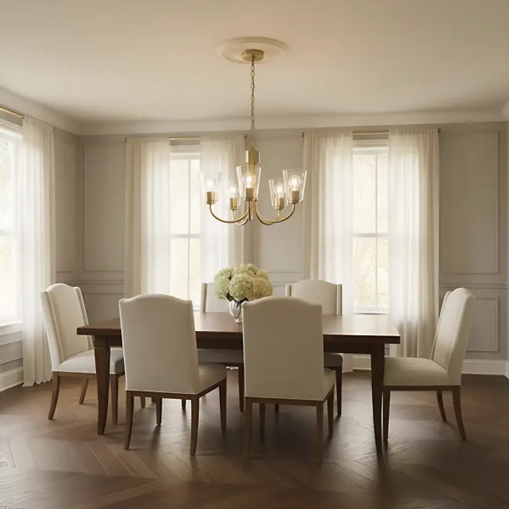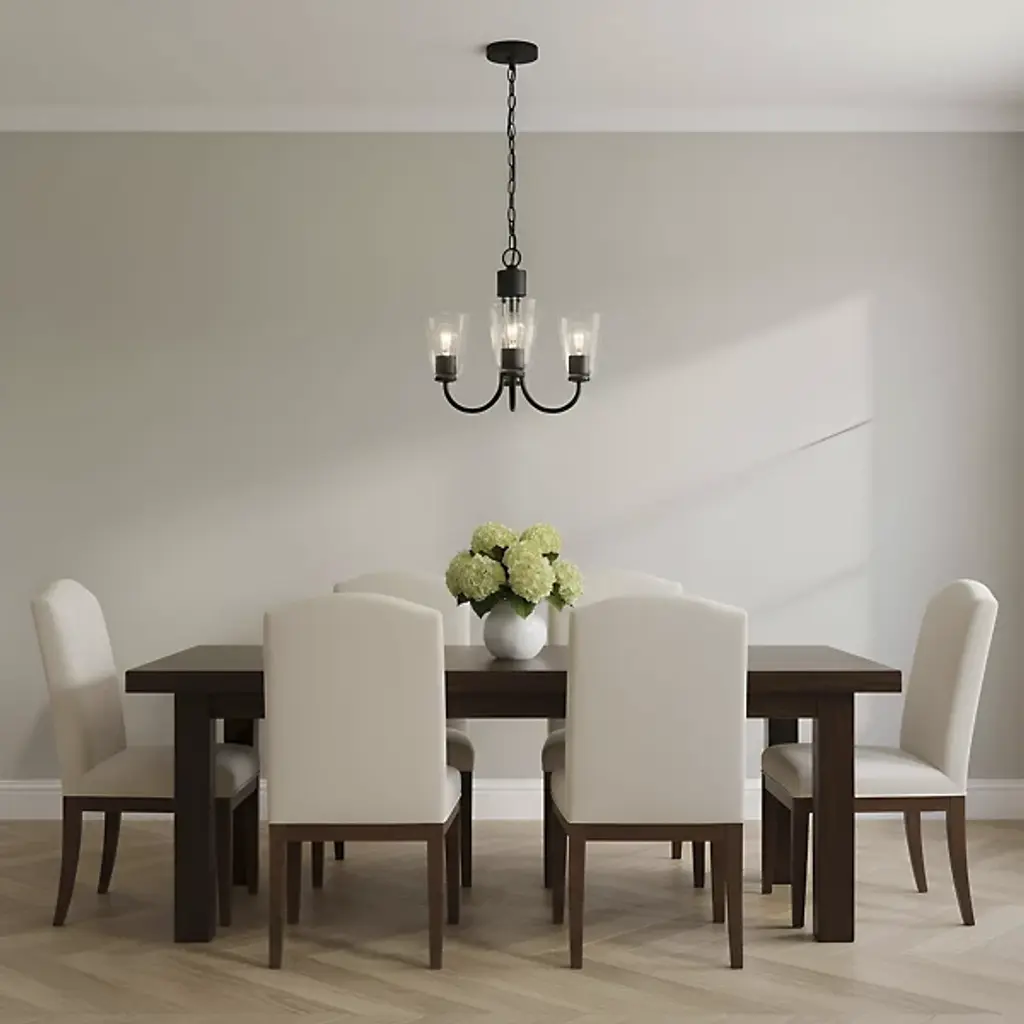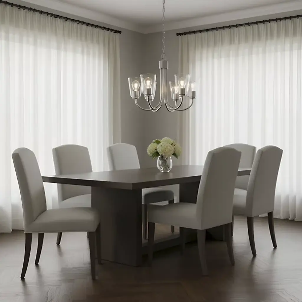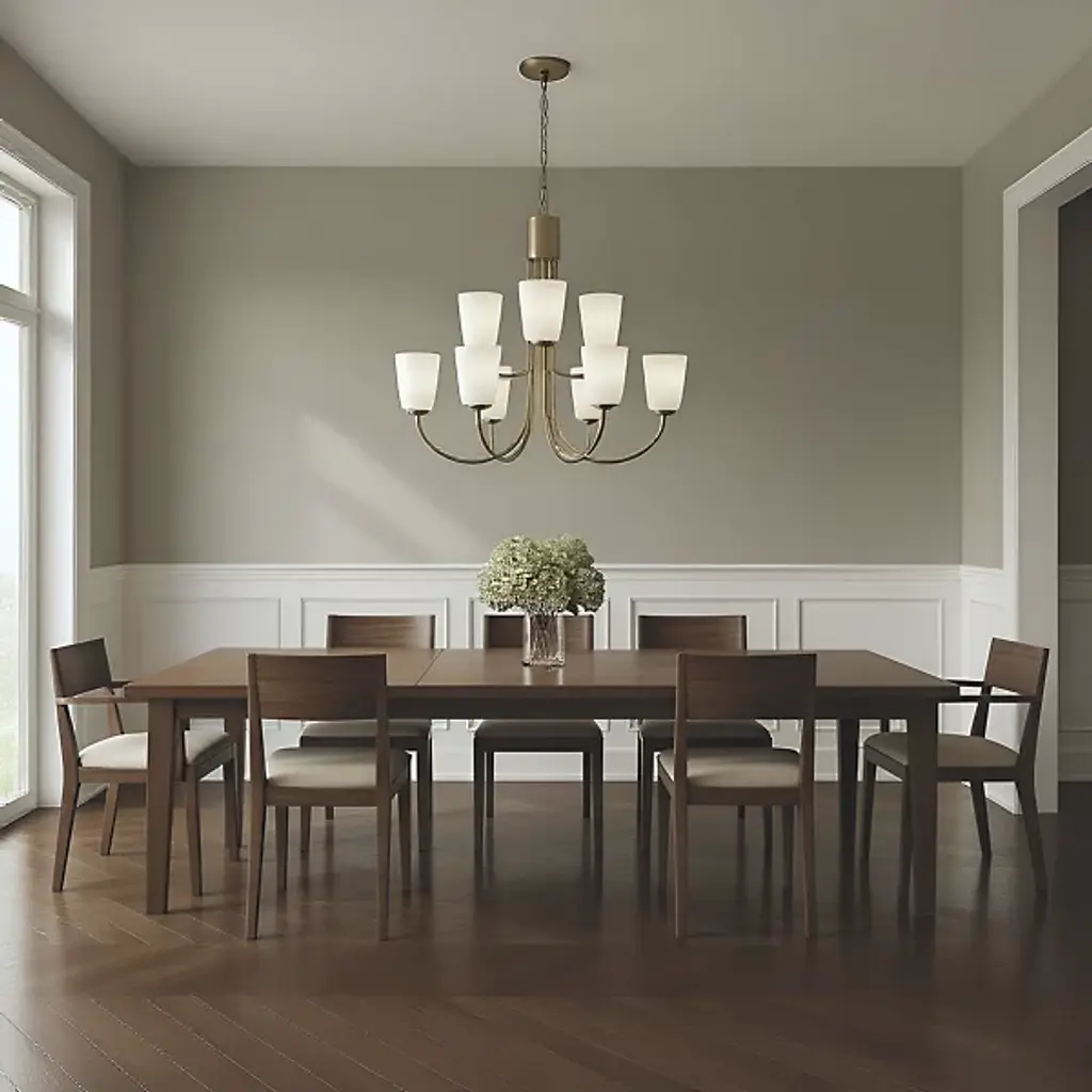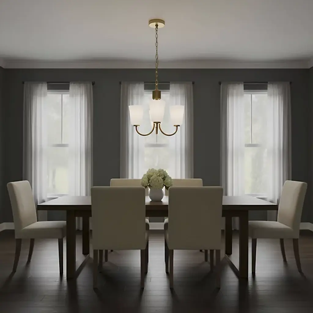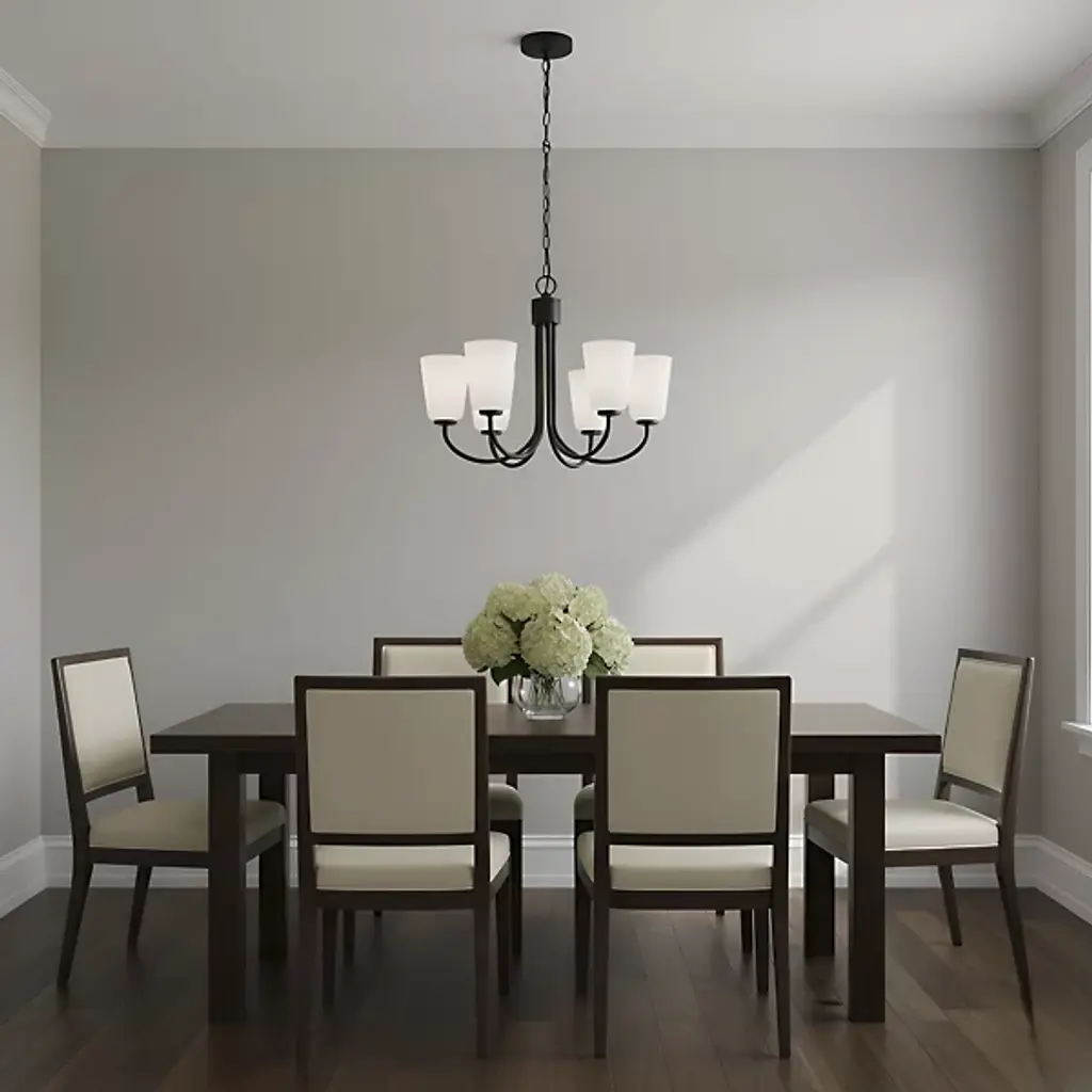 The Miles Multi-Light Chandelier from Generation Lighting arranges multiple tapered shades around curved metal arms that extend from a central hub. Each glass shade softens light output while preserving the collection's signature bell form. The chandelier can accommodate sloped ceiling installations and supports full dimmable control for atmospheric lighting adjustments. This multi-arm configuration allows each shade to contribute to the overall illumination while maintaining individual character through the tapered glass geometry.