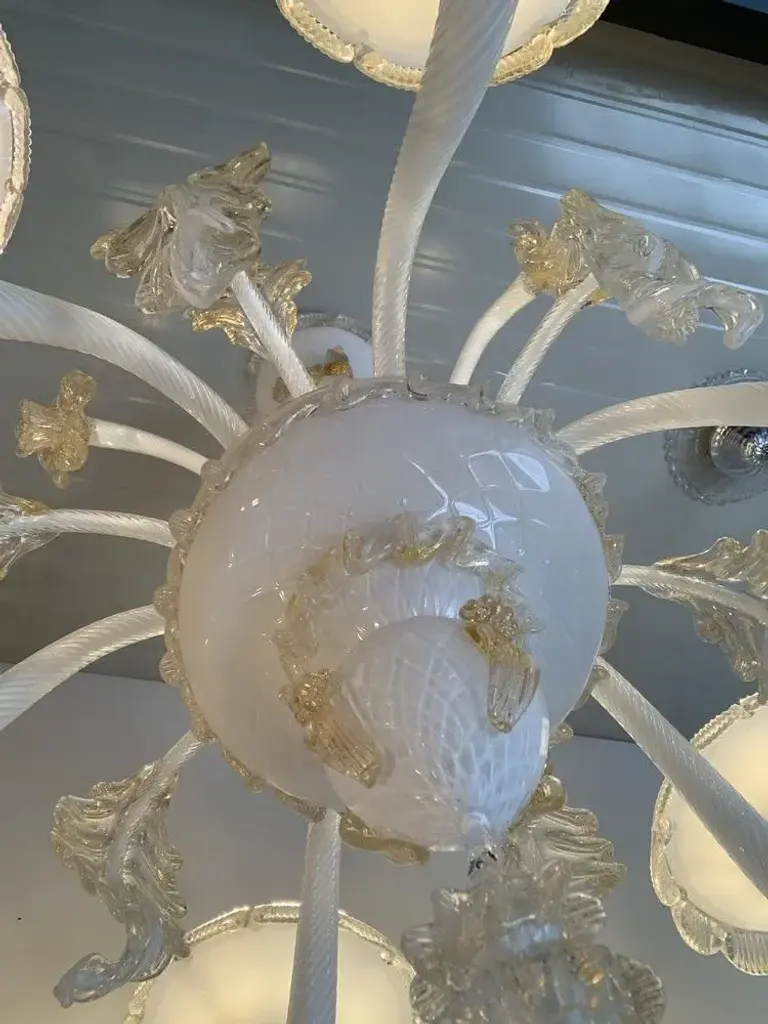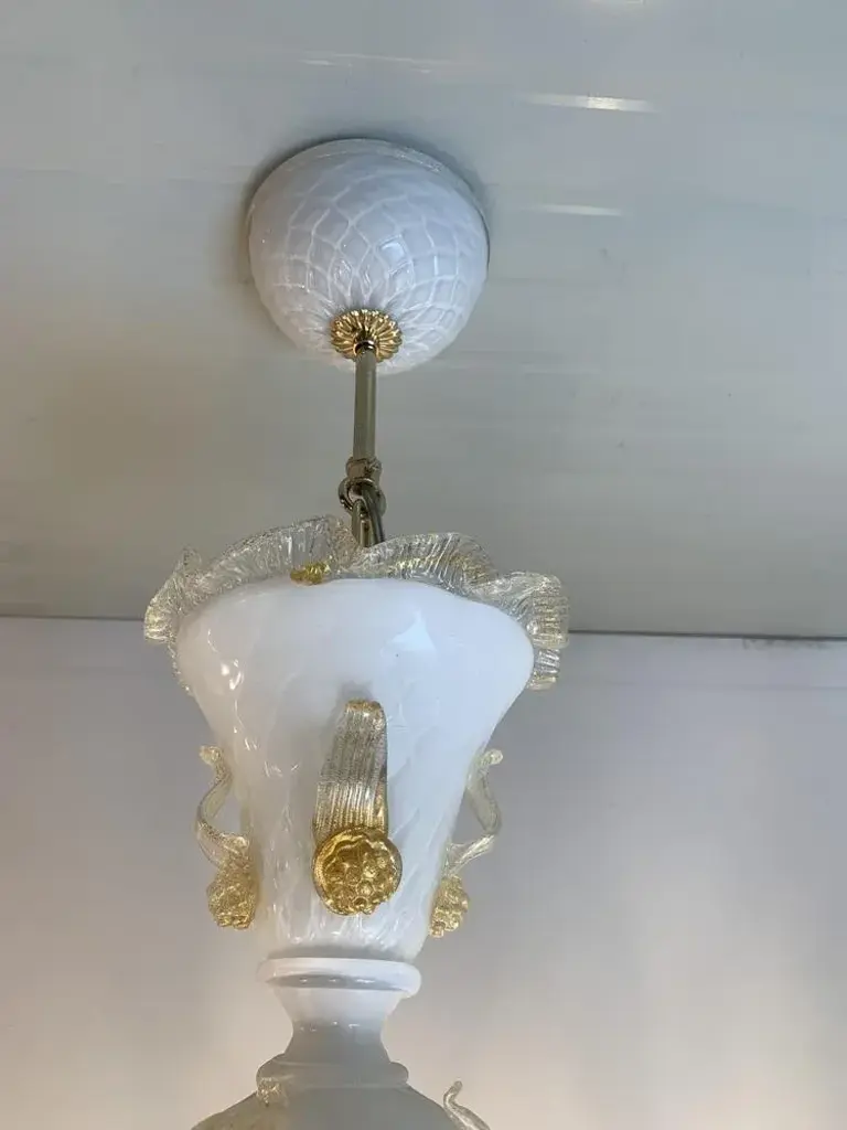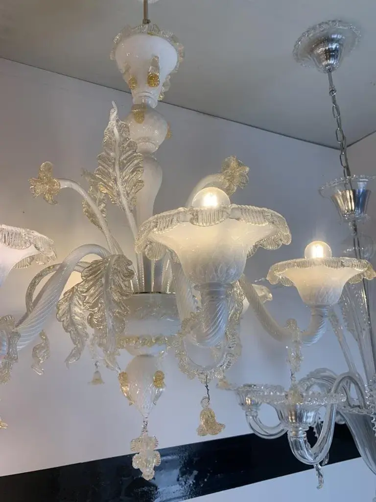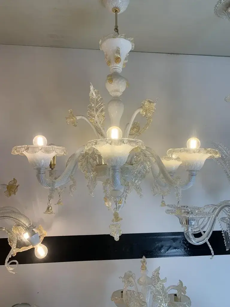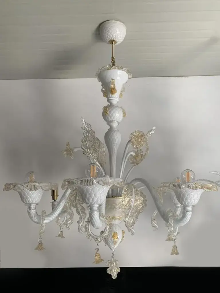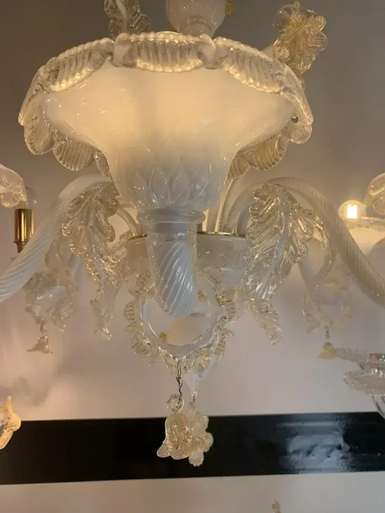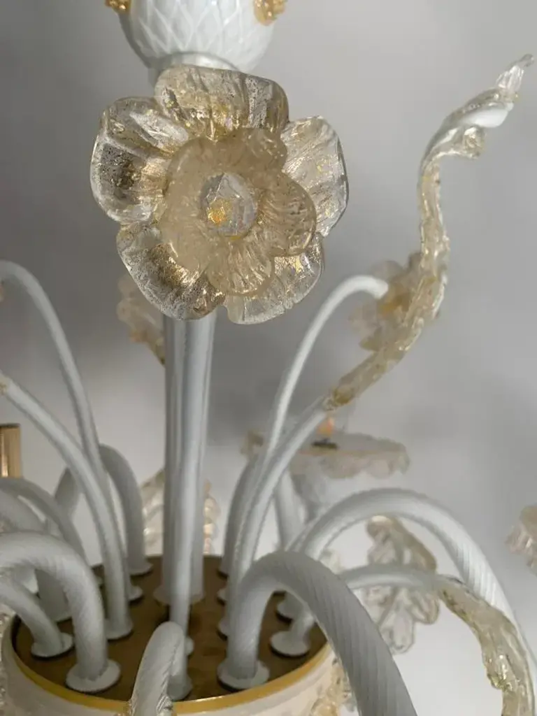 Classical milky and gold-leaf Murano glass chandelier with flowers and leaves. Traditional piece of italian art of blowing glass. Very elegant for classical and modern interiors. Design ad production made in Italy. Made in Murano glass, Murano Attributed. Very hand-made working glass, fruit of high Italian craftsmanship. 6 bulbs, not included, compatible with Led sustainability. Chain 50 cm = 19.7″ More canopy Design ad production made in Italy. Not assembed Up to 250V (Europe/UK Standard).