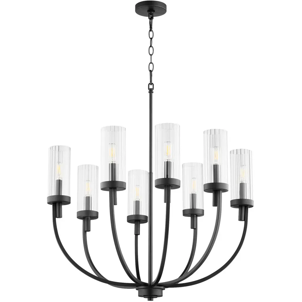 Collection: Burbank, Finish Color: Matte Black/Heirloom Bronze, Width: 28.5", Height: 34.5", Chain Length: 5", Number Of Bulbs: 9, Wattage: 100 Watts, Dimmable: No, Moisture Rating: Dry Rated, Desc: Shade Included: Yes. 1 year limited manufacture's warranty Chain Length: 5.00. ,