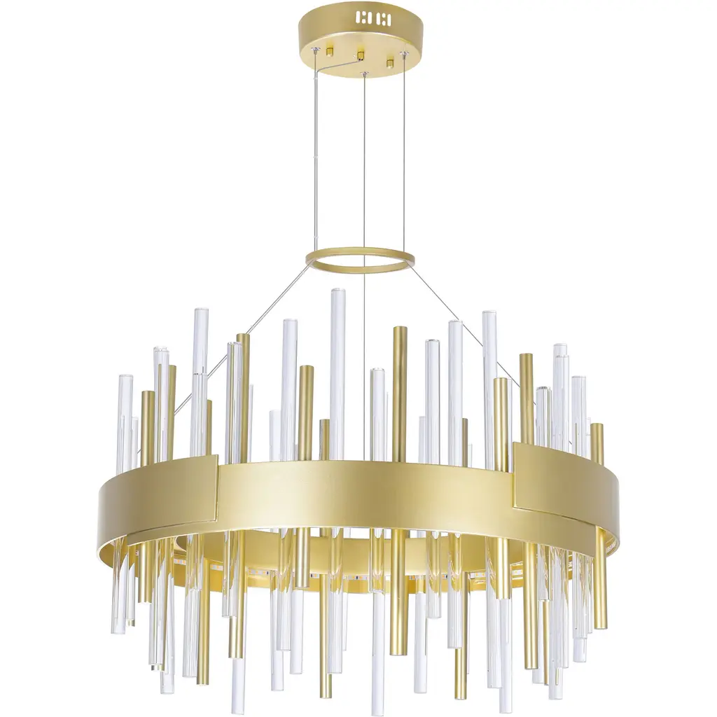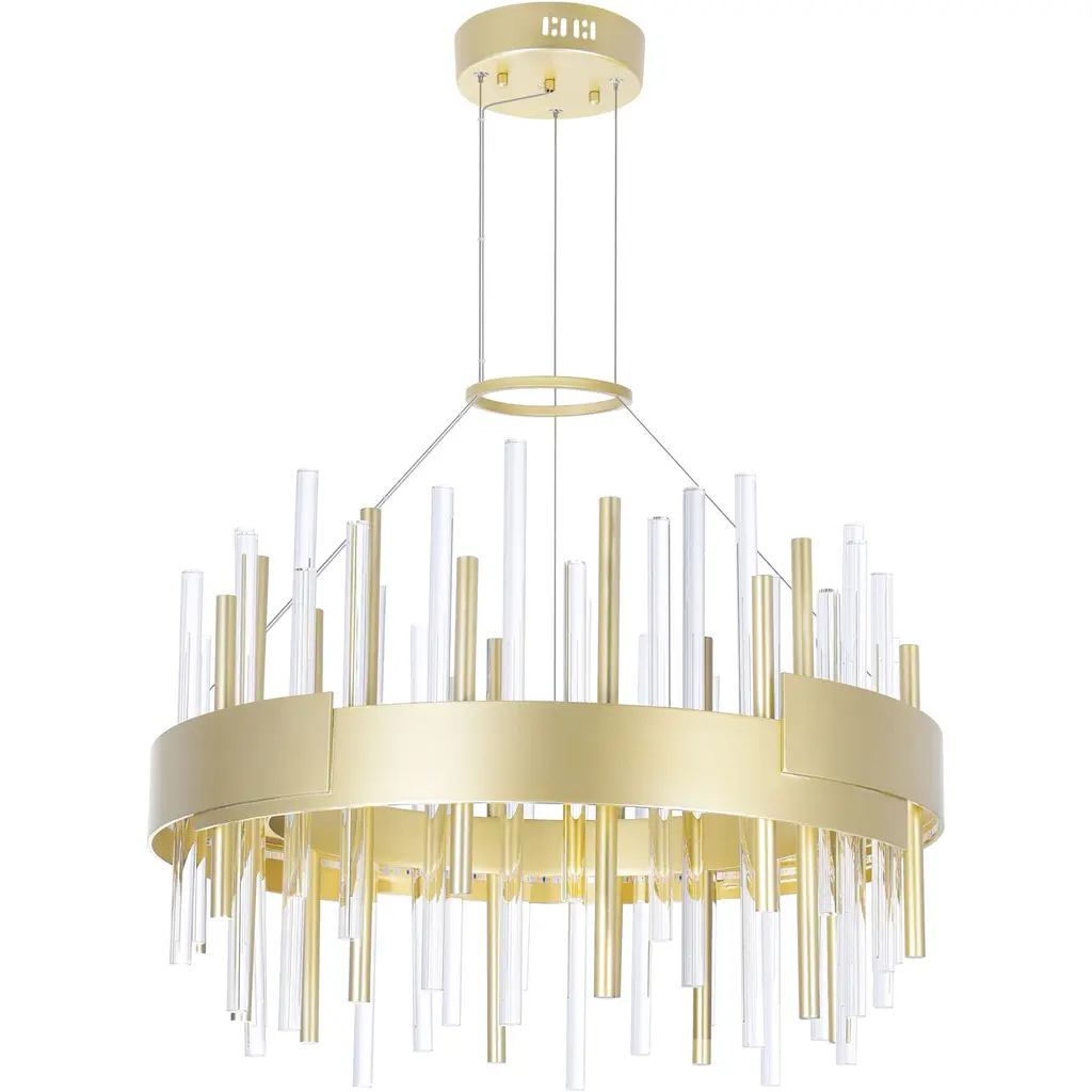 Infuse your space with subtle luxury using the Millipede 20-Inch Integrated LED Chandelier in Satin Gold. Featuring a central ring crafted from overlapping gold bands and detailed with slender clear and gold glass tubes along the top and bottom edges, this chandelier combines timeless glamour with a modern silhouette. It's the perfect choice for adding a warm, polished glow and a sophisticated focal point to your home.