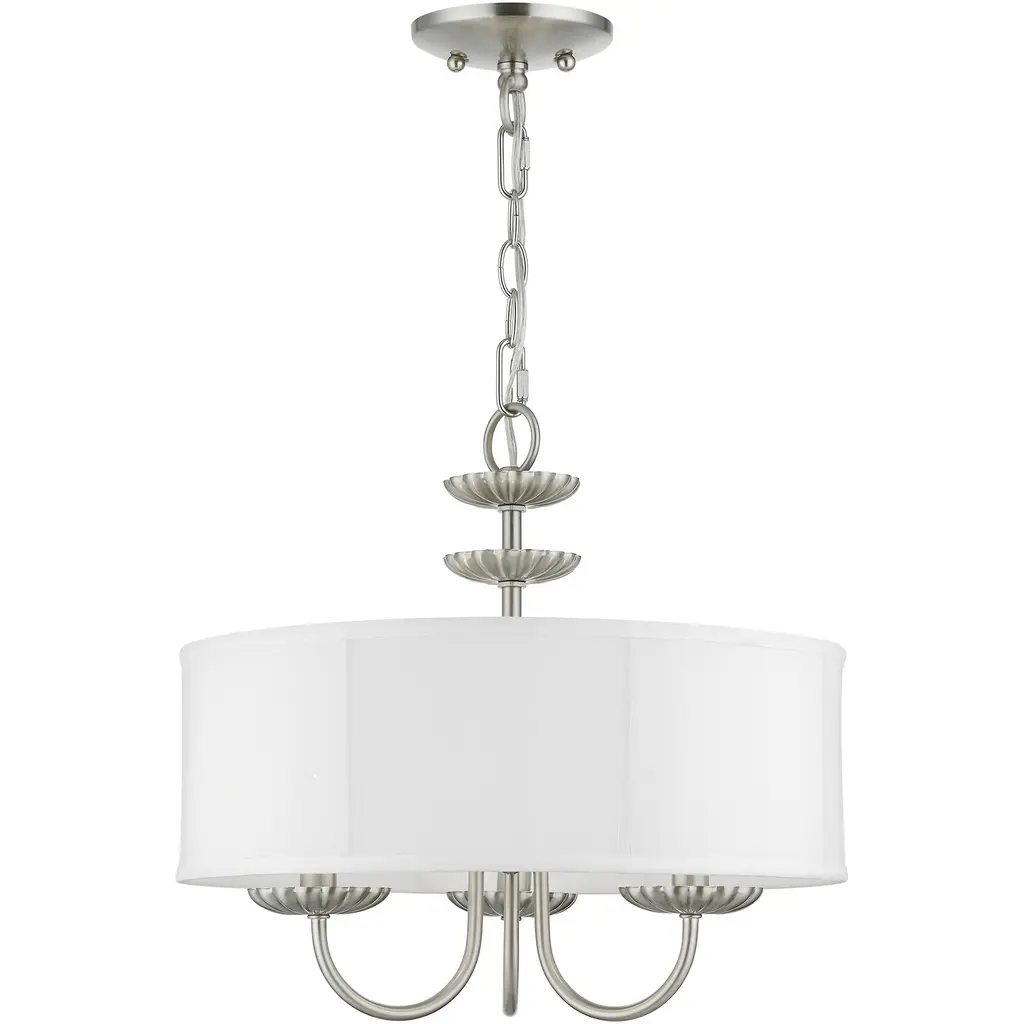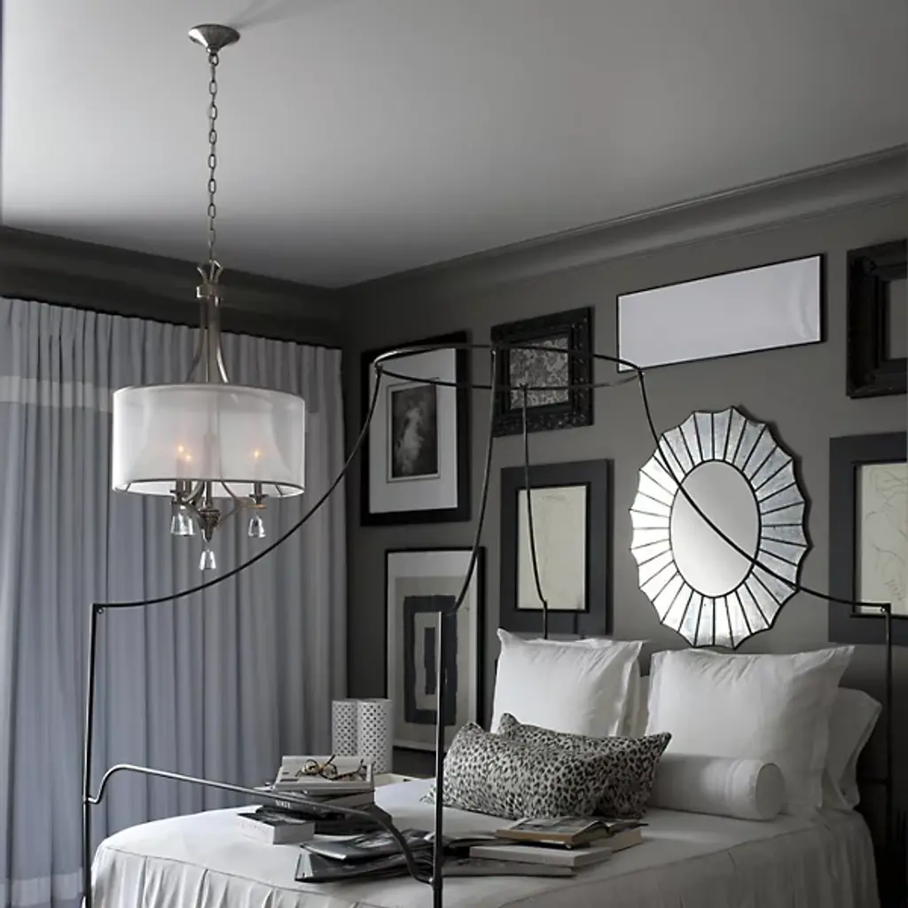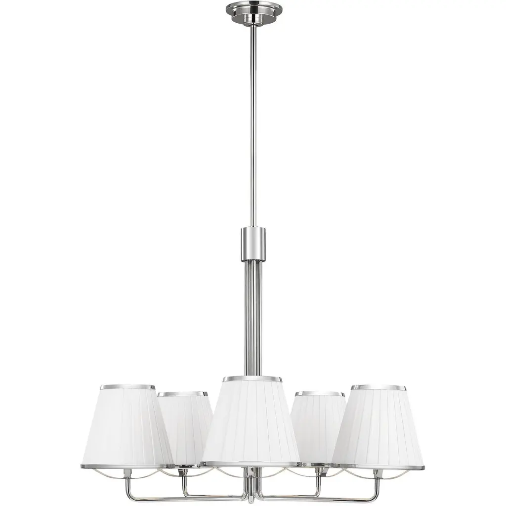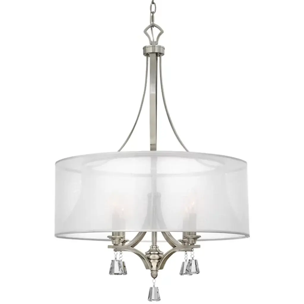 Exquisite lines and tasteful finishes comprise the simple, feminine elegance of the Fredrick Ramond Mime Chandelier. A sheer double hard back organza shade encircles the candleholders, giving a coquettish glimpse of the lights inside, while tapered square crystals dangling from the bottom of the fixture add an element of sparkle.