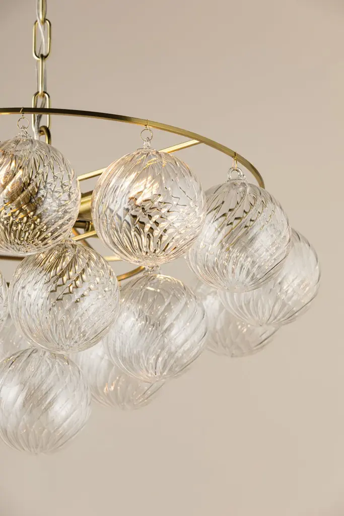 Swirl-ribbed or plated champagne glass globes dangle from an Aged Brass frame, creating this cloud-like showstopper. Whether you’re dressing up a breakfast nook with the small chandelier, adding a soft glow to an entryway with the flush mount, or making a glam statement in your dining room with the large chandelier, the possibilities for Mimi are endless. Part of our Megan Molten x Mitzi Tastemakers collection.