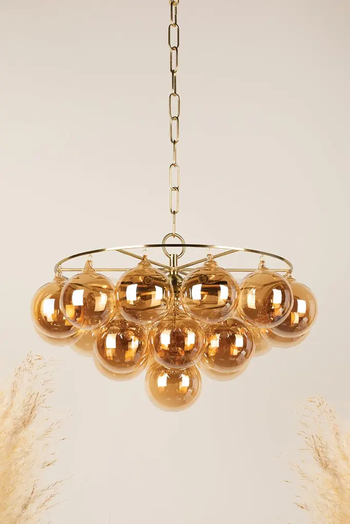 Swirl-ribbed or plated champagne glass globes dangle from an Aged Brass frame, creating this cloud-like showstopper. Whether you’re dressing up a breakfast nook with the small chandelier, adding a soft glow to an entryway with the flush mount, or making a glam statement in your dining room with the large chandelier, the possibilities for Mimi are endless. Part of our Megan Molten x Mitzi Tastemakers collection.