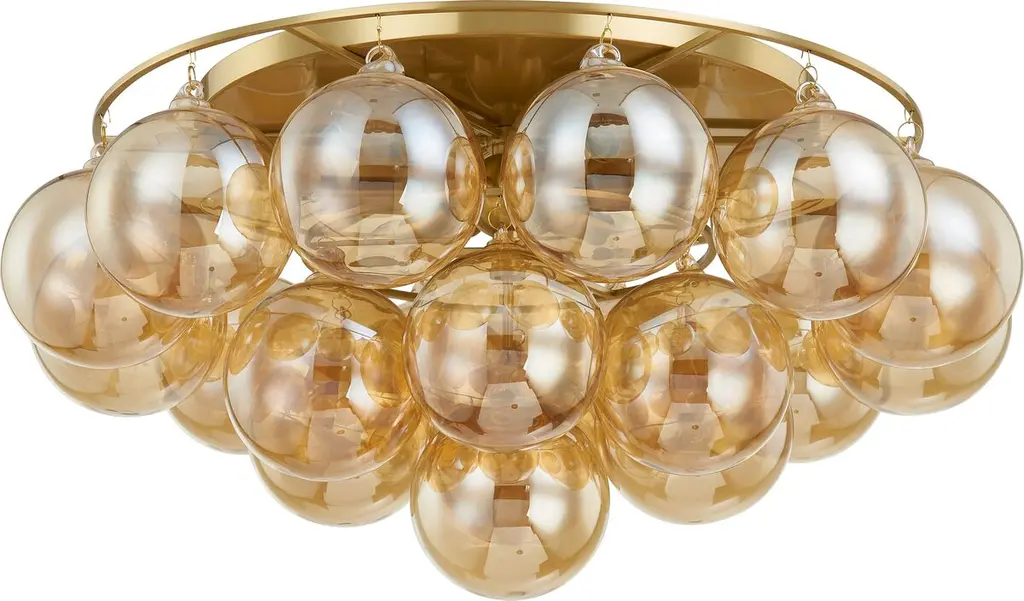 Swirl-ribbed or plated champagne glass globes dangle from an Aged Brass frame, creating this cloud-like showstopper. Whether you’re dressing up a breakfast nook with the small chandelier, adding a soft glow to an entryway with the flush mount, or making a glam statement in your dining room with the large chandelier, the possibilities for Mimi are endless. Part of our Megan Molten x Mitzi Tastemakers collection.