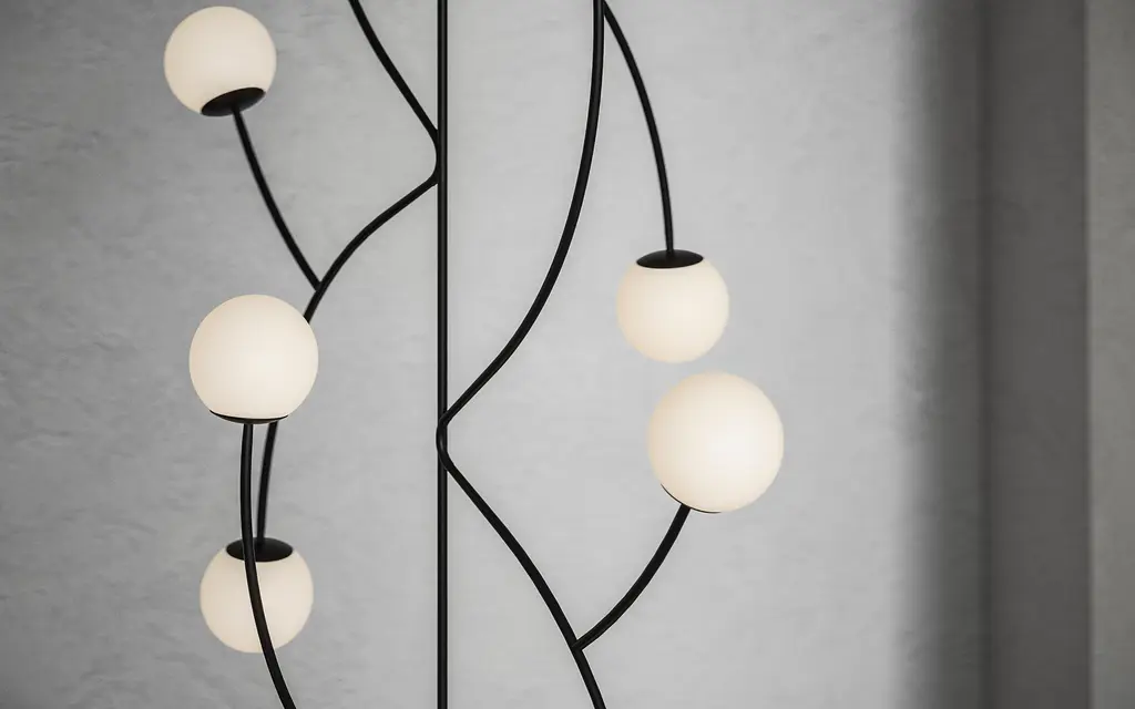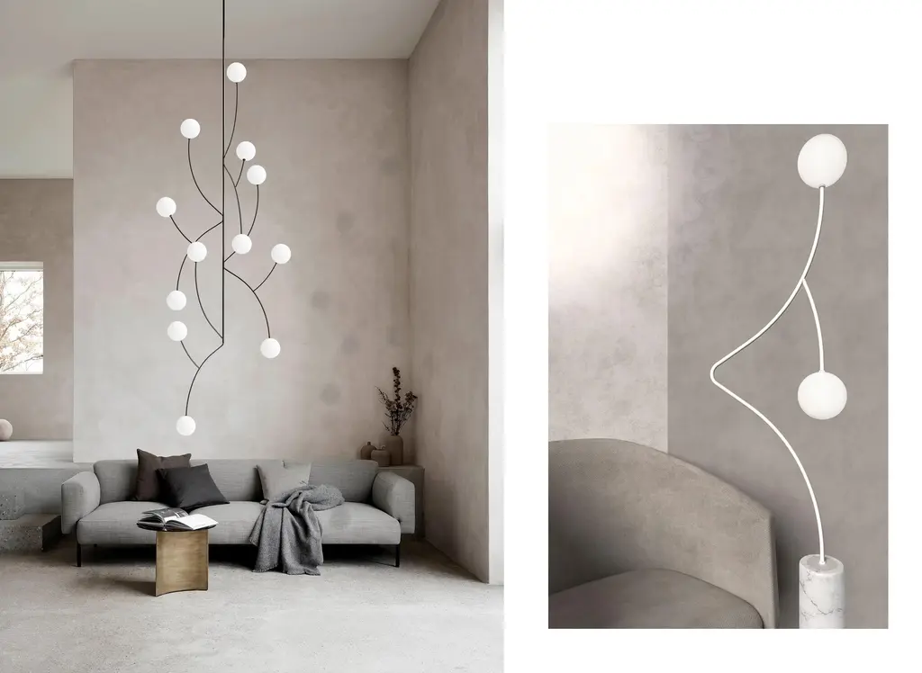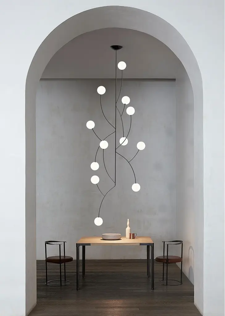 ZUSTRICH - A Masterpiece of Modern Designer Lighting where each architectural pendant light becomes a floating constellation in your space. This luxury chandelier transforms any interior with its sculptural composition of illuminated spheres that seem to dance through the air, creating an artistic lighting installation that captivates and inspires. The contemporary lighting design seamlessly merges minimalist aesthetics with statement lighting artistry. Each custom light fixture features gracefully intertwined steel rods supporting delicate frosted glass orbs, providing perfect ambient illumination. As a premium bespoke lighting solution, this modern chandelier creates an enchanting atmosphere in high-ceiling spaces, making it ideal for luxury residential lighting and upscale commercial interiors. Whether suspended above a modern dining table or gracing a hotel lobby, the decorative chandelier becomes a focal point of sophisticated interior design. The artistic lighting fixture harmoniously combines form and function, making it perfect for both residential lighting projects and commercial lighting installations. TECHNICAL SPECIFICATIONS: Large pendant: 2000 x 800 mm (78.7 x 31.4 inch) Premium materials: Steel rods, frosted glass, textile cable Light source: G9, 110-220V Customizable wiring for international specifications Each architectural light fixture is meticulously handcrafted to order, ensuring exceptional quality and attention to detail.