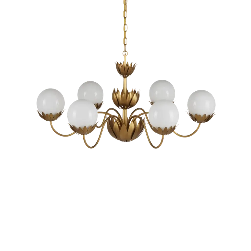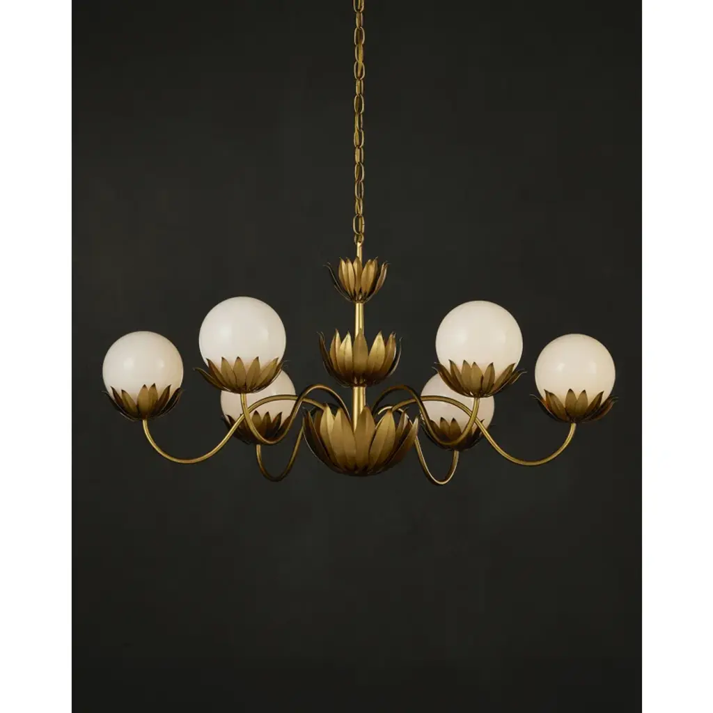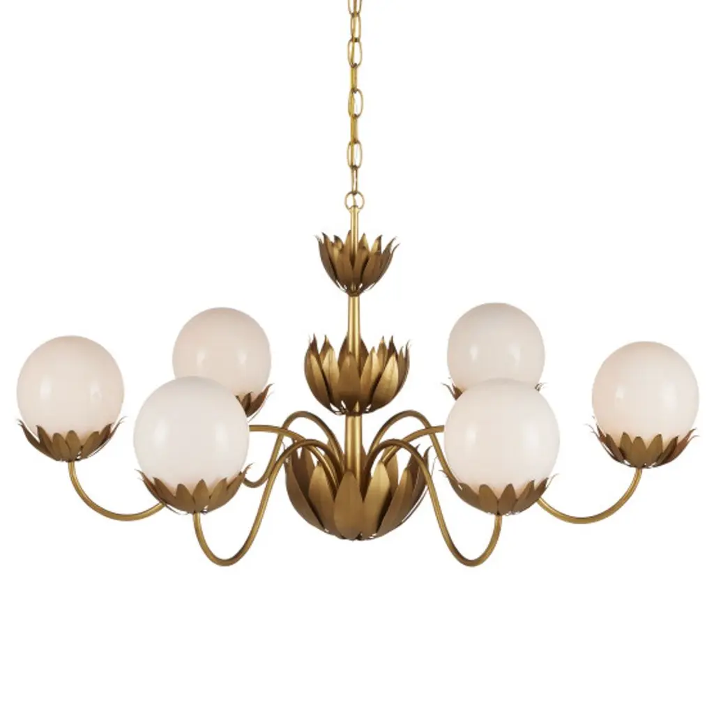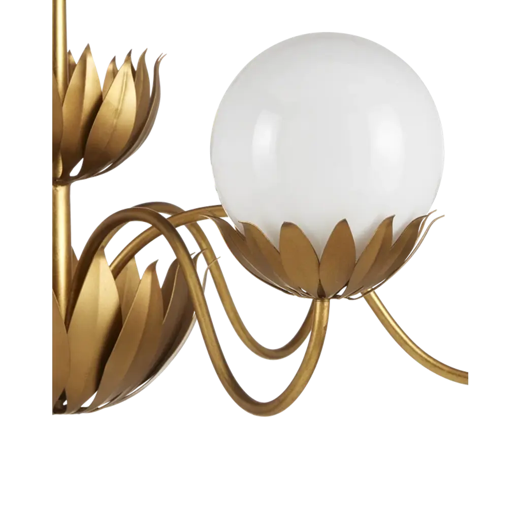 When he designed the Mirasole gold chandelier, Tom Caldwell was feeling nostalgic, remembering the décor of ice cream parlors that were staples at one time in America. The milky glass globes are supported on shapely stems in a contemporary gold leaf finish and ornamented with fluted leaf patterns in a darker gold finish to add interest. The globes on the fixture glow brightly when the lights are switched on; the illumination brings the rich brass finish a high sheen.