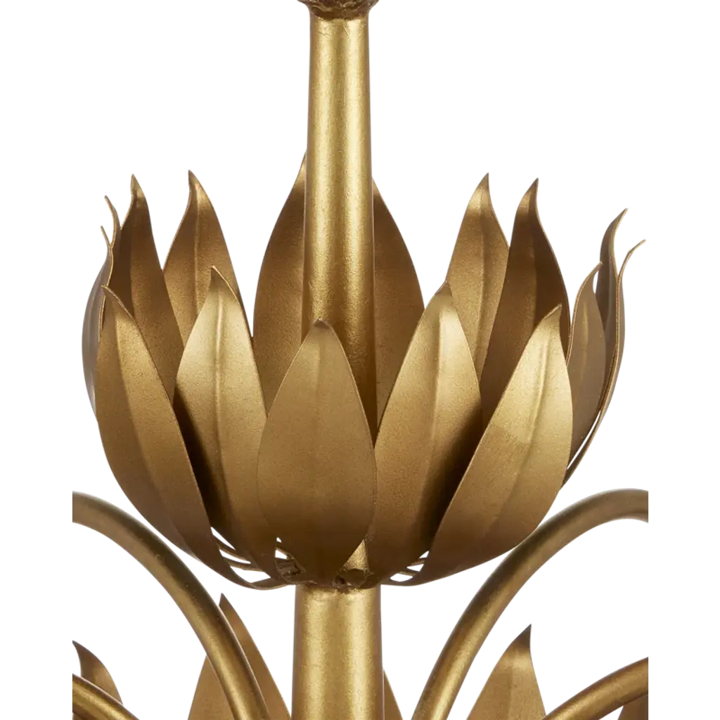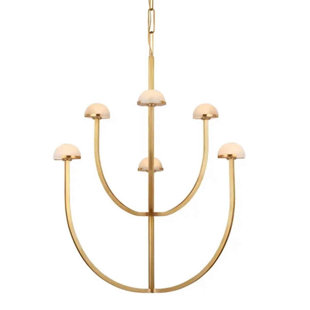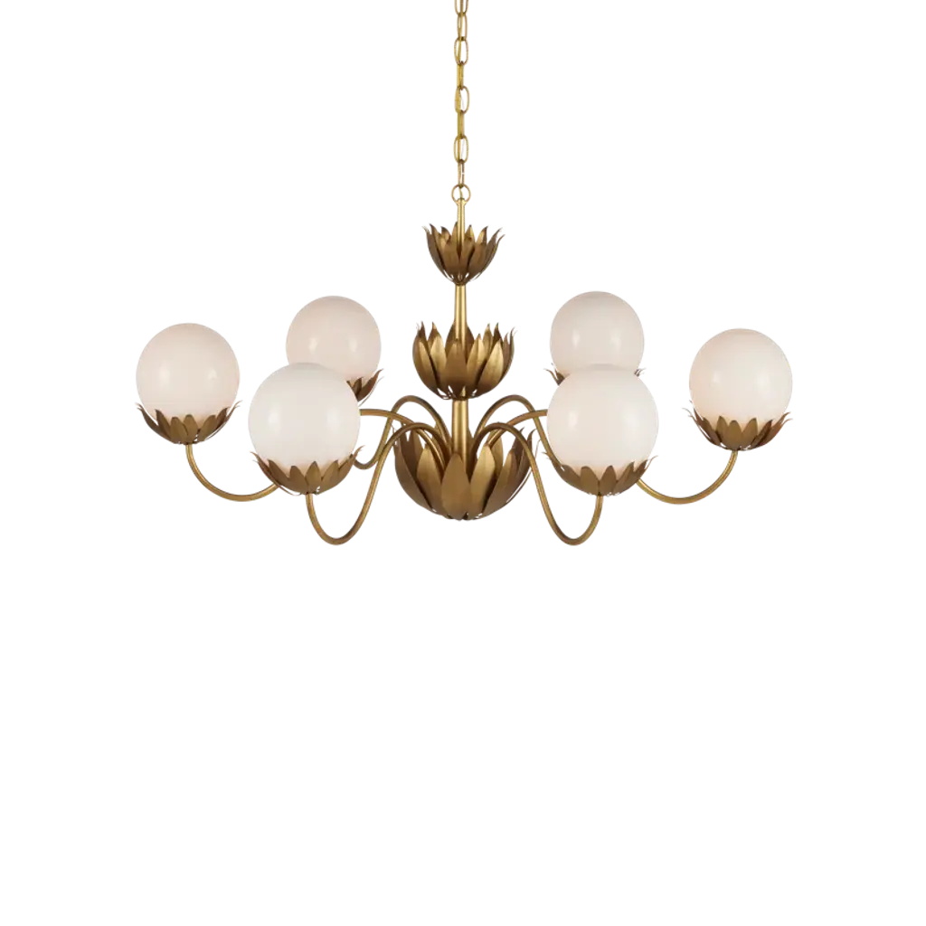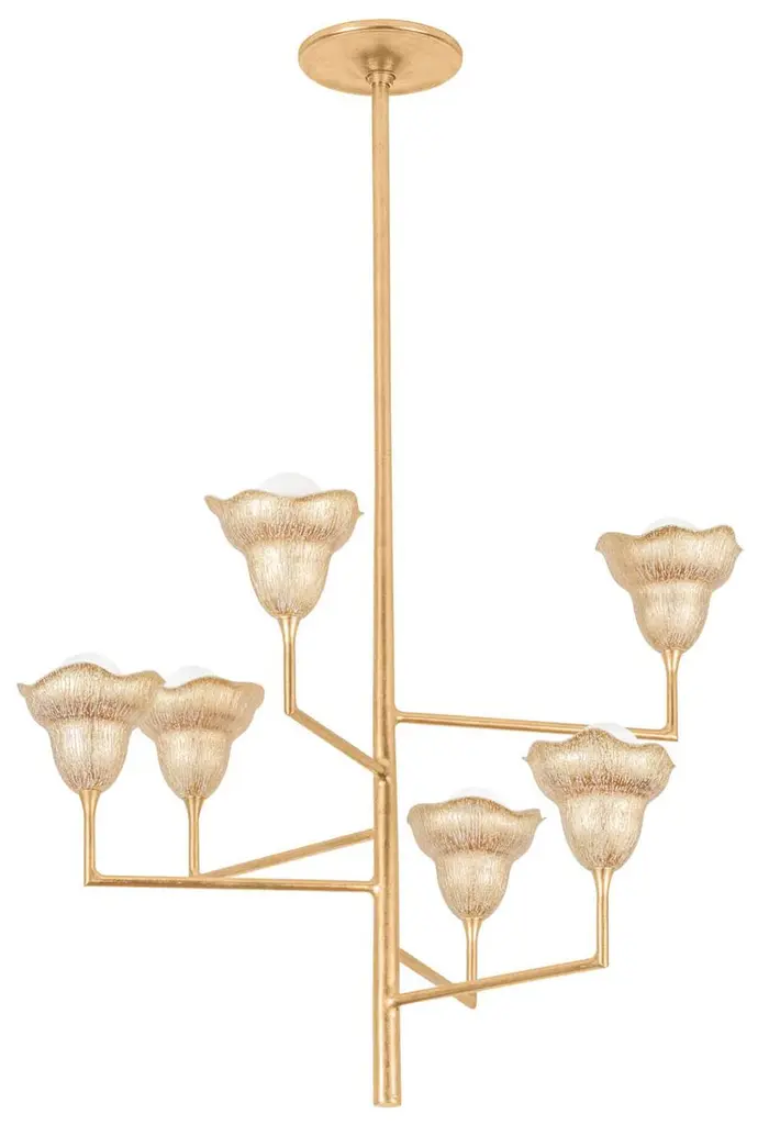 When he designed the Mirasole gold chandelier, Tom Caldwell was feeling nostalgic, remembering the décor of ice cream parlors that were staples at one time in America. The milky glass globes are supported on shapely stems in a contemporary gold leaf finish and ornamented with fluted leaf patterns in a darker gold finish to add interest. The globes on the fixture glow brightly when the lights are switched on; the illumination brings the rich brass finish a high sheen.