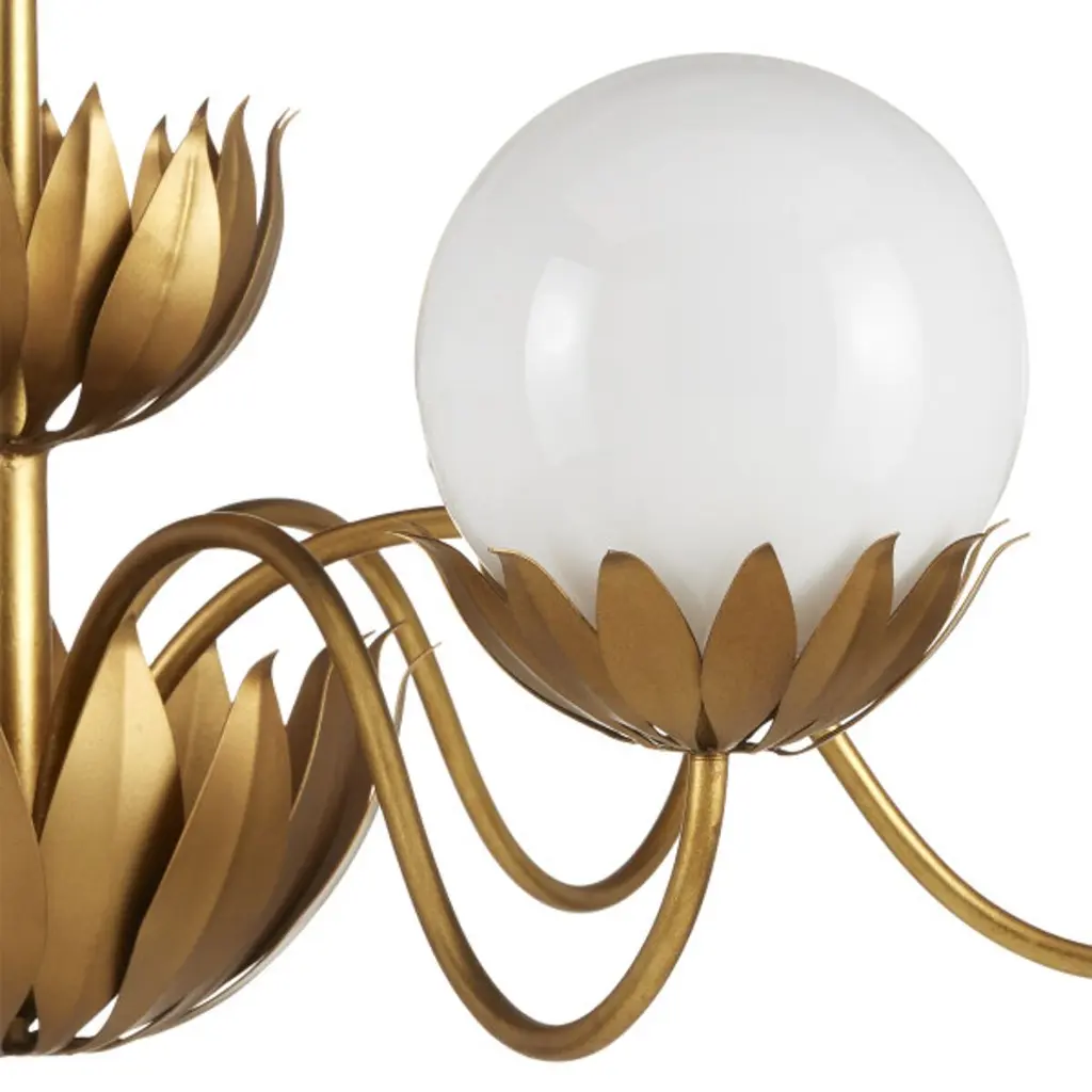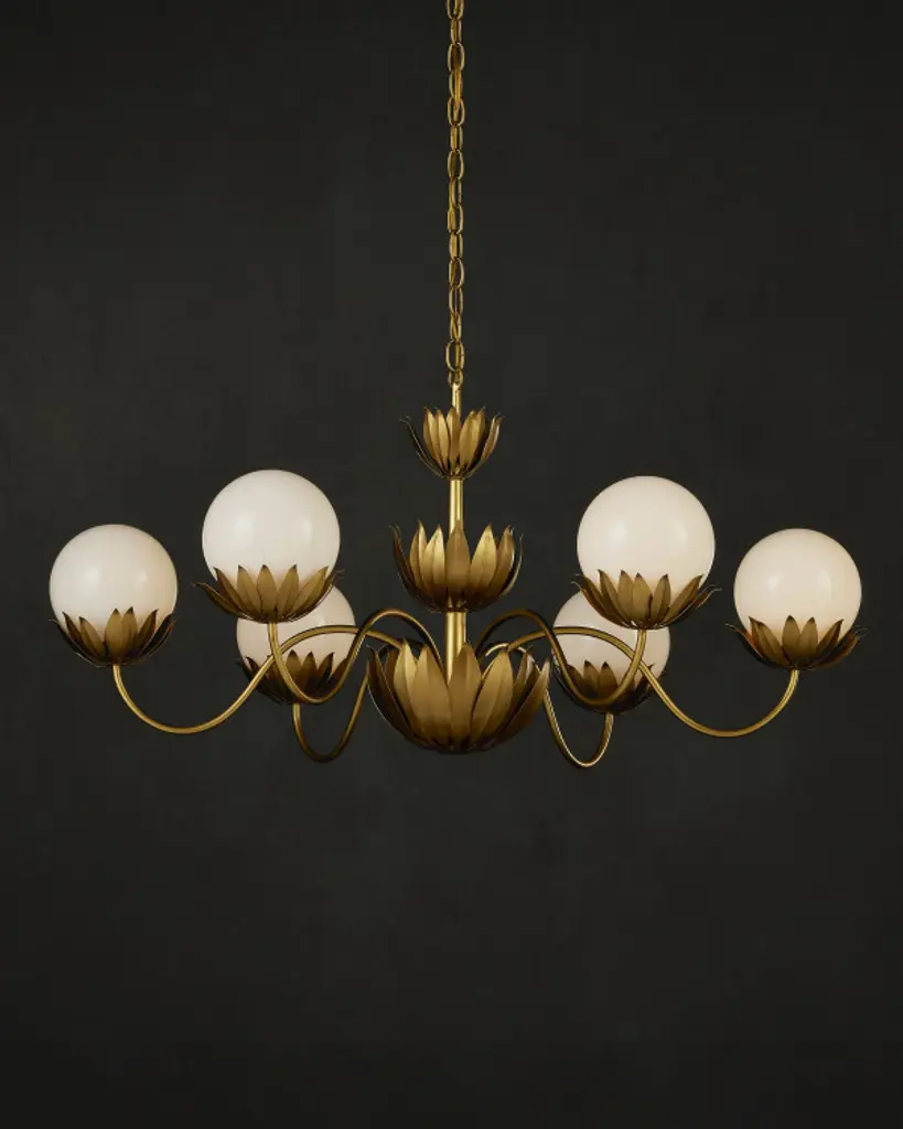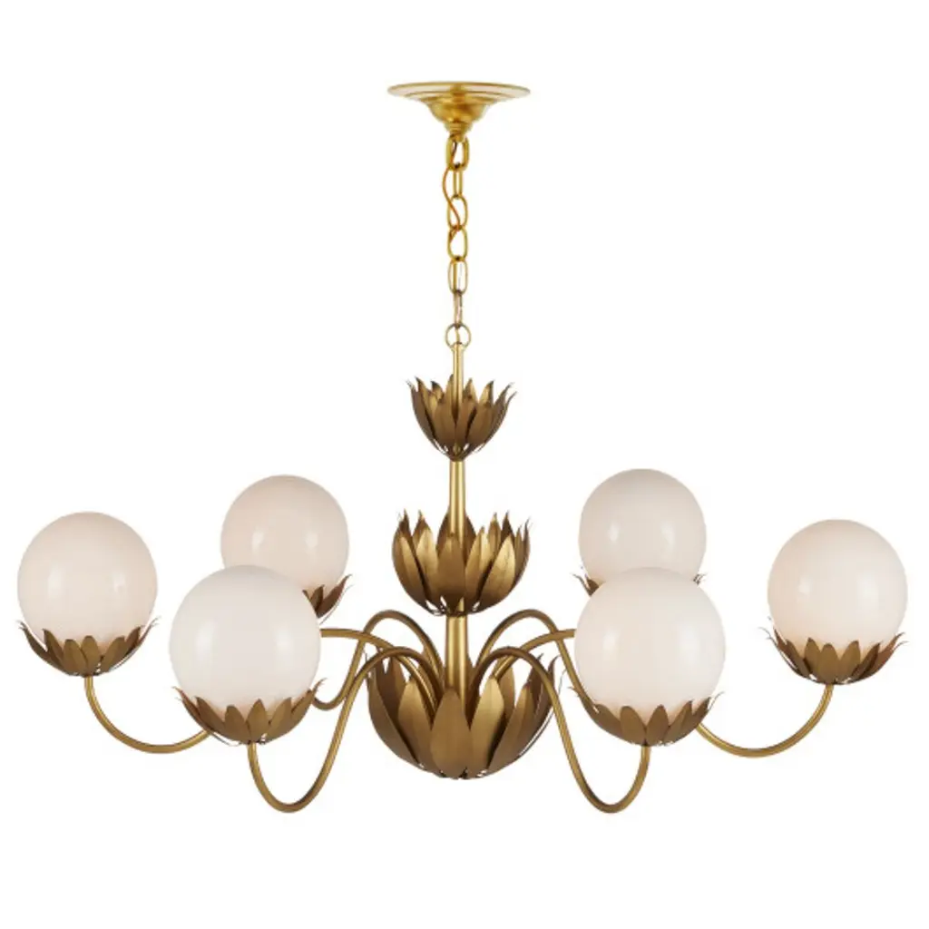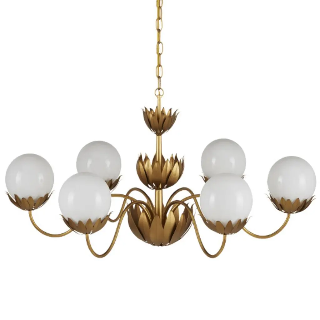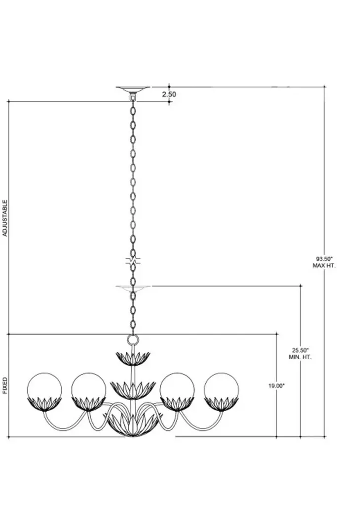 The design of the Mirasole Chandelier was inspired by nostalgia, recalling the décor of ice cream parlors that were once staples in America. The milky glass globes are supported on shapely stems in a contemporary finish and ornamented with fluted leaf patterns to add interest. The globes on the fixture glow brightly when the lights are switched on, the illumination bringing the finish a high sheen. Adjustable from 25.5" to 93.5" with use of included chain/rod kit/cable.