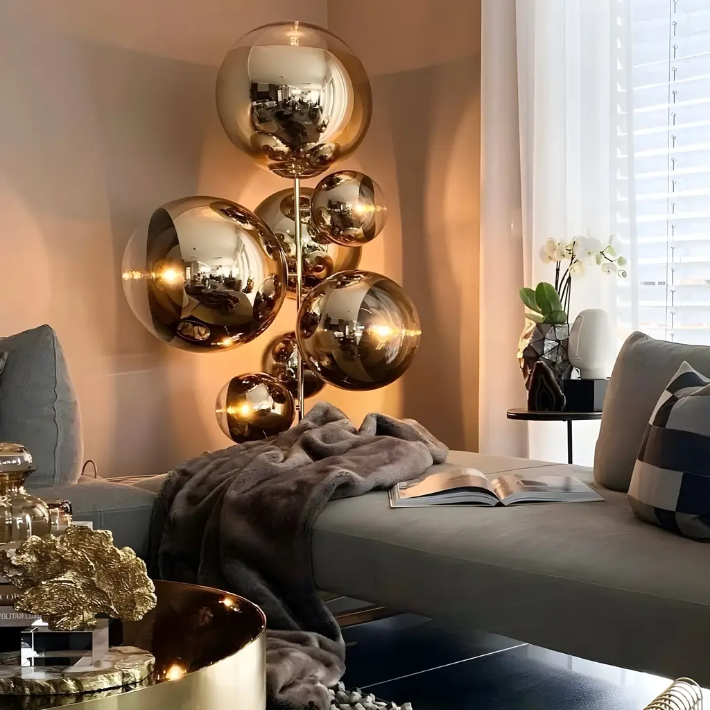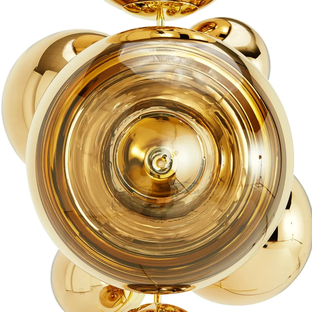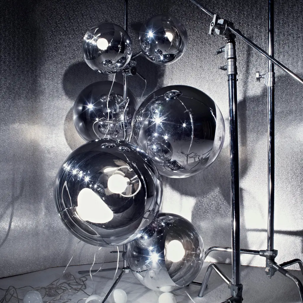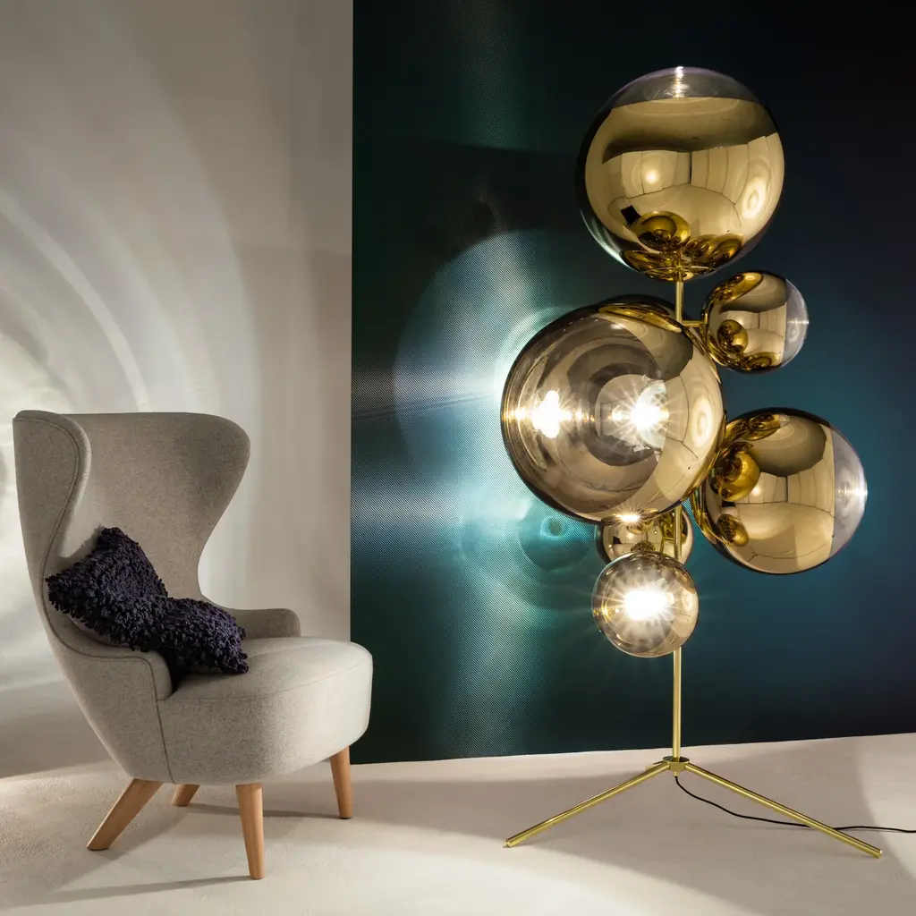 Even if they lack a room with a high ceiling, disco fans and space-age aficionados can get their fix with Tom Dixon's standing version of his Mirror Ball Chandelier. Available in gold-tone or the original silvery chrome, the chandelier's individual metallic shades each focus the light and project the warm illumination outward though its clear face. Mounted on a tripod, the reflective assemblage contains 7 of the designer's gleaming globe lights in a mix of sizes for maxing out the radiant ambiance.