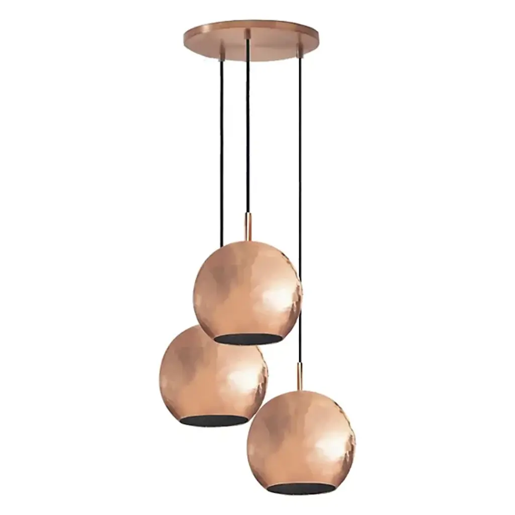 The Mishal Multi-Globe Chandelier from Dounia Home offers an elegant artisanal accent to inside ceilings. A slim circle canopy suspends the fixture, sending slim cables down to strong lamps inside spherical shades. Each spherical shade is hand-hammered in Morocco, showing off tiny imperfections and signature character. The shades are layered at different heights and encompass the strong lamping, with open bases that dispense columns of focused downlight accented by radiant reflections.
