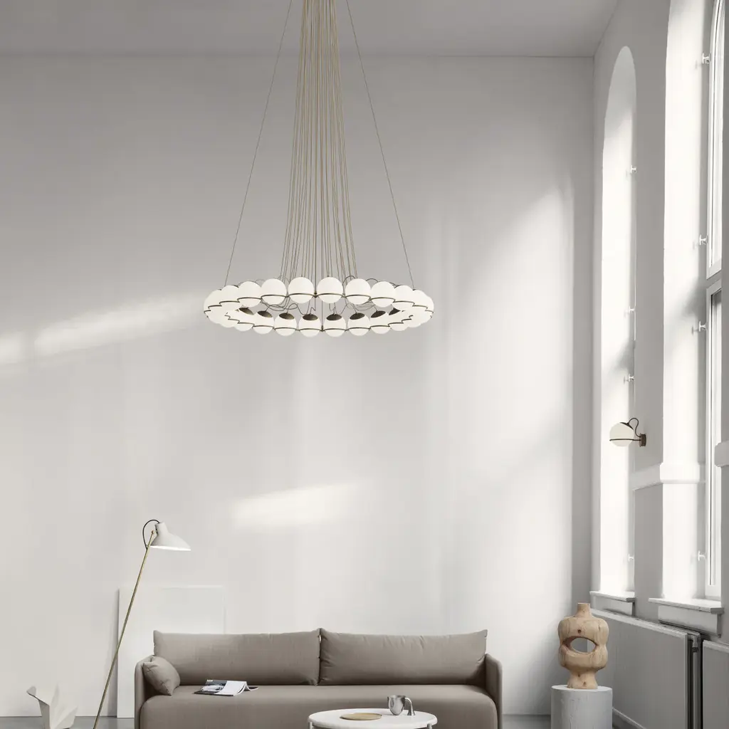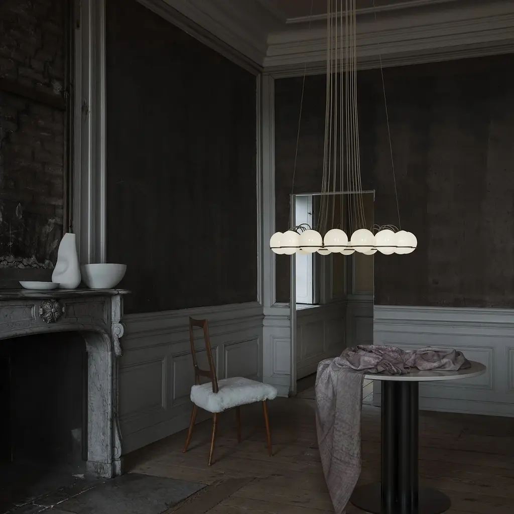 Introduce a touch of sophistication to your space with the Model 2109 Small Chandelier from Astep. Featuring a circular arrangement of blown glass spheres held by a painted steel radial ring, each shade can be adjusted for direct or indirect lighting. Available in multiple sizes to make a stunning impact, this chandelier is ideal for highlighting dining room tables, bedrooms, and entryway vignettes. Highlights