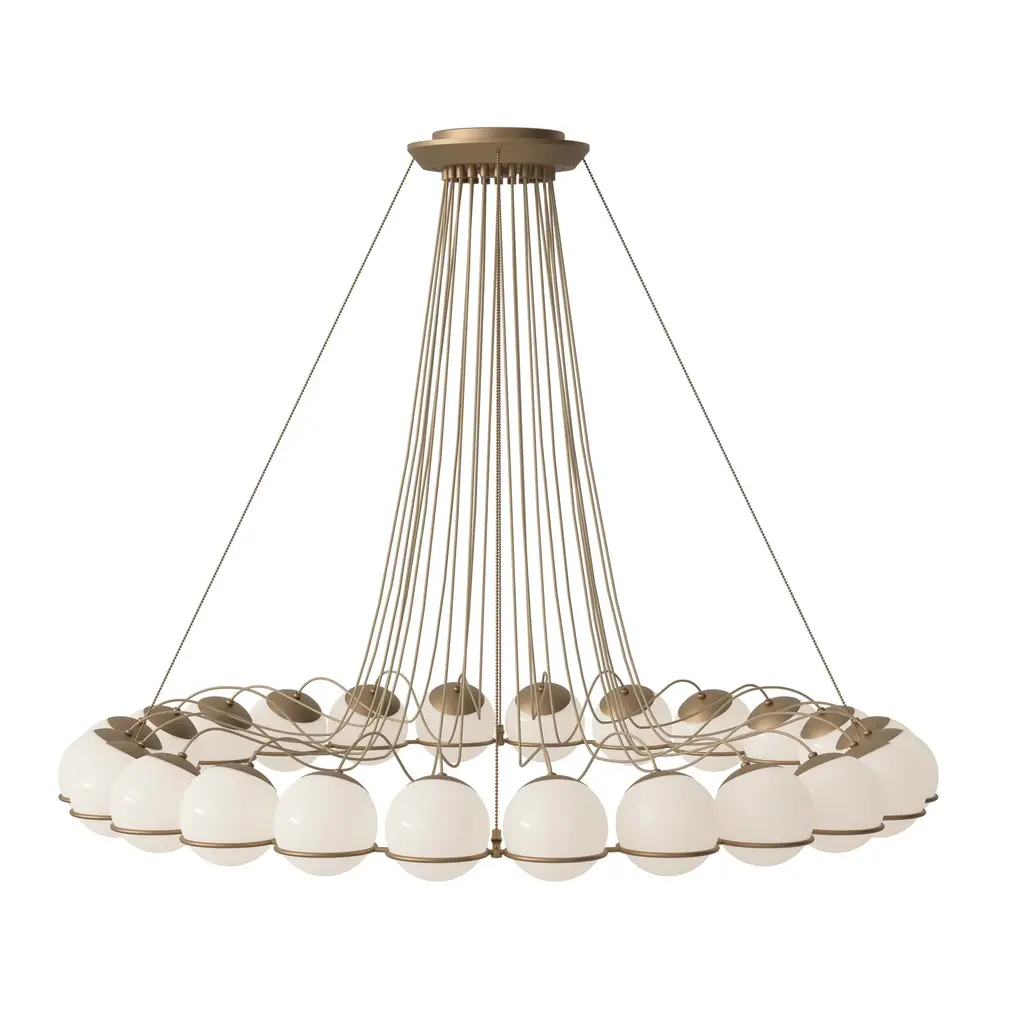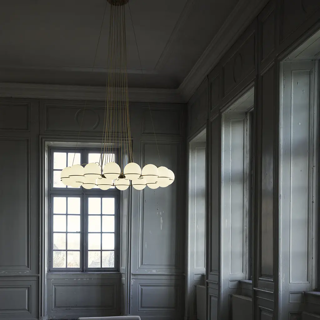 Introduce a touch of sophistication to your space with the Model 2109 Small Chandelier from Astep. Featuring a circular arrangement of blown glass spheres held by a painted steel radial ring, each shade can be adjusted for direct or indirect lighting. Available in multiple sizes to make a stunning impact, this chandelier is ideal for highlighting dining room tables, bedrooms, and entryway vignettes. Highlights