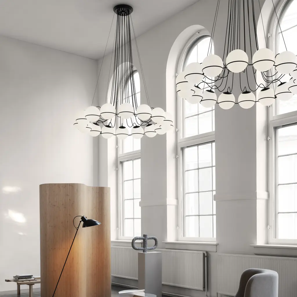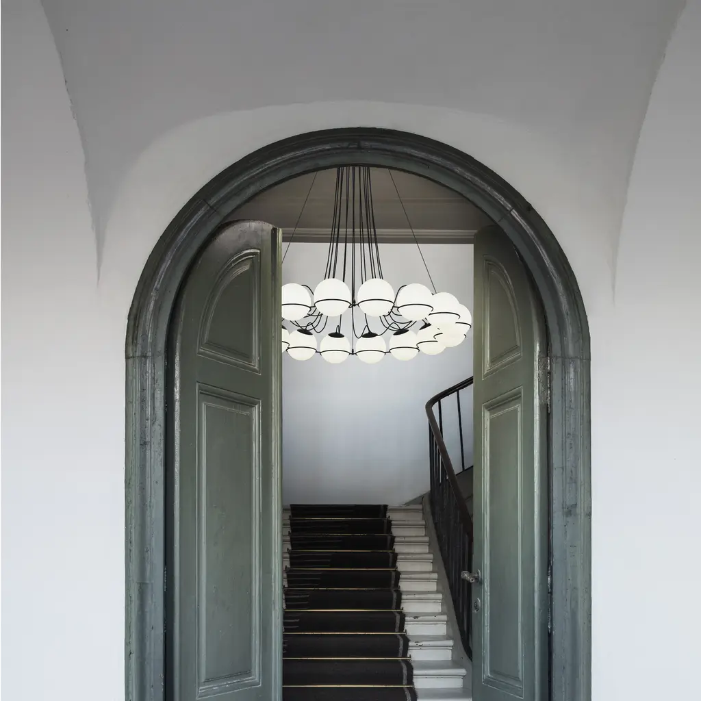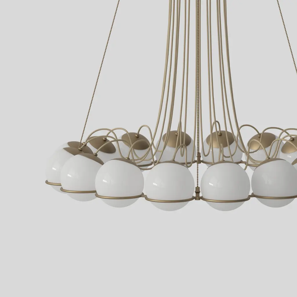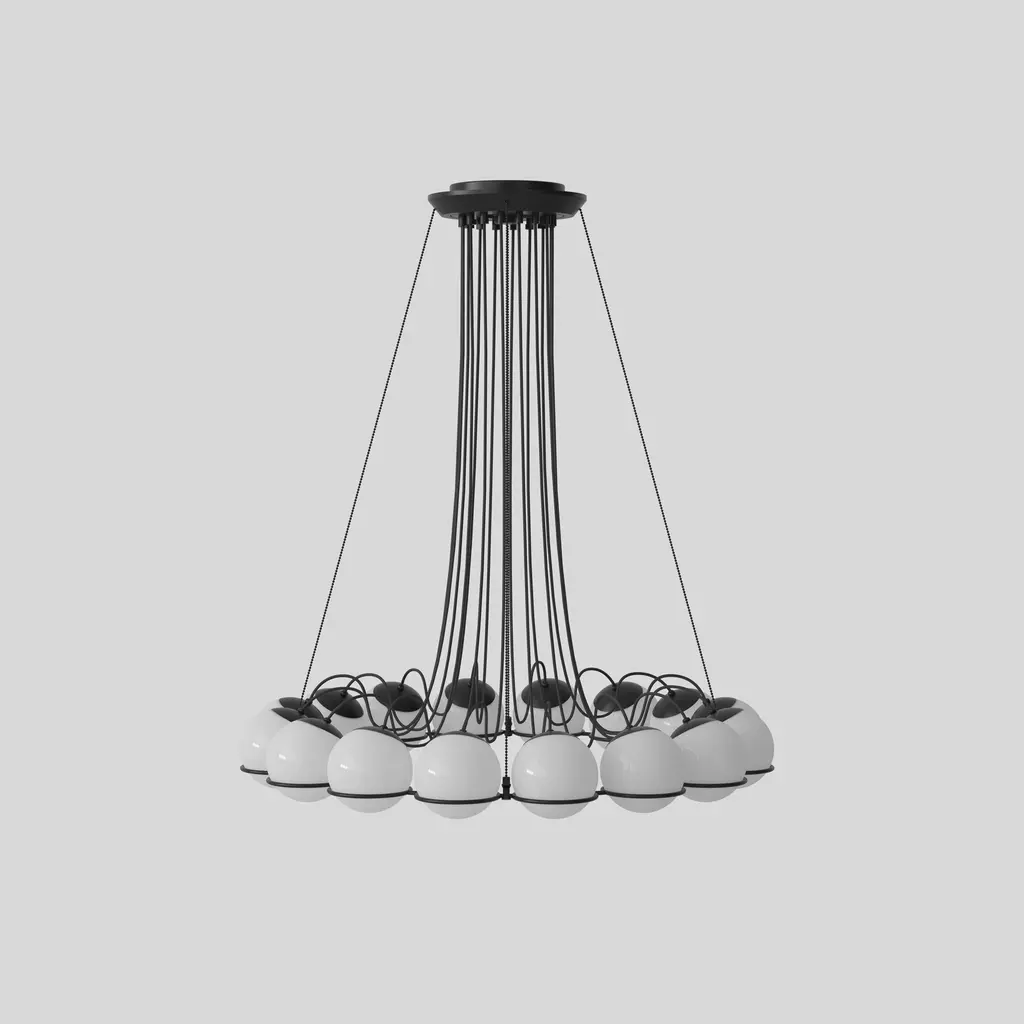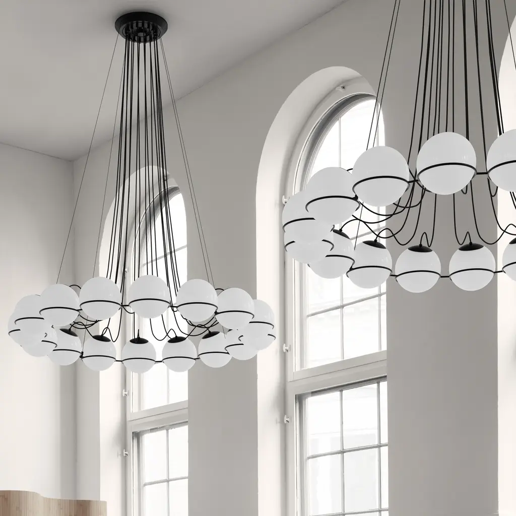 The Le Sfere Chandelier presents a striking composition, featuring a circular arrangement of hand-blown opaline glass spheres. Anchored by a substantial radial ring structure crafted from painted steel in Black or Champagne finishes, each sphere is securely held in place. Versatile in its design, the orientation of the spheres can be adjusted to cast either direct or indirect illumination. The model variations include Model 2109/12/14 and Model 2109/16/14, showcasing 14 cm diameter opaline glass spheres arranged in configurations of fourteen and twelve respectively.