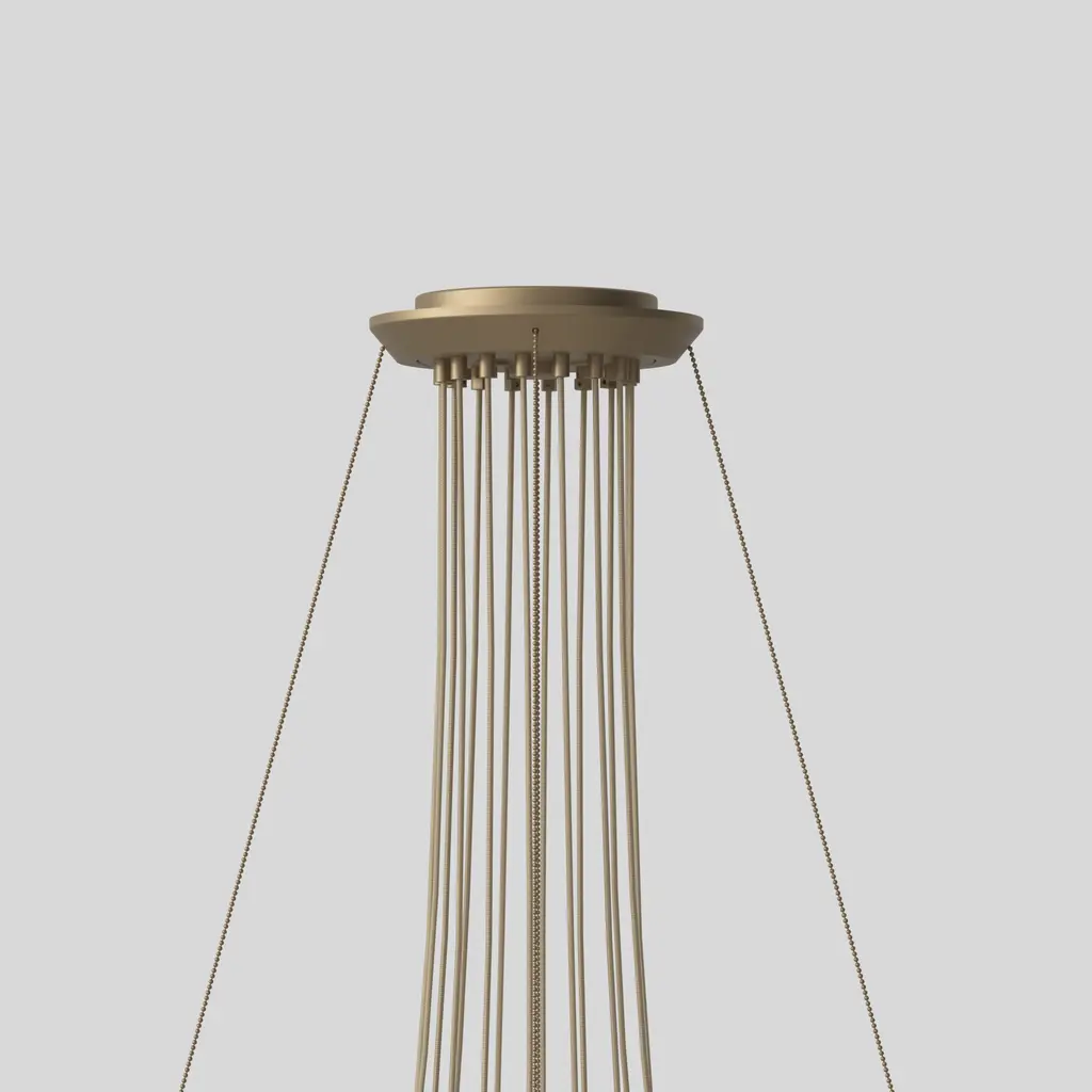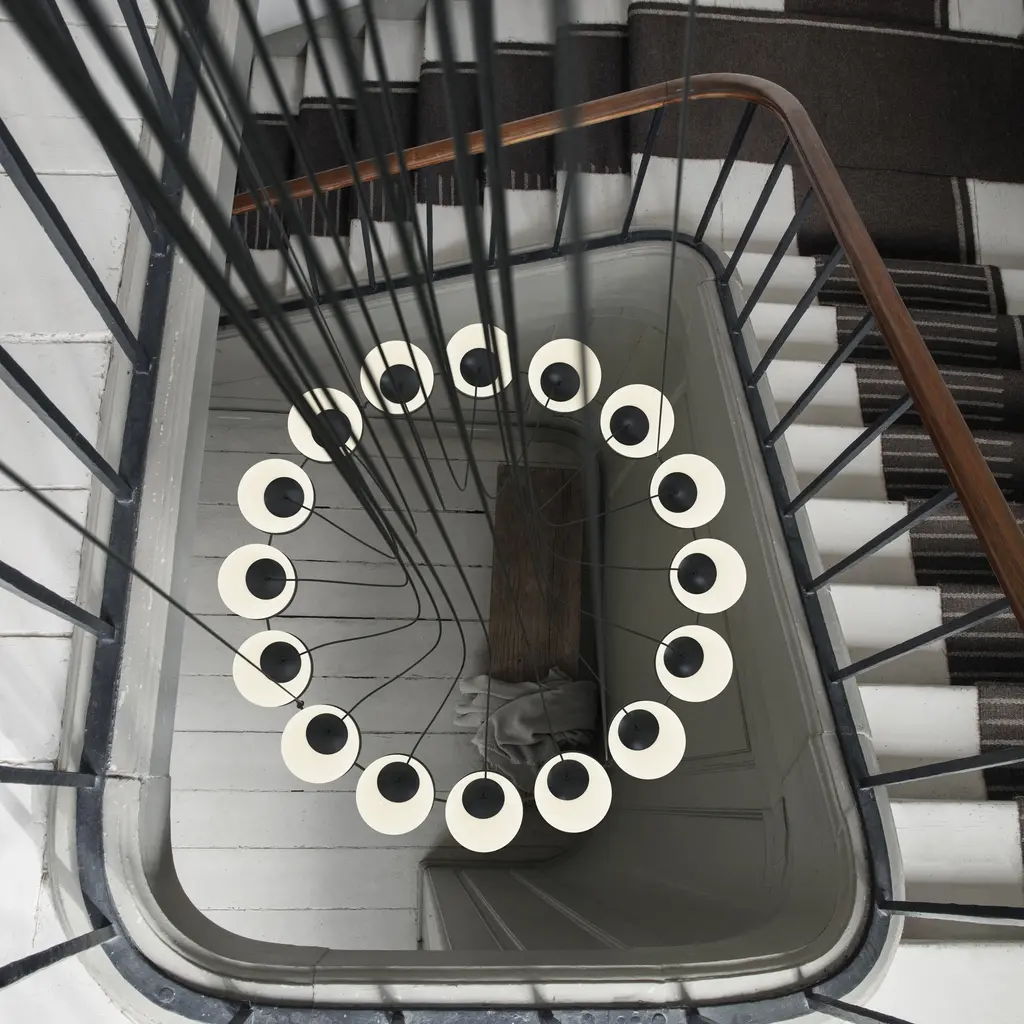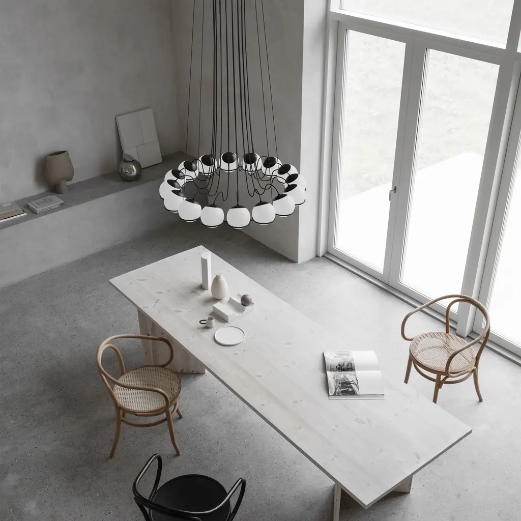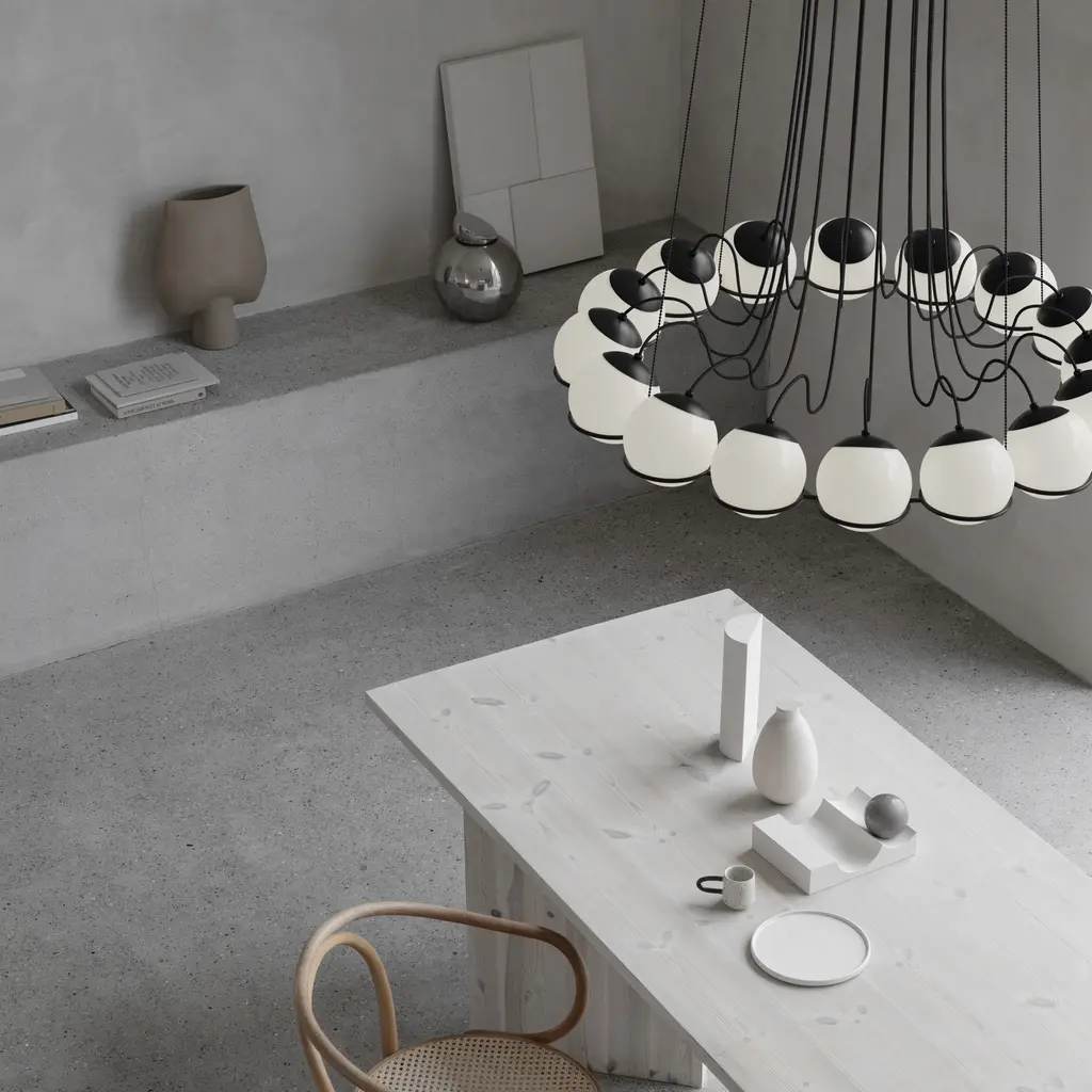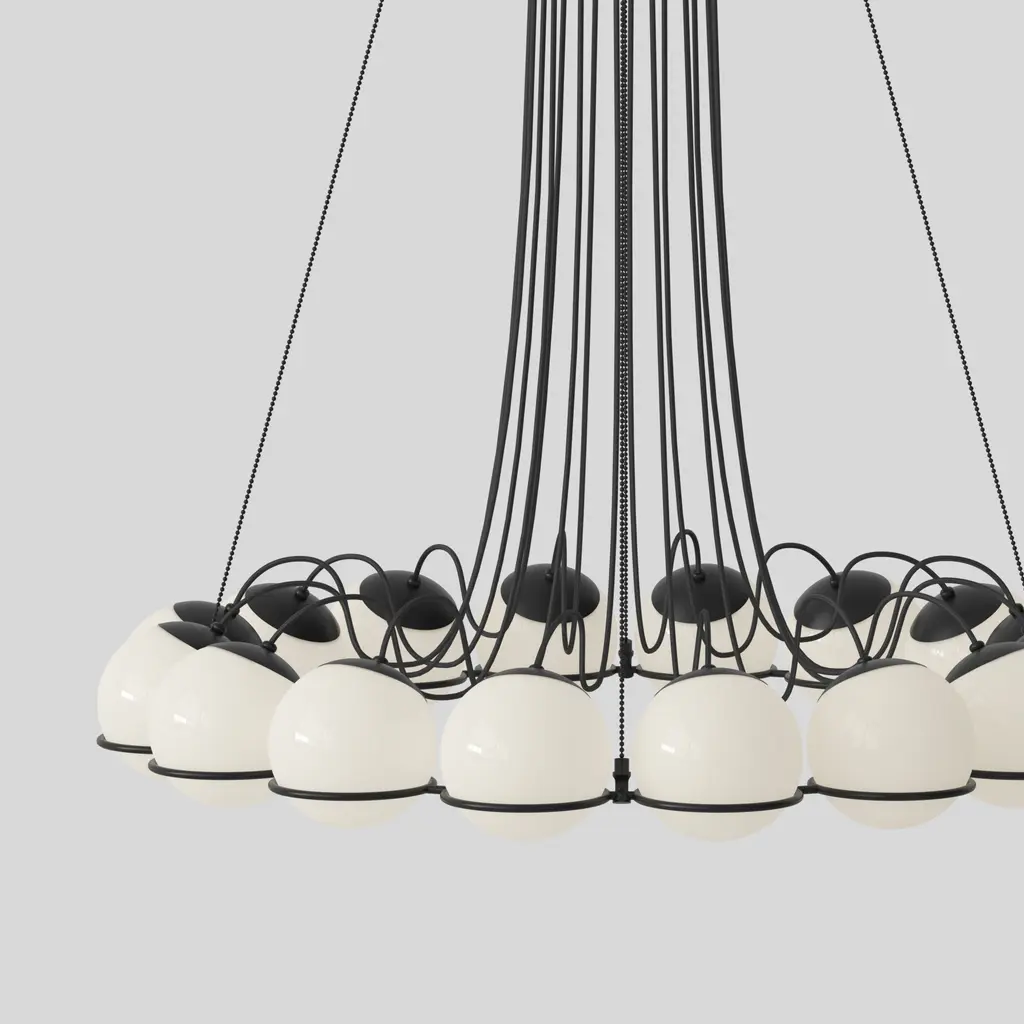 The Le Sfere Chandelier presents a striking composition, featuring a circular arrangement of hand-blown opaline glass spheres. Anchored by a substantial radial ring structure crafted from painted steel in Black or Champagne finishes, each sphere is securely held in place. Versatile in its design, the orientation of the spheres can be adjusted to cast either direct or indirect illumination. The model variations include Model 2109/12/14 and Model 2109/16/14, showcasing 14 cm diameter opaline glass spheres arranged in configurations of fourteen and twelve respectively.