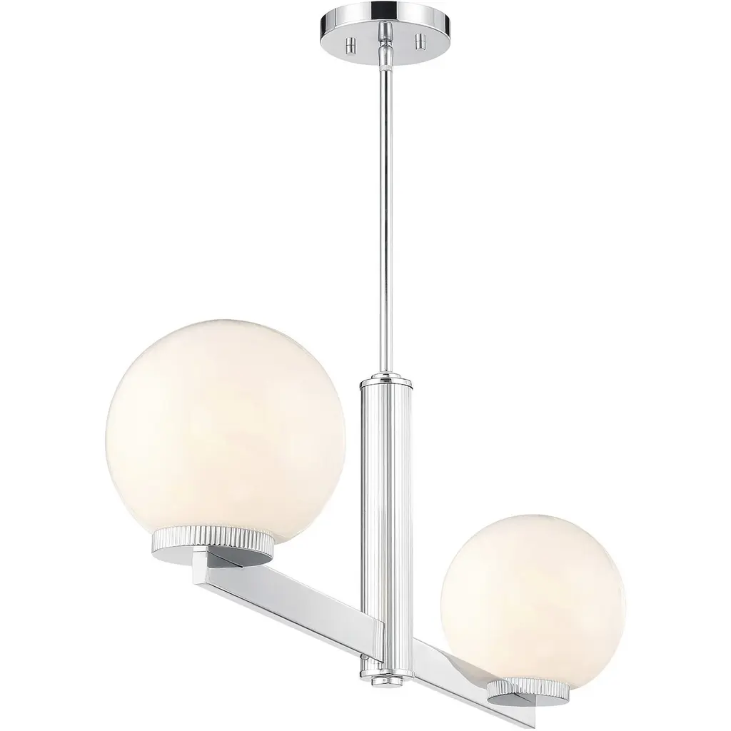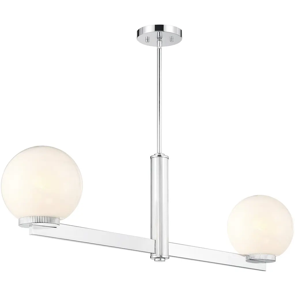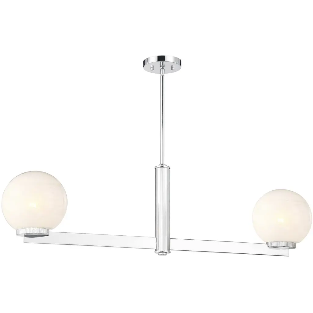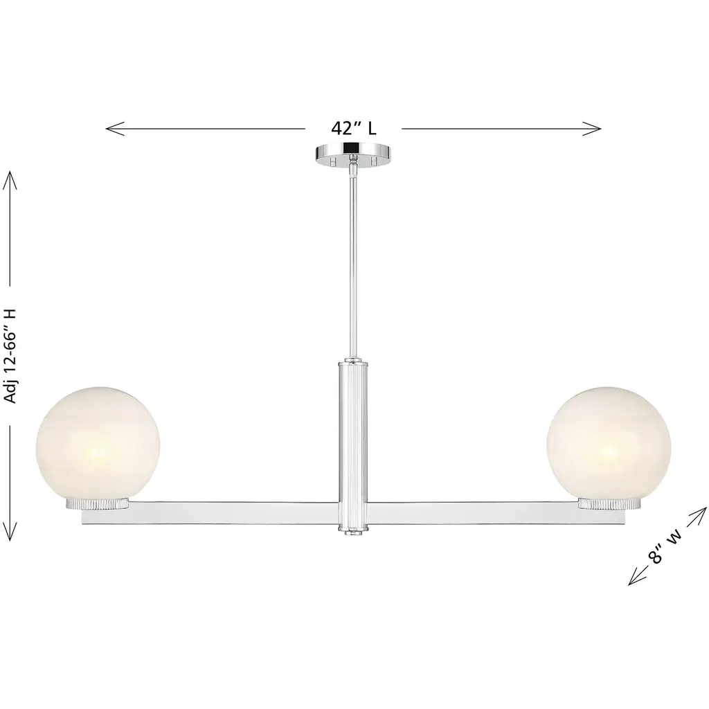This 2-light linear chandelier flaunts a fabulously Art Deco look. The slim, straight arms are each topped with an orb of strie glass featuring dazzling swirls that draw the eye, soften the glow and work beautifully with the Chrome finish. Knurled detailing below each glass shade adds an extra touch of style. This linear chandelier is 42" in length, 8" in width and has an adjustable height ranging from 12" to 66". Comes with four 12" downrods and one 6" downrod. Uses 2 standard size bulbs of up to 60 watts per bulb. Bulbs not included.