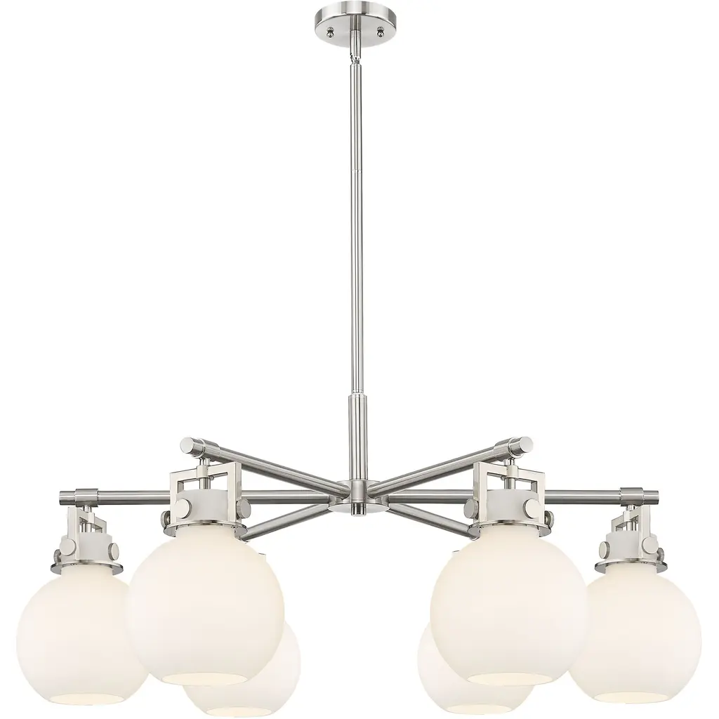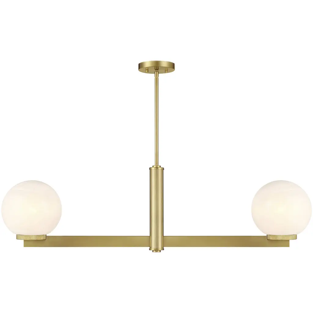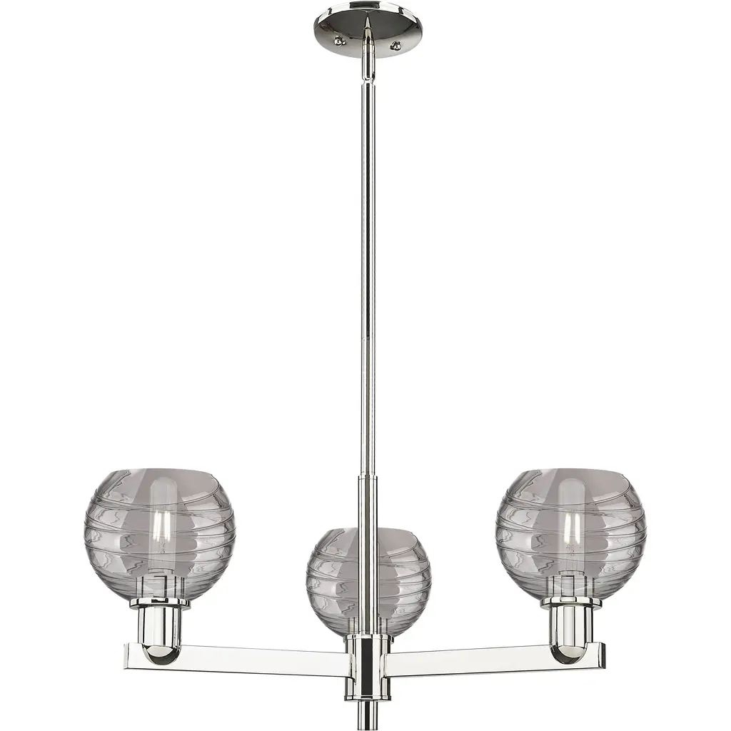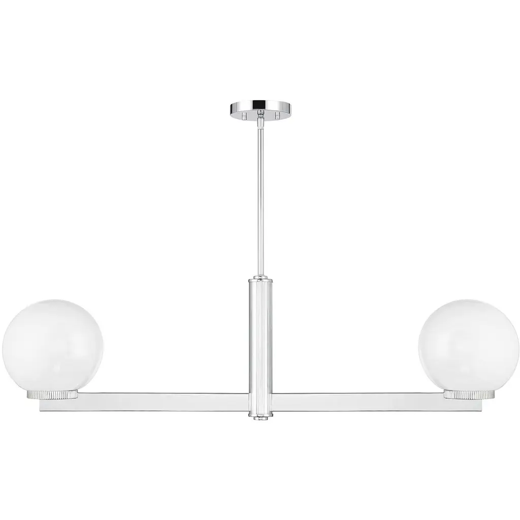This 2-light linear chandelier flaunts a fabulously Art Deco look. The slim, straight arms are each topped with an orb of strie glass featuring dazzling swirls that draw the eye, soften the glow and work beautifully with the Chrome finish. Knurled detailing below each glass shade adds an extra touch of style. This linear chandelier is 42" in length, 8" in width and has an adjustable height ranging from 12" to 66". Comes with four 12" downrods and one 6" downrod. Uses 2 standard size bulbs of up to 60 watts per bulb. Bulbs not included.