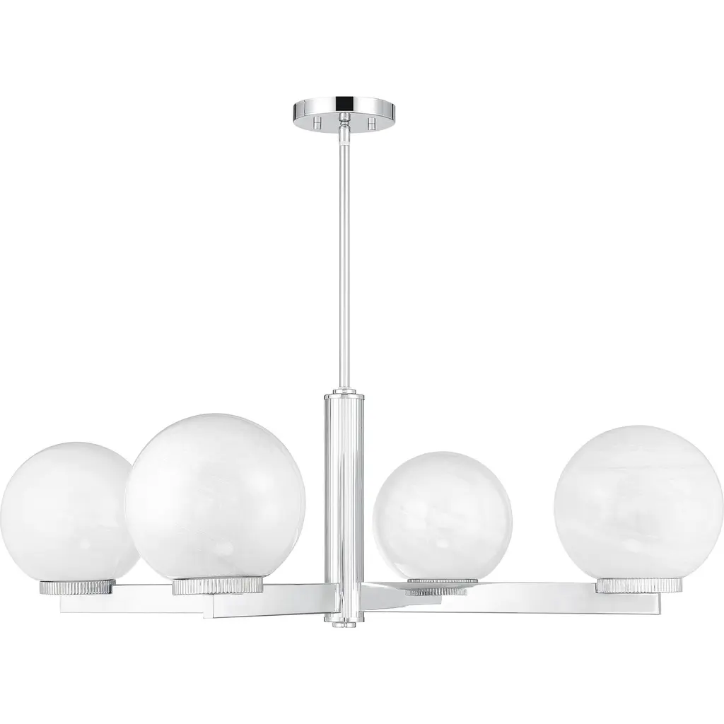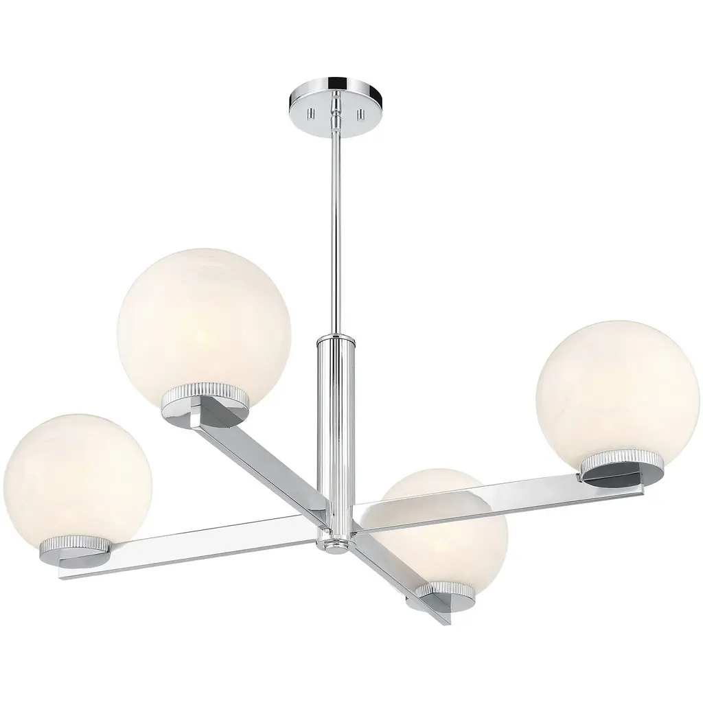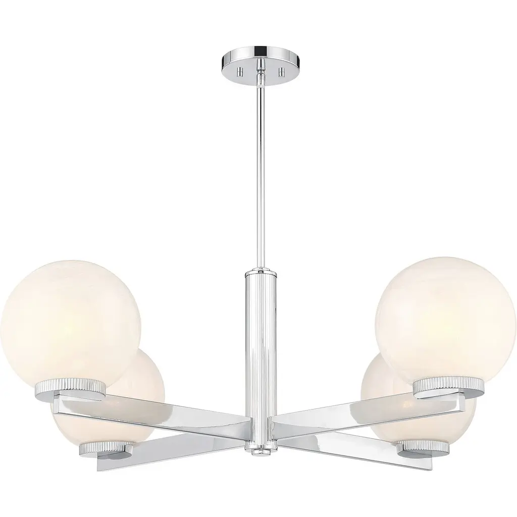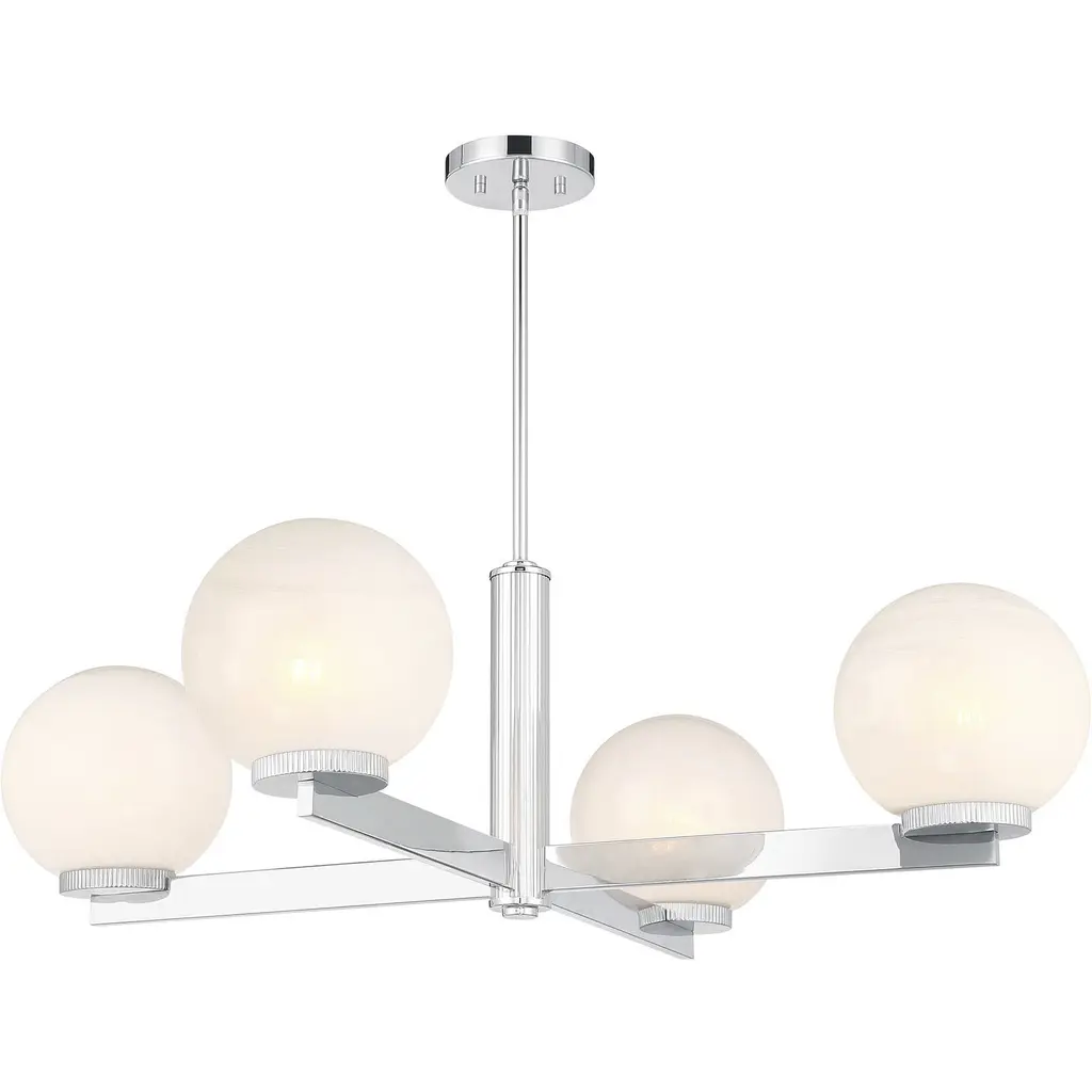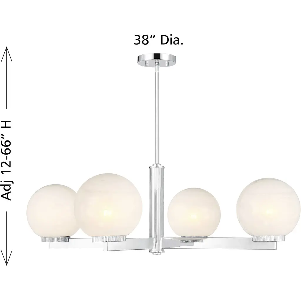 This 4-light chandelier flaunts a fabulously Art Deco look. Each slim, straight arm is topped with an orb of strie glass featuring dazzling swirls that draw the eye, soften the glow and work beautifully with the Chrome finish. Knurled detailing below each glass shade adds an extra touch of style. This chandelier is 38" in width and has an adjustable height ranging from 12" to 66". Comes with four 12" downrods and one 6" downrod. Uses 4 standard size bulbs of up to 60 watts per bulb. Bulbs not included.