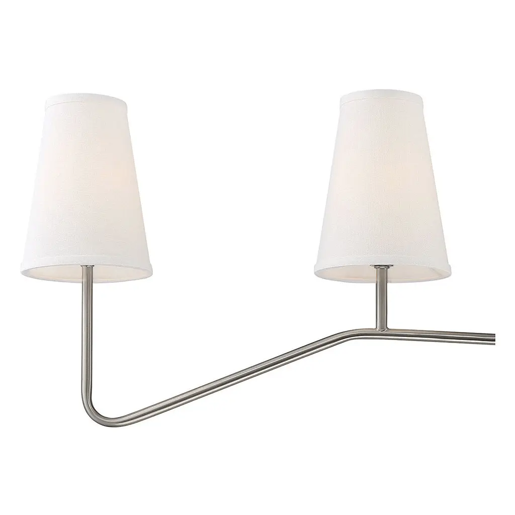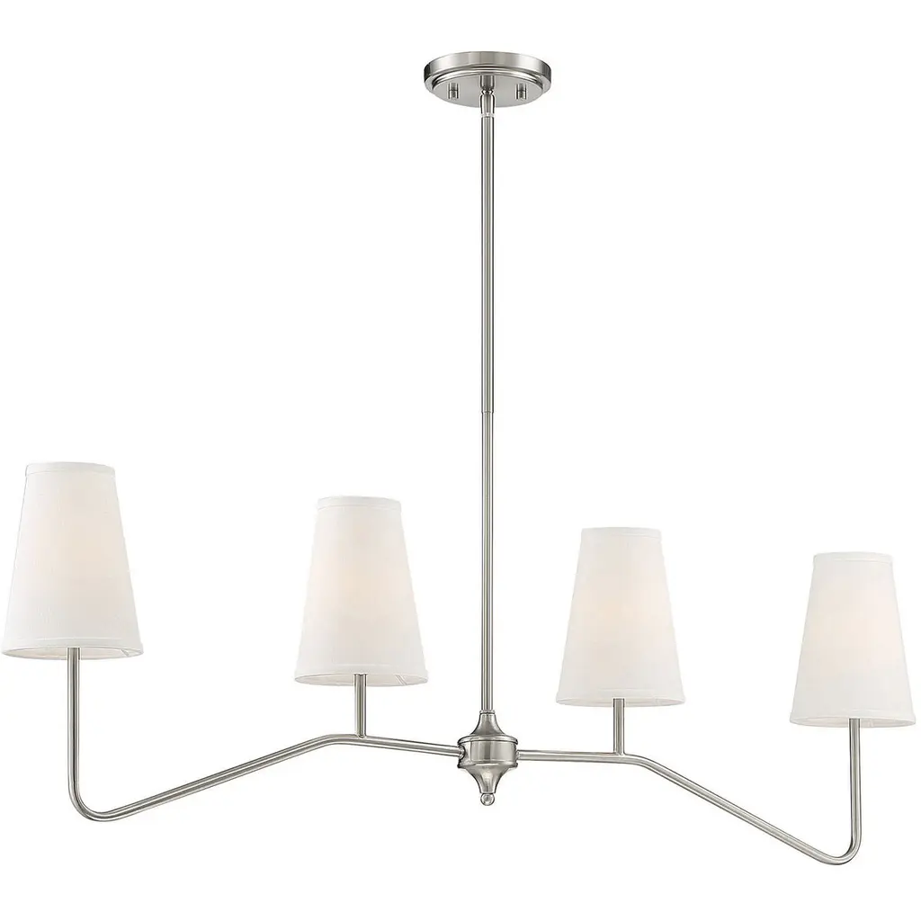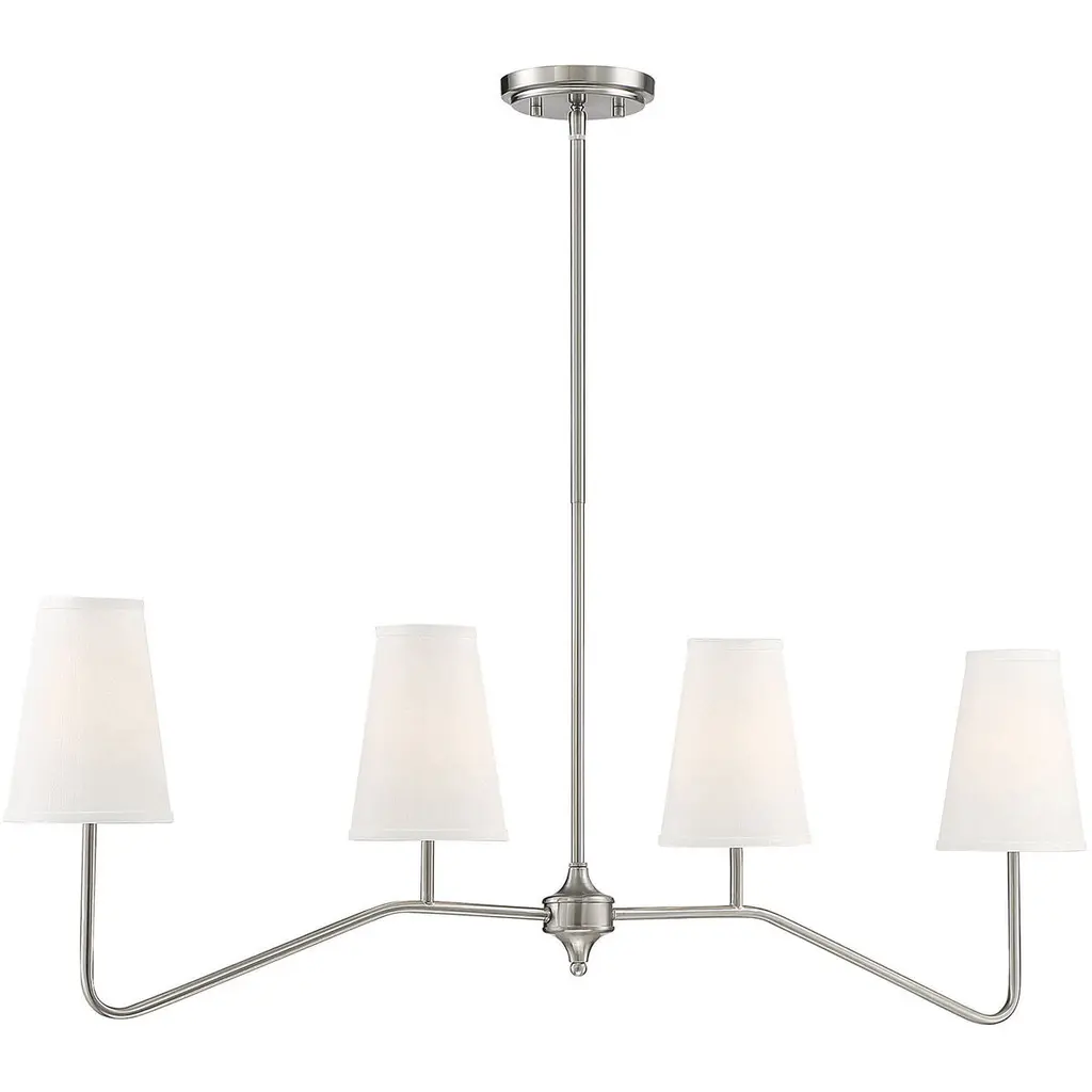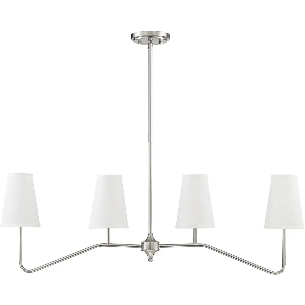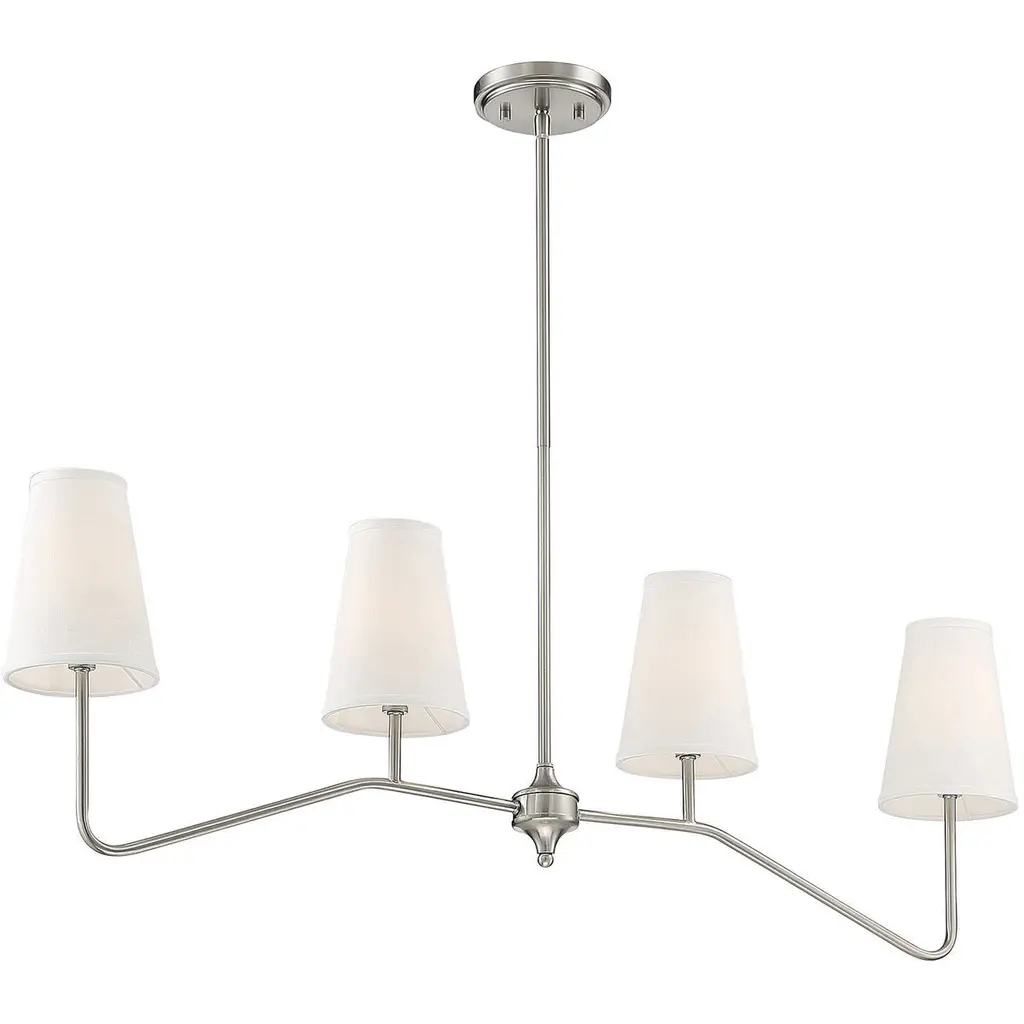 Brighten up a kitchen island or a long dining room table with this Meridian 4-light linear chandelier. It showcases an elegant look that draws inspiration from the days of midcentury modern style, pairing conical shades of white fabric with a brushed nickel finish. It is 13" in height, 40" in length and 5" in width, plus it includes four 12" downrods and one 6" downrod to let you adjust the height for a maximum of 67". This chandelier uses 4 candelabra size bulbs with a max of 60 watts per bulb, is LED compatible, is dimmable and can be used on a sloped ceiling.