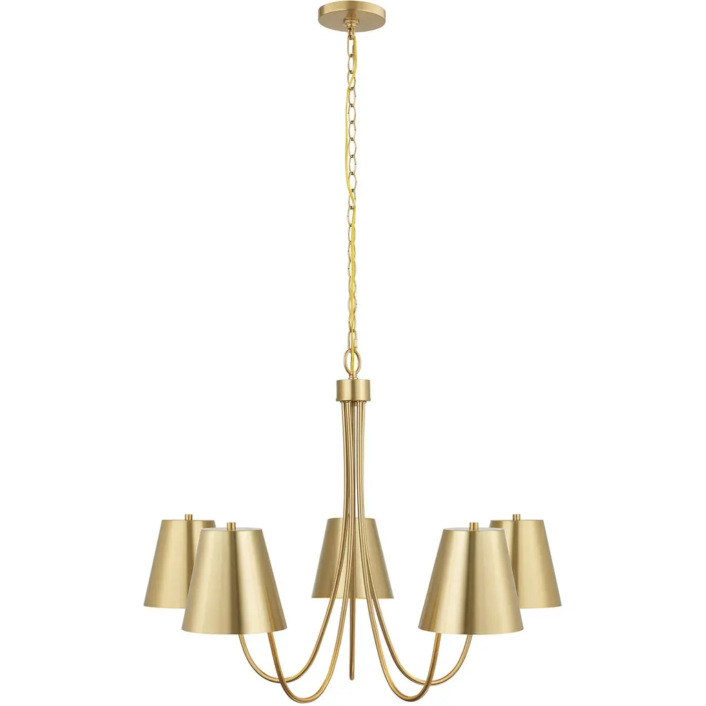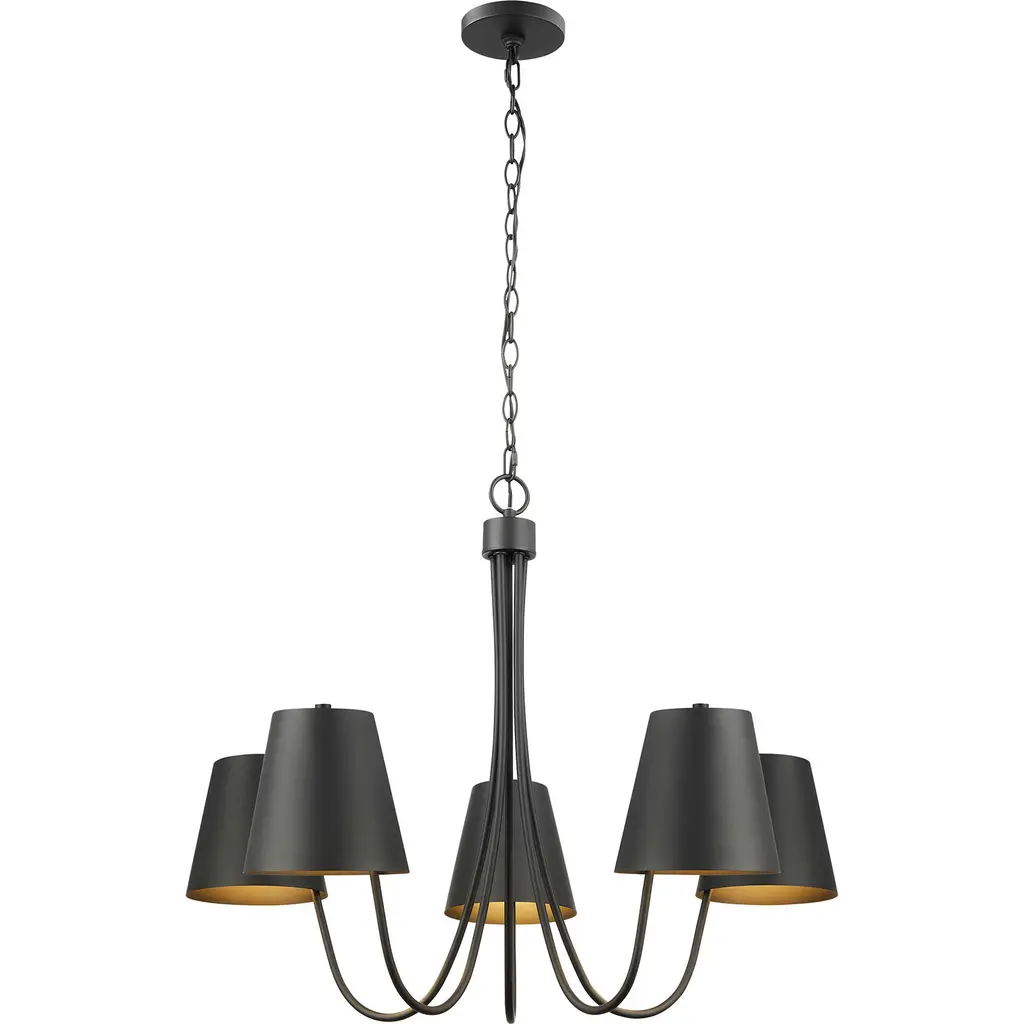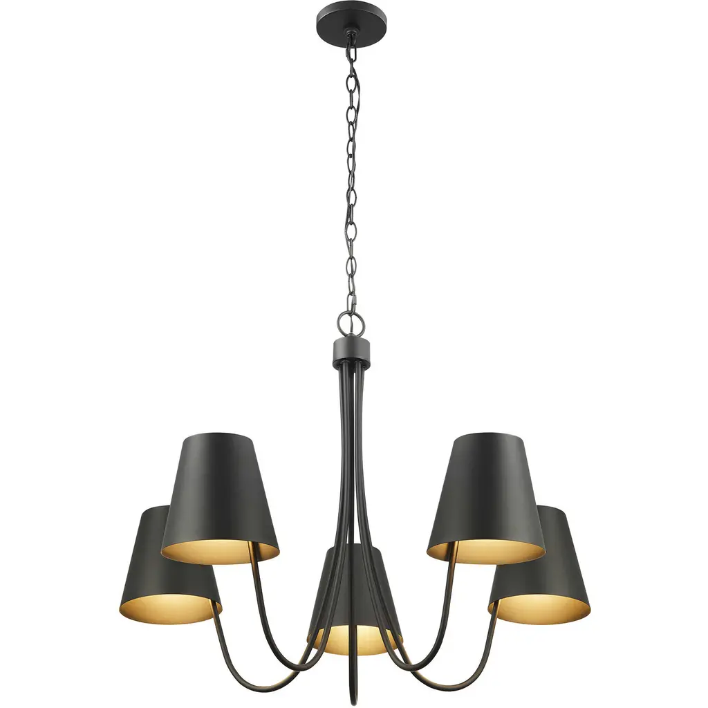 Go for the glow with this striking 5-light chandelier, which is finished from top to bottom in Matte Black. Because the metal shades are opaque, this is a great way to create concentrated and dramatic illumination. It is 23" in height and 32" in width. Uses five candelabra size bulbs of up to 60 watts per bulb. Bulbs not included.