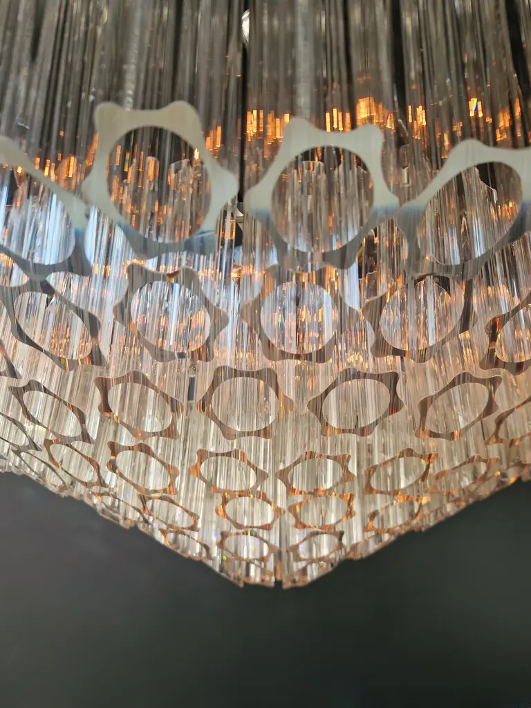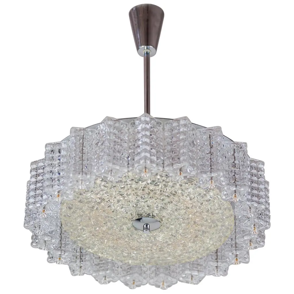 Introducing a brand new modern ceiling chandelier that captures new age elegance and fits perfectly in smaller and larger spaces. This exquisite piece has been crafted with precision from crystals and is a testament to our in-house manufacturing expertise, proudly manufactured in Berlin. Dimensions: Diameter: 95cm, Height: 45cm Bulbs: 9 x E14 bulbs The height is customizable to your liking. Crafted with precision by our Berlin artisans, the quality and design meet the highest standards. With a capacity for 9 E14 bulbs, this ceiling chandelier will spread a warm and inviting glow in your space. The interplay of chrome silver and lead crystal reflects and refracts the light in a fascinating way, creating an atmosphere that is both inviting and sophisticated. Your gateway to elegance This modern crystal chandelier is the epitome of contemporary design and masterful craftsmanship. Brighten up your surroundings with the exquisite blend of modernity and Art Deco charm that this chandelier embodies.