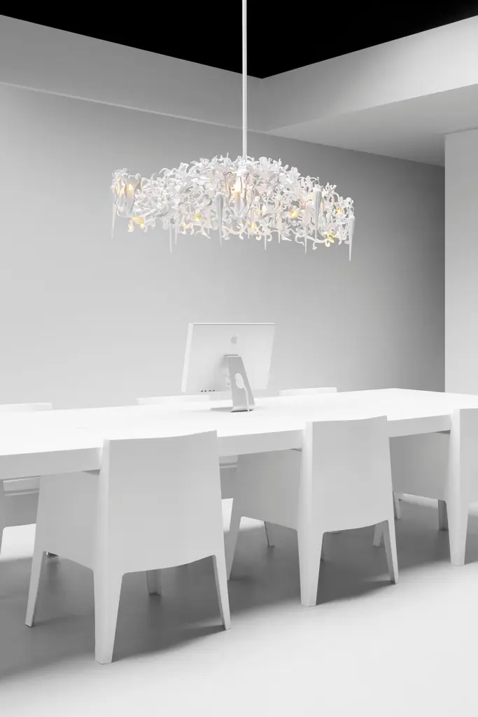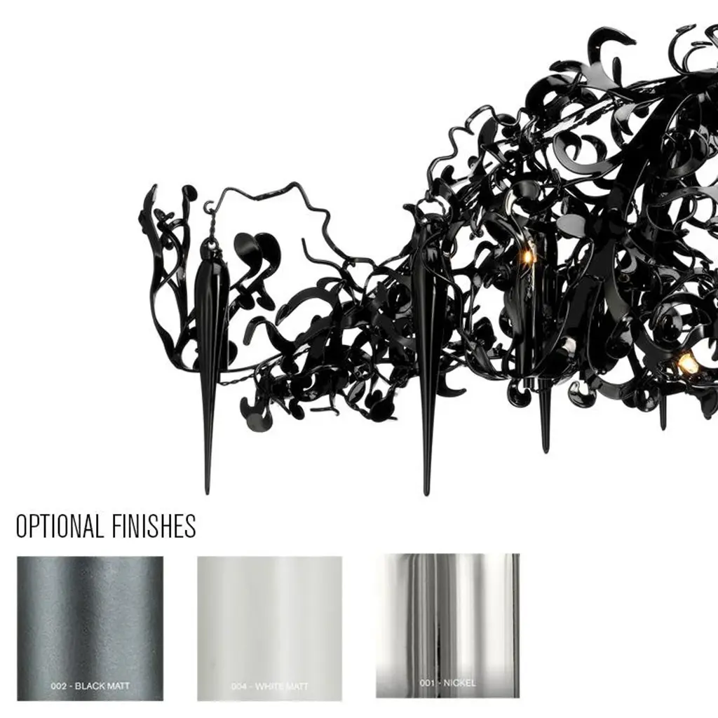 This modern chandelier in an oval shape and nickel finish is part of the Flower Power collection, designed by William Brand, founder of Brand van Egmond. Using the latest techniques to cut flowery sensual shapes out of steel plates, Flower Power is a wonderful rendez-vous between handmade and high-tech. All this is combined with specially designed glass drops, that evoke the idea of icicles.The Flower Power Collection is available in an oval chandelier in the finishes black, white and nickel. Custom dimensions and finishes are possible upon request.Upon receiving your confirmation, our atelier will start with the creation by hand of your ordered lighting sculpture. After your confirmation, we can no longer change the specifications of your order.