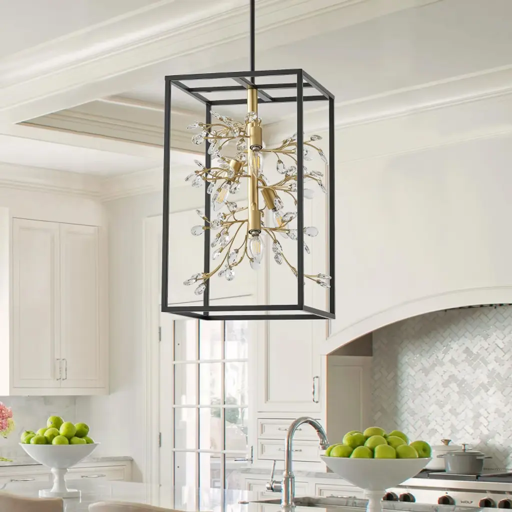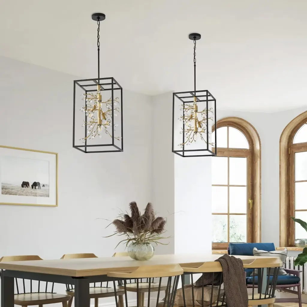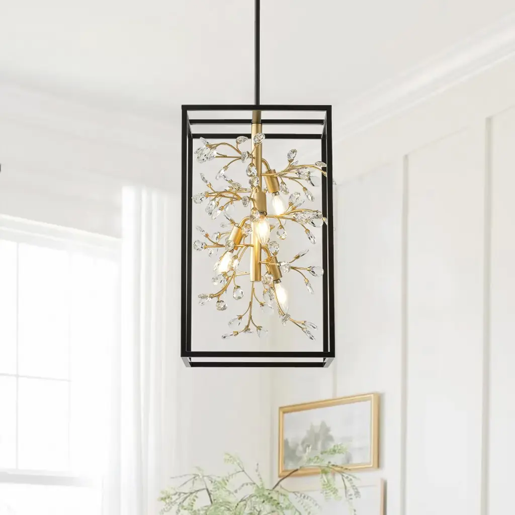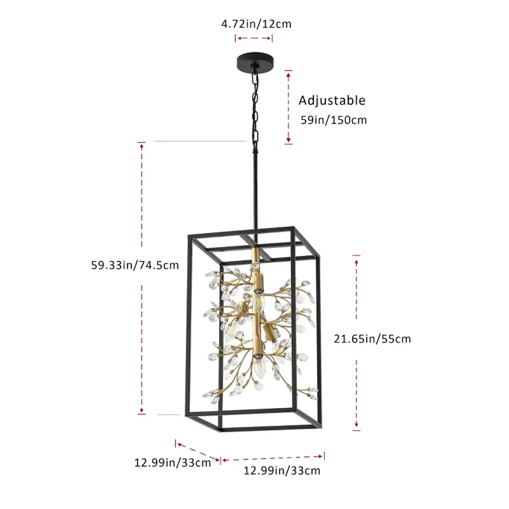 Illuminate your space with this modern geometric pendant light, featuring an open cage frame in matte black and light gold, accented by dazzling clear crystal branches. Designed for both luxury and safety, this ETL certified chandelier is crafted from iron and crystal and supports four E12 bulbs (120V, 40W max). The adjustable 59-inch chain and matching downrod offer installation flexibility for high ceilings, making it perfect as an entryway pendant light, kitchen island pendant, or dining room statement fixture. Add contemporary crystal elegance to your foyer, living room, or any modern glam interior with this stunning black and gold chandelier.