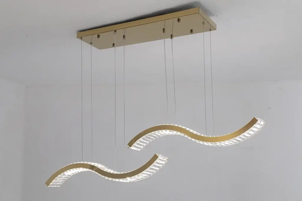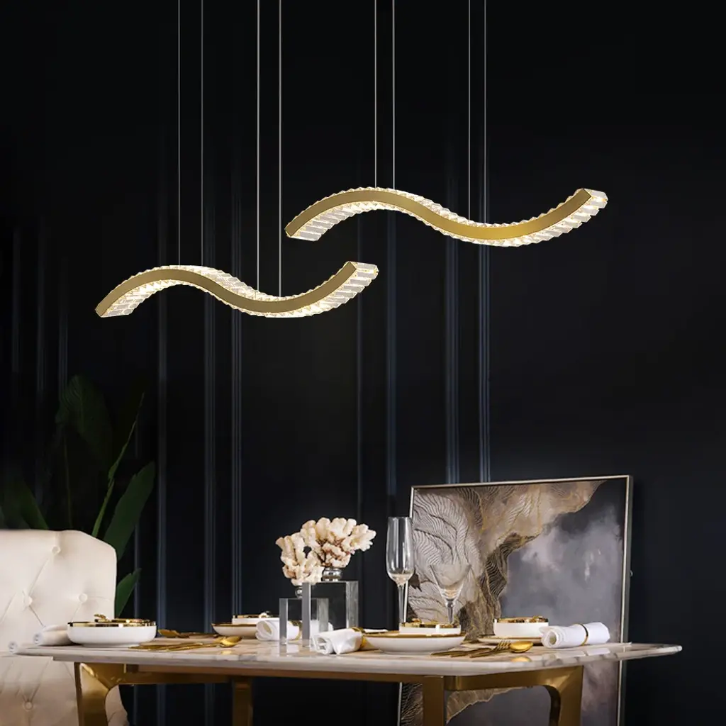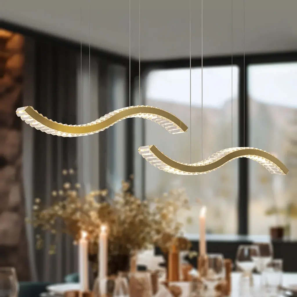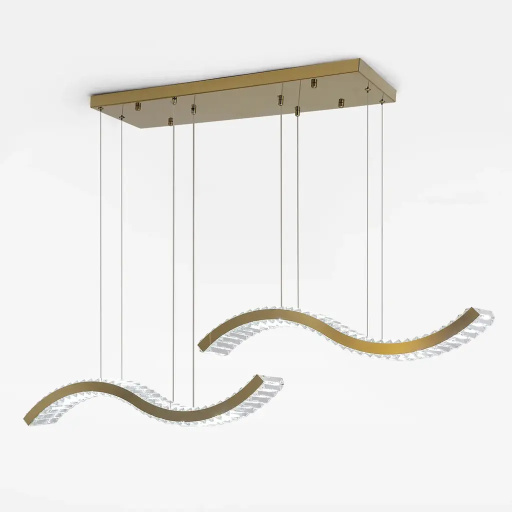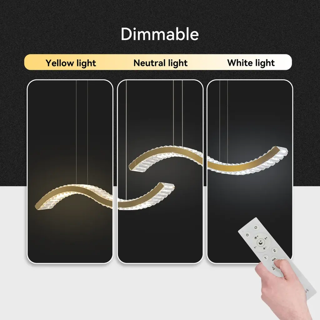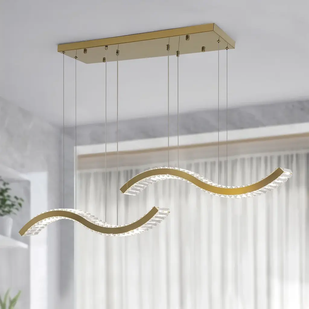 Elevate your interior ambiance with this Modern Double-S Wave Crystal LED Chandelier. Designed with an elegant gold finish and high-transparency crystal elements, this statement light fixture adds sophistication and warmth to any space. The distinctive S-shaped dual arms radiate a soft glow, enhanced by advanced LED lighting with tricolor temperature control and seamless dimming capabilities. Whether you're furnishing a living room, dining area, or upscale office, this chandelier brings both functionality and style. Equipped with a remote control for convenient light customization, and an adjustable suspension system to suit various ceiling heights, this chandelier offers luxury and flexibility in one stunning package. Built with energy-efficient LEDs, it is as practical as it is beautiful.