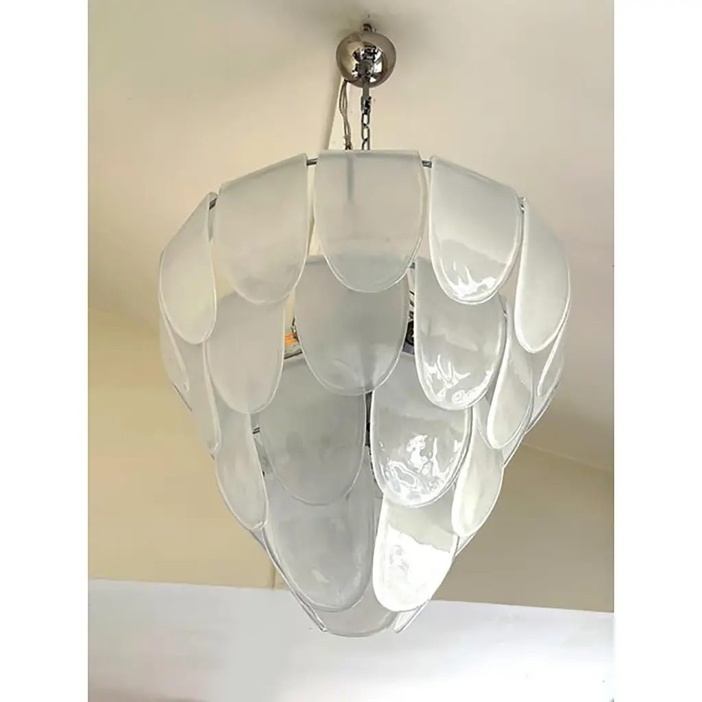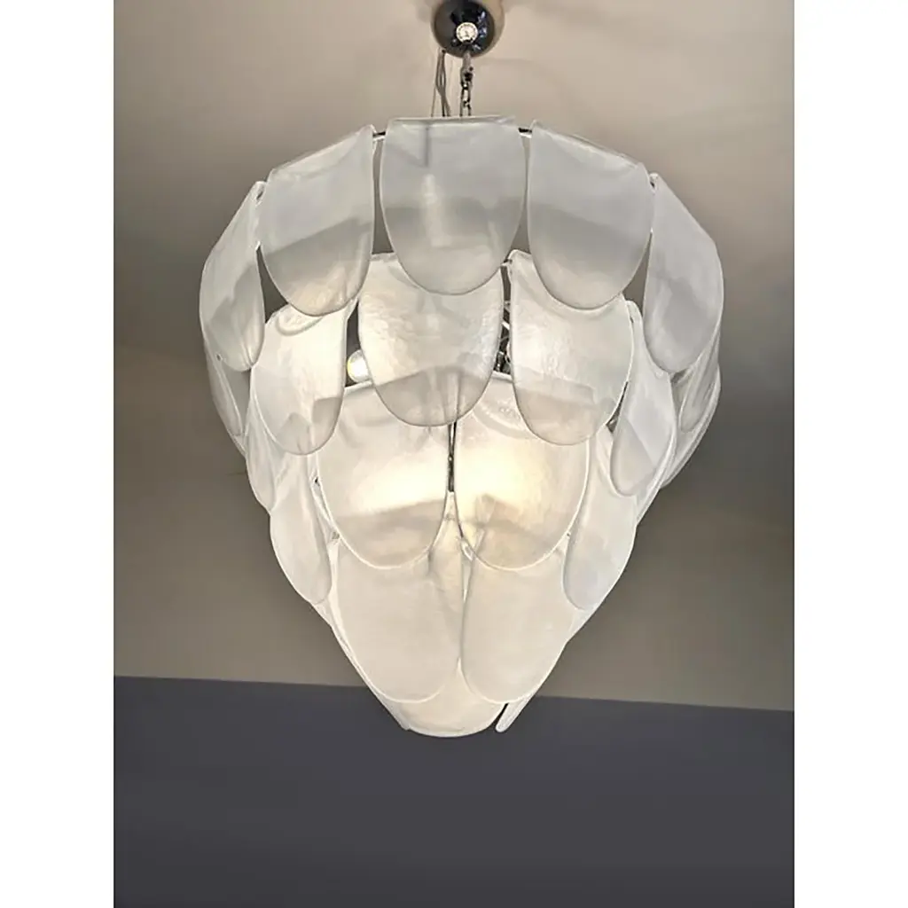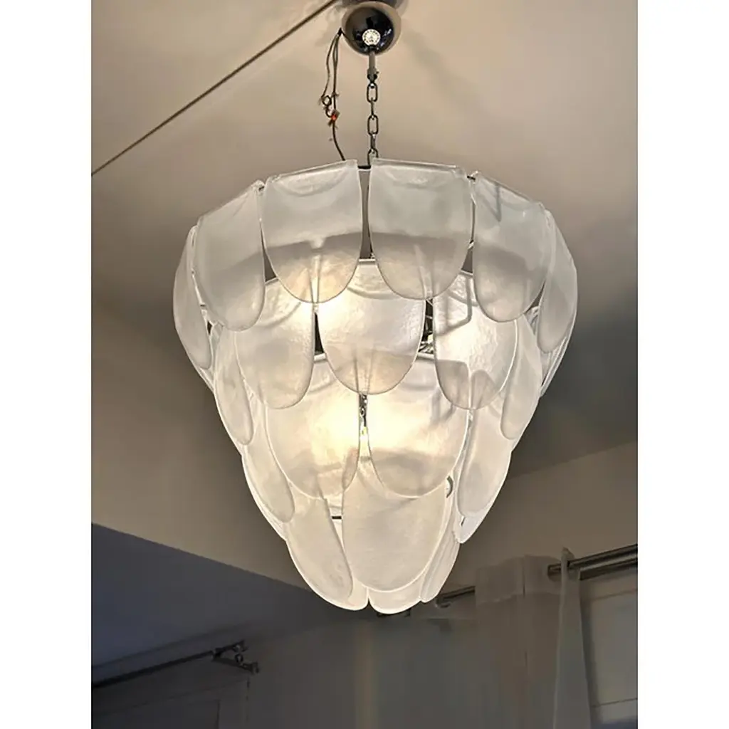 Luxury modern chromed chandelier with sanded "petals" in murano glass. hand-made in murano glass , all made in italy ,a piece of hight italian hand-crafmanship very elegant and impressive contemporary chandelier. spare parts are included. Bulbs not included, they are compatible with led sustainability. entirely made in italy, made in murano glass fruit of of high italian know-how. chain 19.7″ more canopy dimensions (cm/in): diameter 70cm h. 55cm /d. 27.5" h. 21.6" finiture: chrome bath of metal frame 6 lights up to 250v (europe/uk standard).