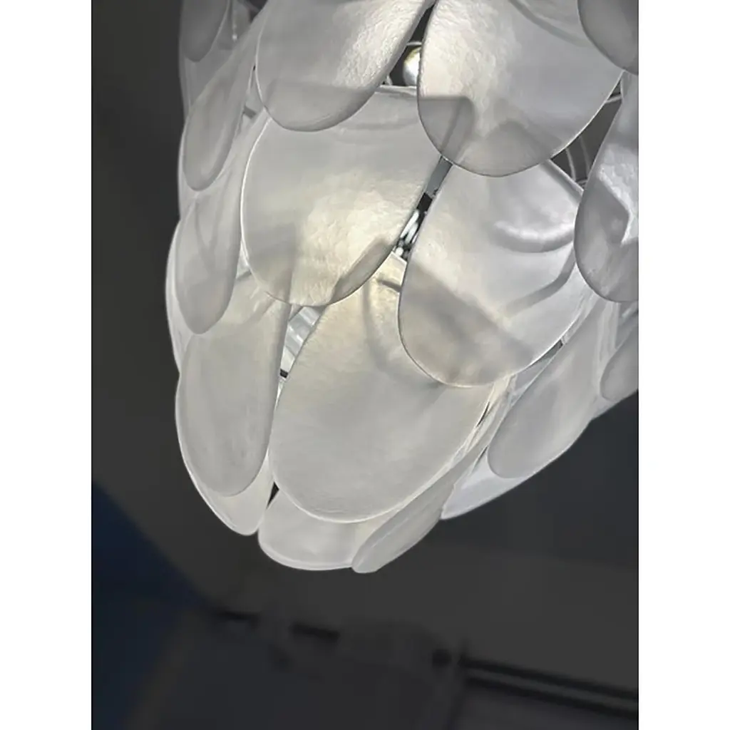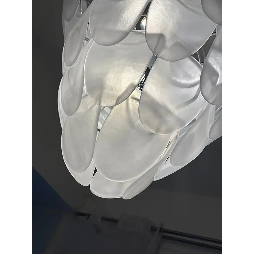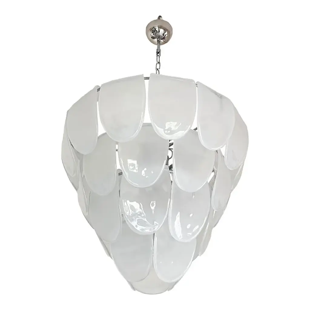 Luxury modern chromed chandelier with sanded "petals" in murano glass. hand-made in murano glass , all made in italy ,a piece of hight italian hand-crafmanship very elegant and impressive contemporary chandelier. spare parts are included. Bulbs not included, they are compatible with led sustainability. entirely made in italy, made in murano glass fruit of of high italian know-how. chain 19.7″ more canopy dimensions (cm/in): diameter 70cm h. 55cm /d. 27.5" h. 21.6" finiture: chrome bath of metal frame 6 lights up to 250v (europe/uk standard).