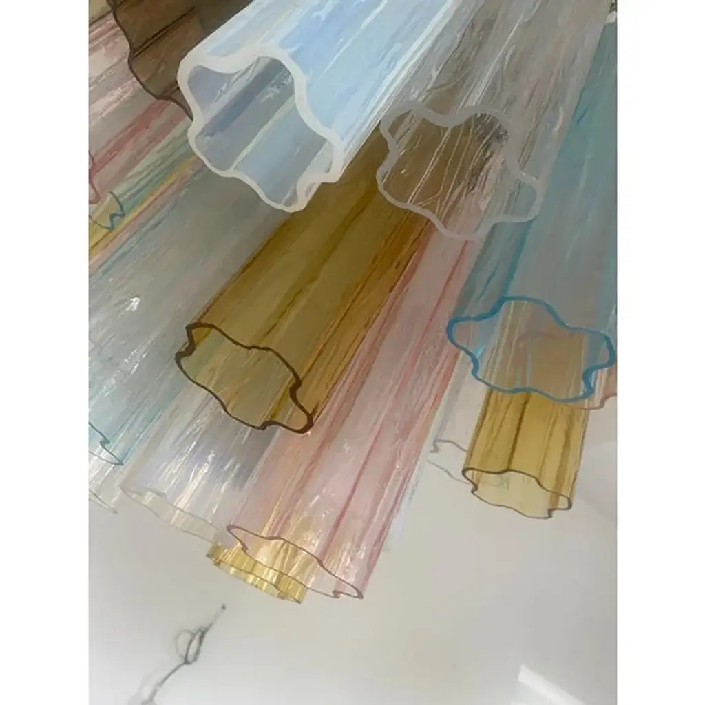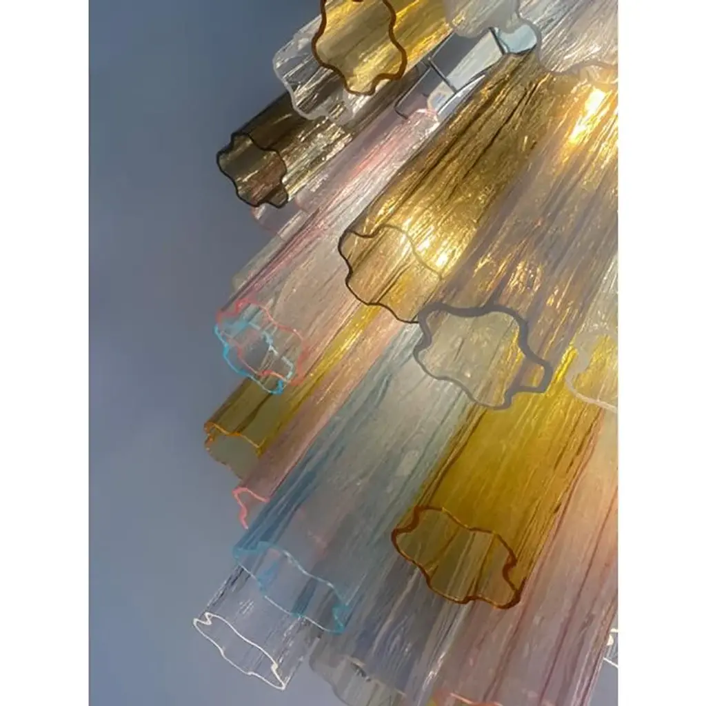 Contemporary modern "tronco" murano glass sputnik chandelier venini style five tiers tronchi glasses multicolors of murano glass. entirely made in italy, fruit of murano glass of high italian know-how dimensions (cm/in): d 60 cm h 90 cm /d 23.6″ ” h 35.4″ finiture: chrome brass metal frame chain 19.7" more canopy spare parts included. Bulbs not included. made in murano glass, very elegant and luxury piece of art. all colors are random and ship from italy in strong packing up to 250v (europe/uk standard).