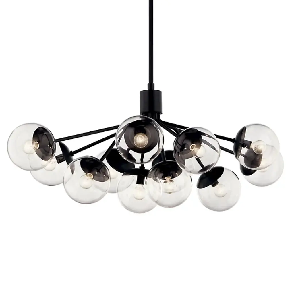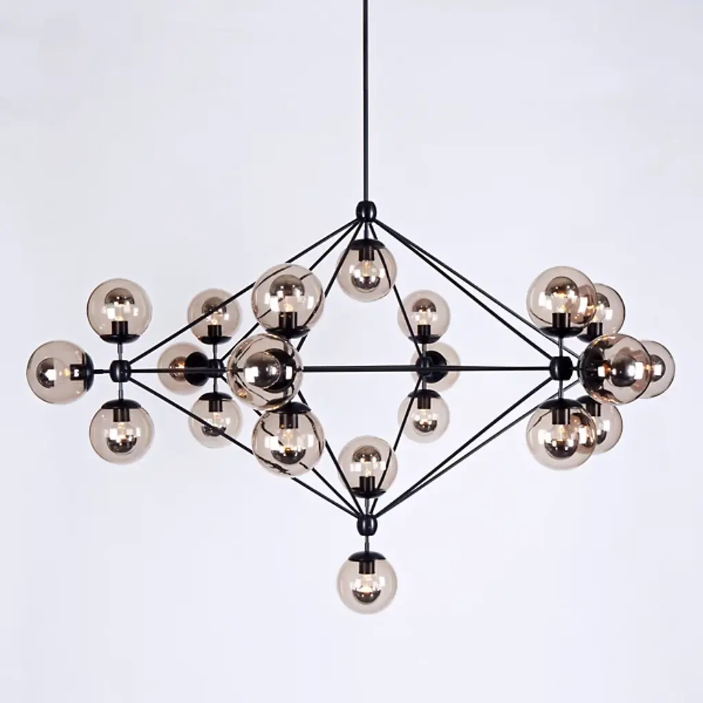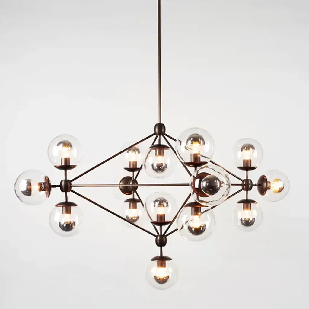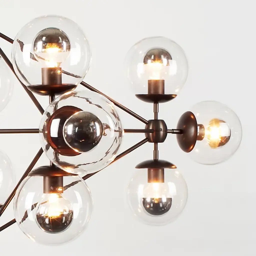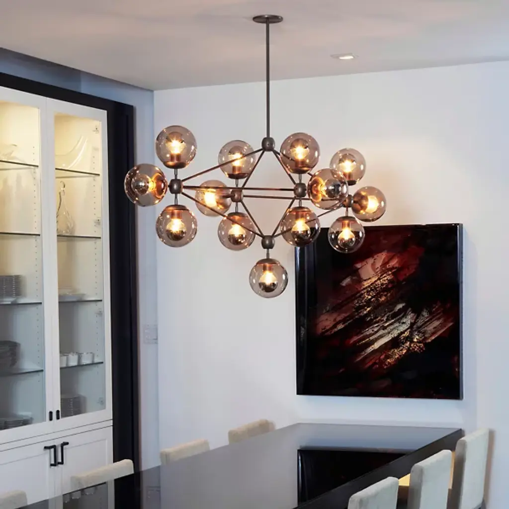 The Modo 4 Sided Chandelier – 15 Globes by Roll & Hill is a simple and refined piece designed to make a statement in any setting. Designed by Jason Miller, this chandelier is inspired by the off-the-shelf industrial parts that are often found in lighting stores for inexpensive light fixtures. Reimagining this concept using high-end American-made parts engineered from custom CNC-milled solid aluminum, this fixture features handblown glass spheres held in place by slender arms in various geometric formations.