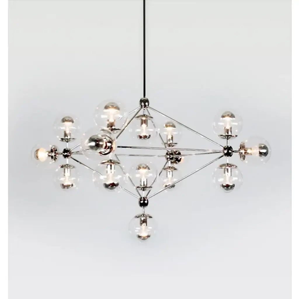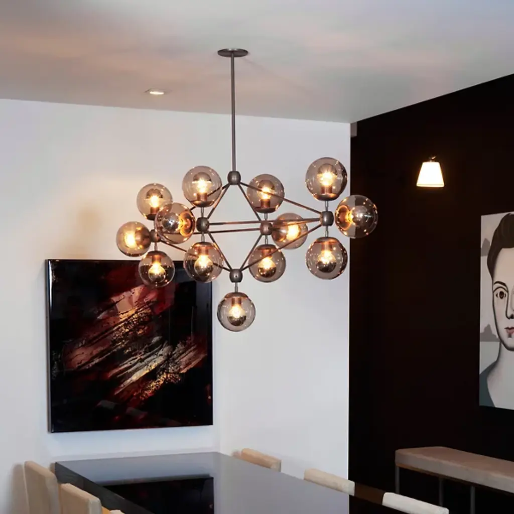 The Modo 4 Sided Chandelier – 15 Globes by Roll & Hill is a simple and refined piece designed to make a statement in any setting. Designed by Jason Miller, this chandelier is inspired by the off-the-shelf industrial parts that are often found in lighting stores for inexpensive light fixtures. Reimagining this concept using high-end American-made parts engineered from custom CNC-milled solid aluminum, this fixture features handblown glass spheres held in place by slender arms in various geometric formations.