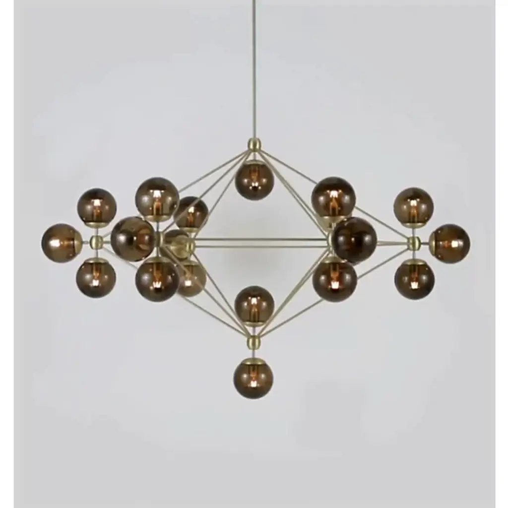 The Modo 6 Sided Chandelier - 21 Globes from Roll & Hill elevates a space with its stunning arrangement of angular lines and glass shades. From designer Jason Miller, this fixture takes its inspiration from the ready-made off-the-shelf parts that are inexpensively made for industrial fixtures. Elevating the style with high-quality, American-made materials, including custom CNC-milled solid aluminum and handblown glass, the piece becomes a refined luminaire that provides a brilliant wash of ambient light.