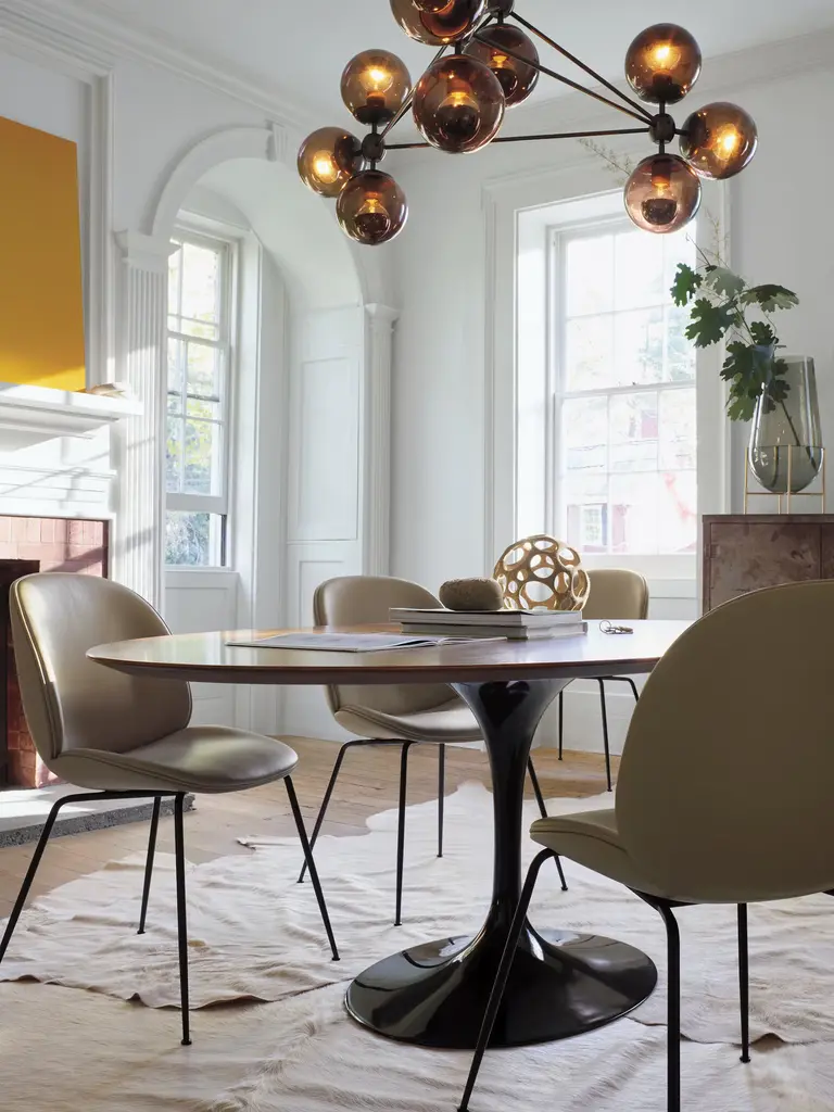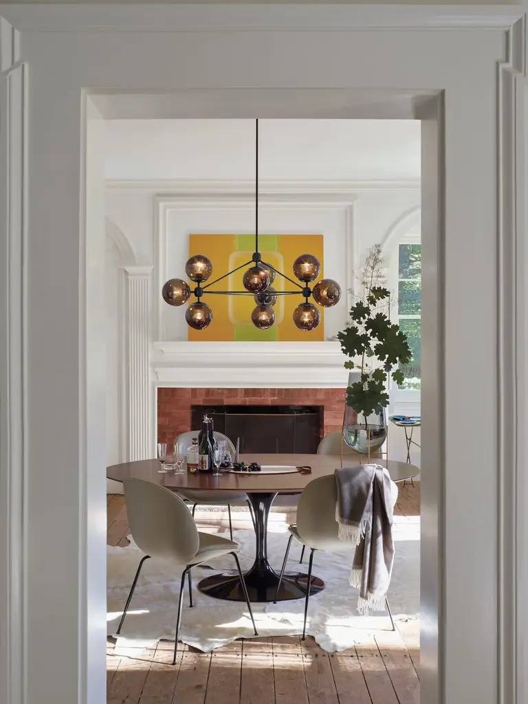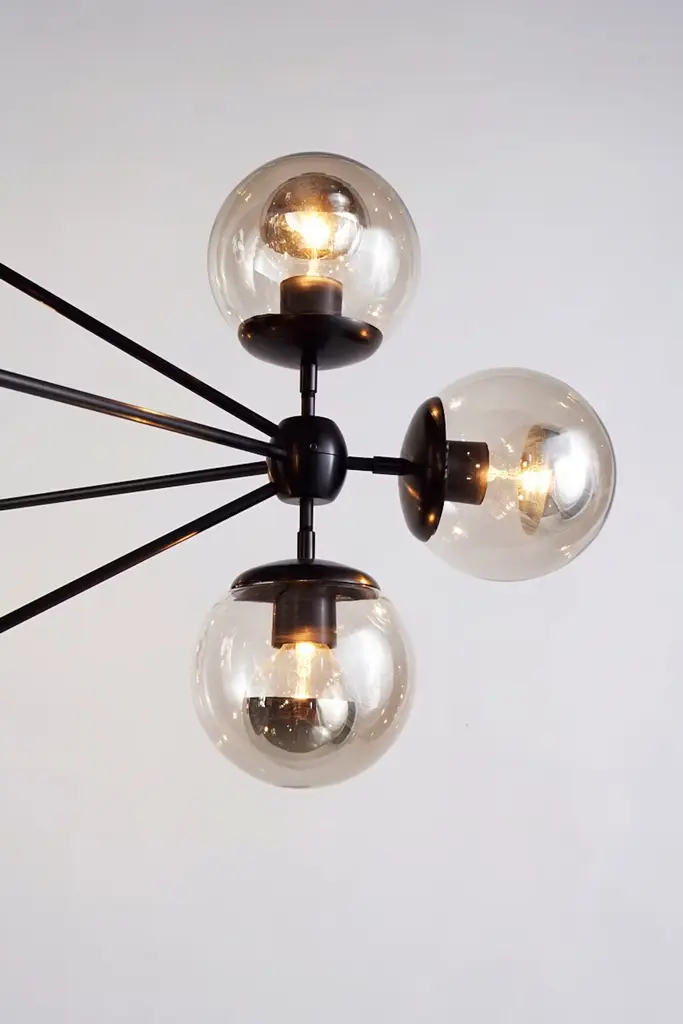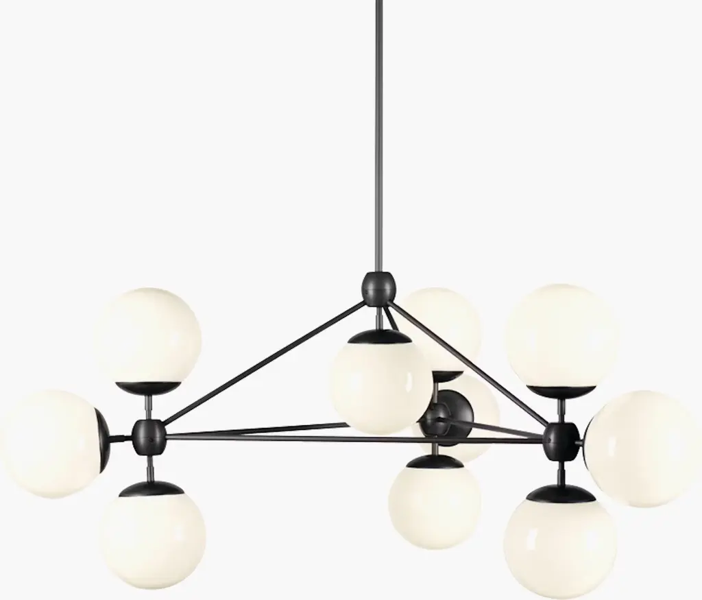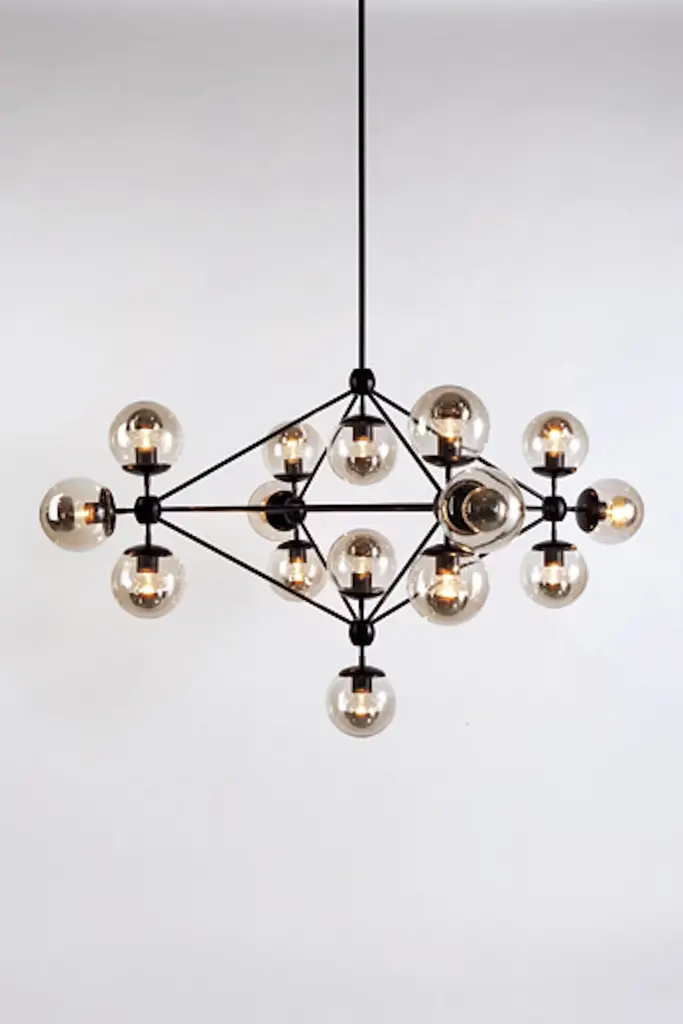 For his simple and innovative lighting, Jason Miller draws on everyday aspects of American culture, transforming them into something surprising and beautiful. For his Modo Chandelier (2009), Miller was inspired by off-the-shelf industrial parts like those found on Canal Street, not far from his Brooklyn studio. “We have re-engineered inexpensive parts that are made by the thousands in China or India," says Miller about the piece's manufacturing. “Modo's parts are made by high-end machine shops here in America that typically work for the airline industry. While the inspiration is a bit banal, it is now a very sophisticated product." The chandelier's components are painstakingly engineered and custom CNC-milled from solid aluminum. This version has a three-sided frame that holds 10 glass globes, and it includes a three-foot stem that can be cut upon installation to the desired length. Bulb (included): LED half-silver globe 3-6W/G25/E26. UL and CUL Listed. The Modo Collection features hand-blown glass globes with slight variances in shape and color, which make each piece unique.