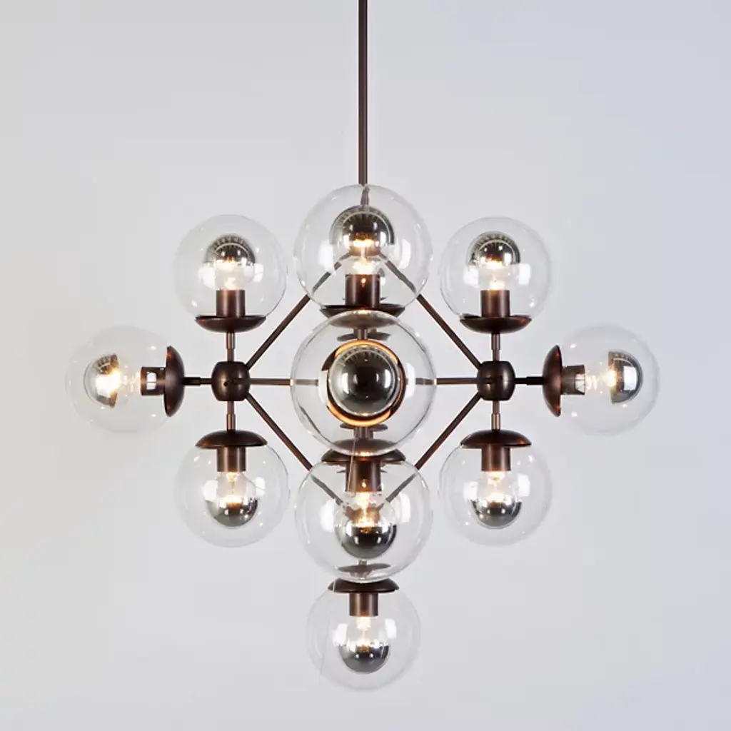 The Modo Diamond Chandelier - 13 Globes by Roll & Hill is a beautiful and versatile piece that instantly captures the look of a space. Designed by Jason Miller, this chandelier takes its inspiration from off-the-shelf industrial parts for inexpensive light fixtures. This fixture, on the other hand, is crafted from high-end American-made parts, including custom CNC-milled solid aluminum. Handblown glass shades containing glowing LEDs are held in place by slender arms forming a diamond-shaped formation.