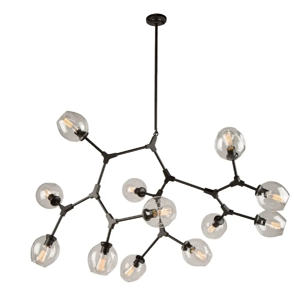 The Modo Diamond Chandelier - 13 Globes by Roll & Hill is a beautiful and versatile piece that instantly captures the look of a space. Designed by Jason Miller, this chandelier takes its inspiration from off-the-shelf industrial parts for inexpensive light fixtures. This fixture, on the other hand, is crafted from high-end American-made parts, including custom CNC-milled solid aluminum. Handblown glass shades containing glowing LEDs are held in place by slender arms forming a diamond-shaped formation.