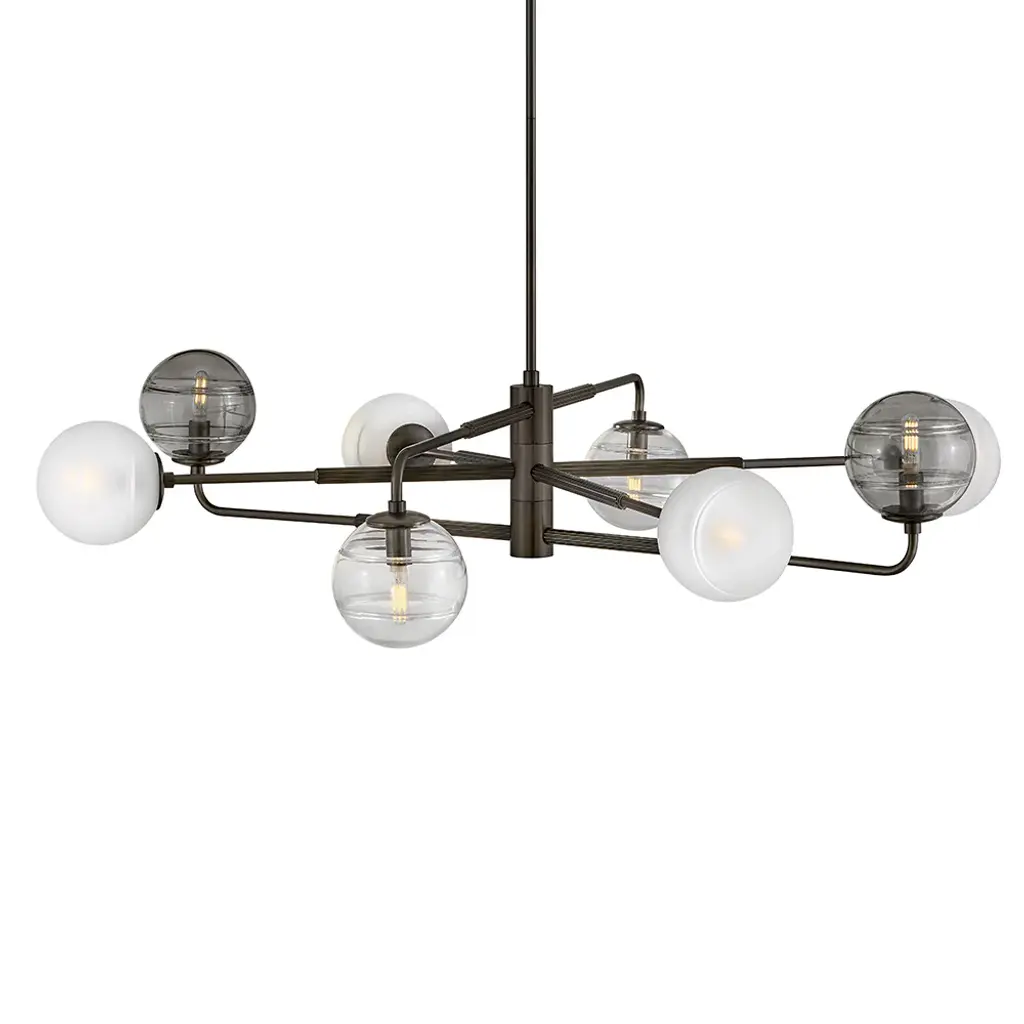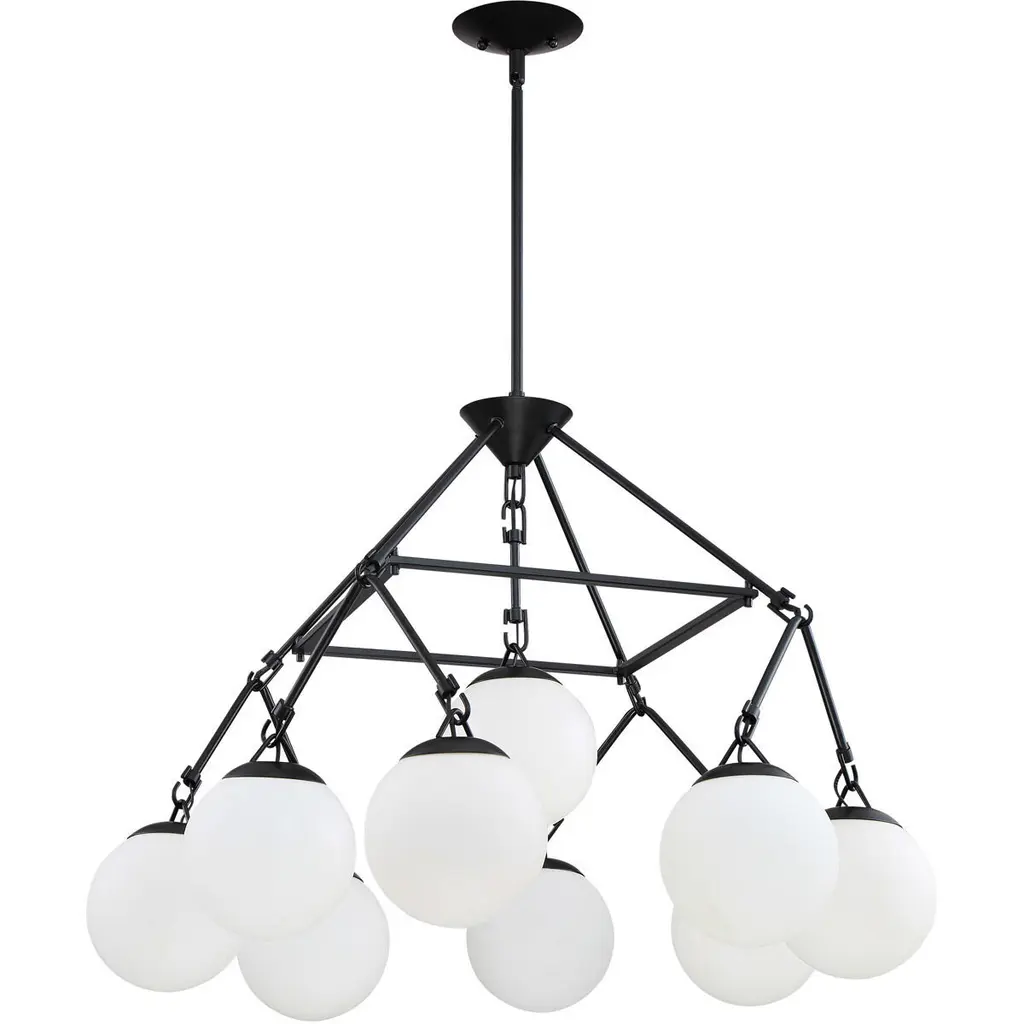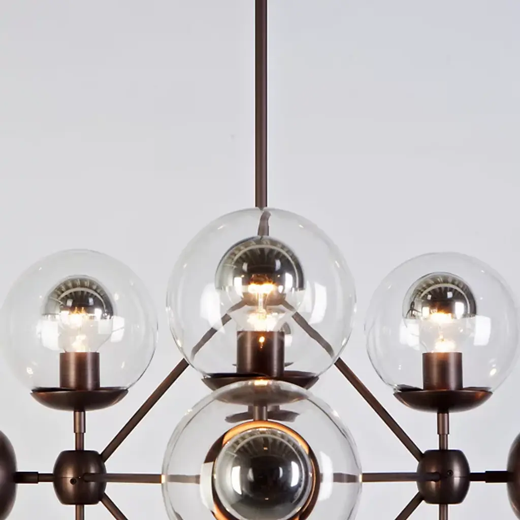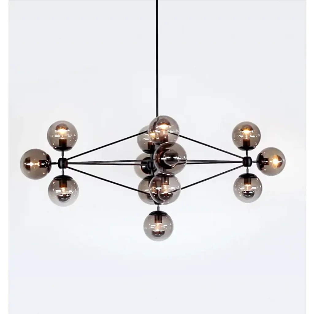The Modo Diamond Chandelier - 13 Globes by Roll & Hill is a beautiful and versatile piece that instantly captures the look of a space. Designed by Jason Miller, this chandelier takes its inspiration from off-the-shelf industrial parts for inexpensive light fixtures. This fixture, on the other hand, is crafted from high-end American-made parts, including custom CNC-milled solid aluminum. Handblown glass shades containing glowing LEDs are held in place by slender arms forming a diamond-shaped formation.