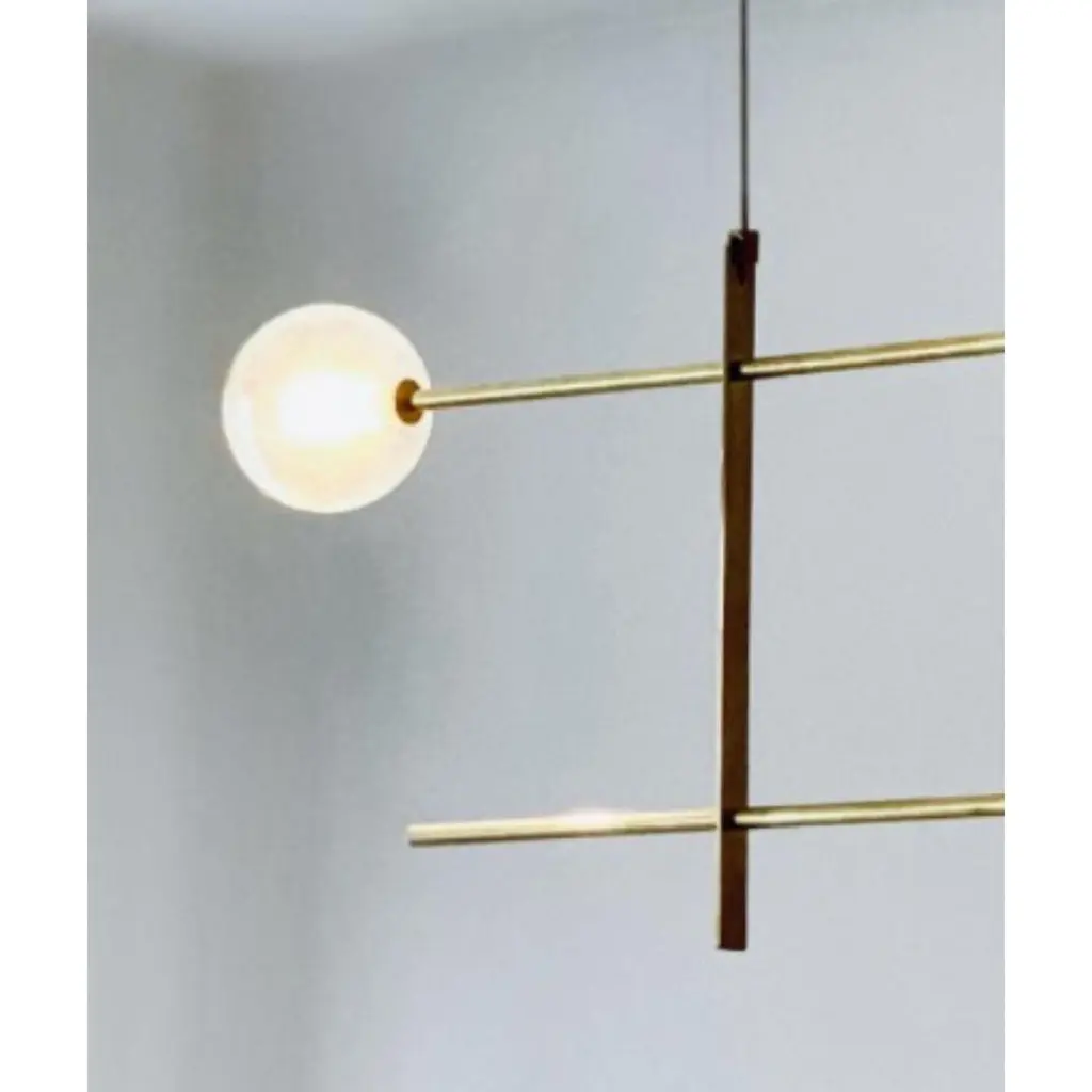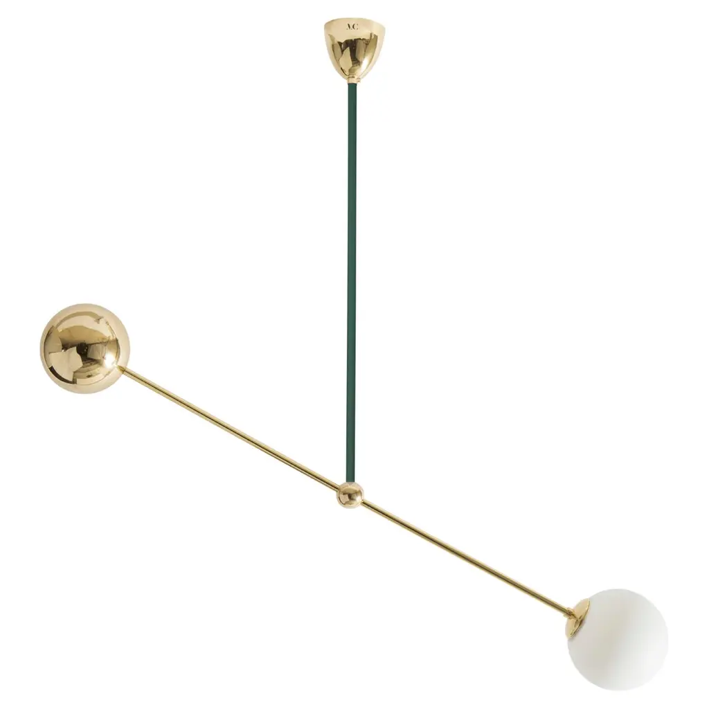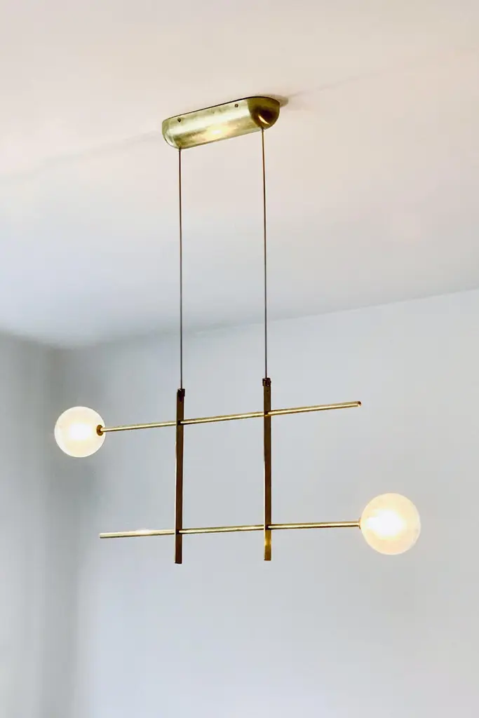 Modular chandelier 2 lamps by ContainDimensions: D 80 x W 32 x H 100 cm (custom length).Materials: Brass structure, cristal blown from local production.Available in different finishes and dimensions.All our lamps can be wired according to each country. If sold to the USA it will be wired for the USA for instance.“You are where you live” So, we decided to live in Mallorca. We are Mauricio Obarrio and Juan Peralta and CONTAIN is our lighting and furniture design studio.This collection is the result of the collaboration between our studio, local artisans and the industrial sector; where creativity and simplicity creates a unique synergy and generates a narrative between the materials used and the pieces created. Our mission is to deliver artisan crafted, highly engineered, sophisticated yet simple lighting design solutions. Our studio's inspiration is fueled by an obsession with natural materials such as Brass, Glass, and Hardwoods along with a love for artisan craftsmanship.