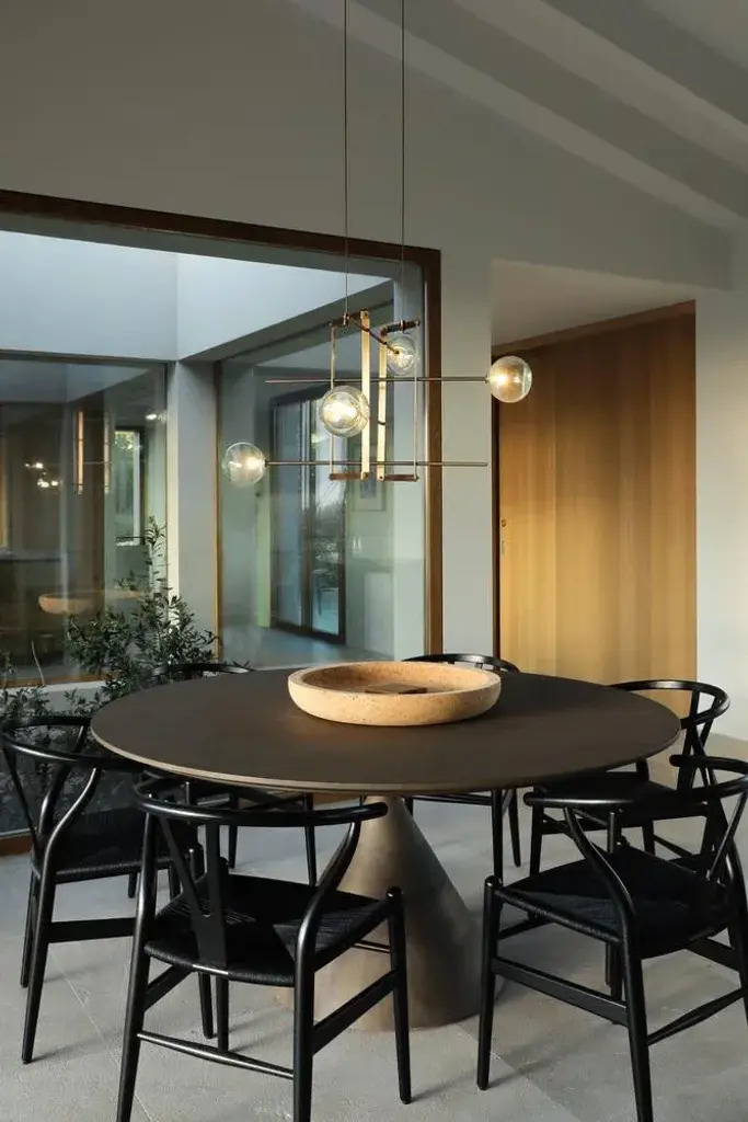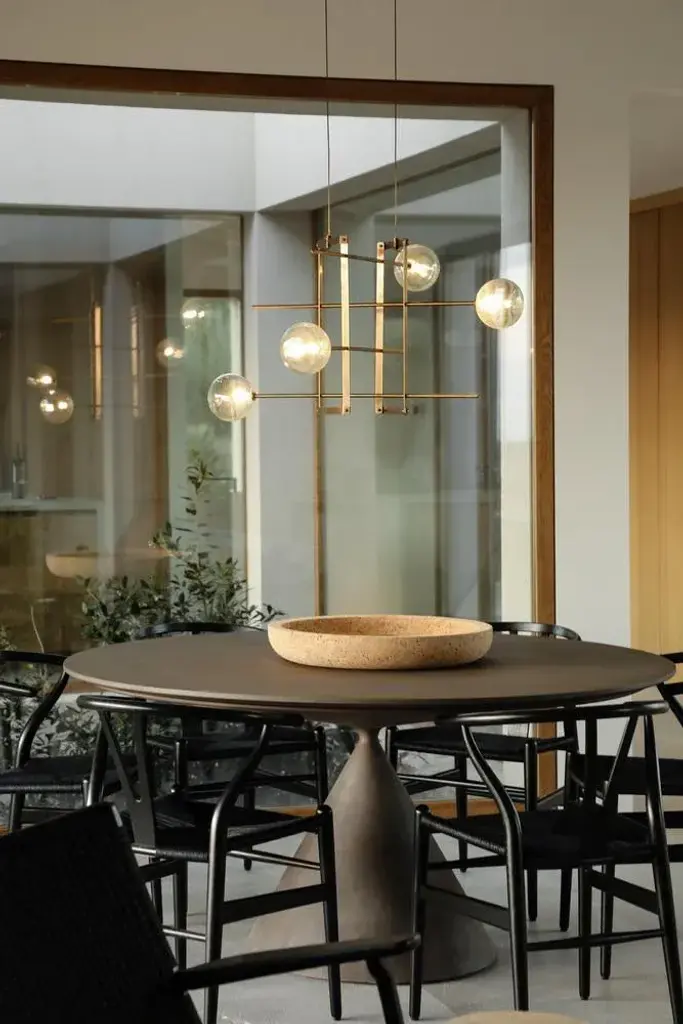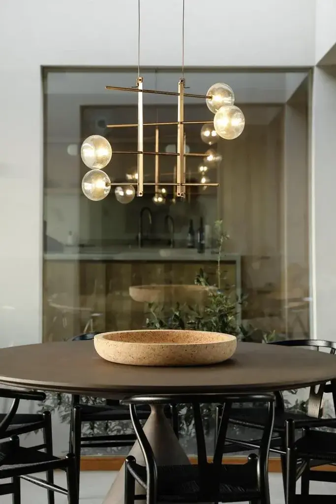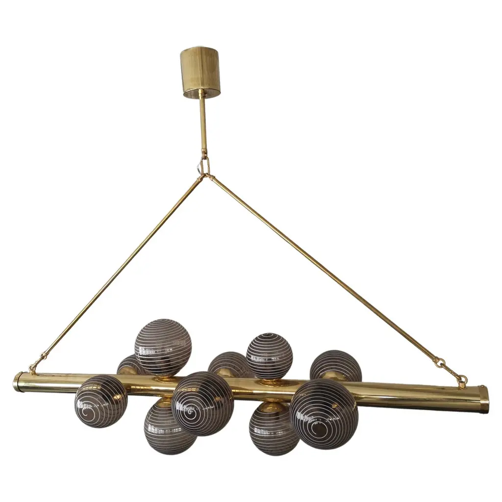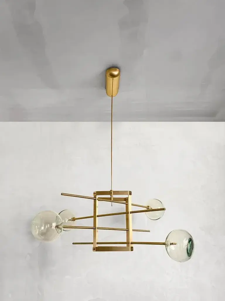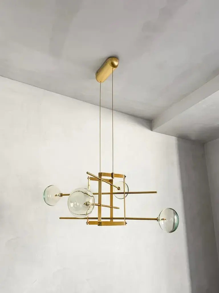 Modular chandelier 4 lamps by contain. Dimensions: d 85 x w 85 x h 29.5 cm (custom length). Materials: brass structure, blown glass from local production. Available in different finishes and dimensions. All our lamps can be wired according to each country. If sold to the usa it will be wired for the usa for instance. “you are where you live” so, we decided to live in mallorca. We are mauricio obarrio and juan peralta and contain is our lighting and furniture design studio. This collection is the result of the collaboration between our studio, local artisans and the industrial sector; where creativity and simplicity creates a unique synergy and generates a narrative between the materials used and the pieces created. Our mission is to deliver artisan crafted, highly engineered, sophisticated yet simple lighting design solutions. Our studio's inspiration is fueled by an obsession with natural materials such as brass, glass, and hardwoods along with a love for artisan craftsmanship. up to 250v (europe/uk standard).