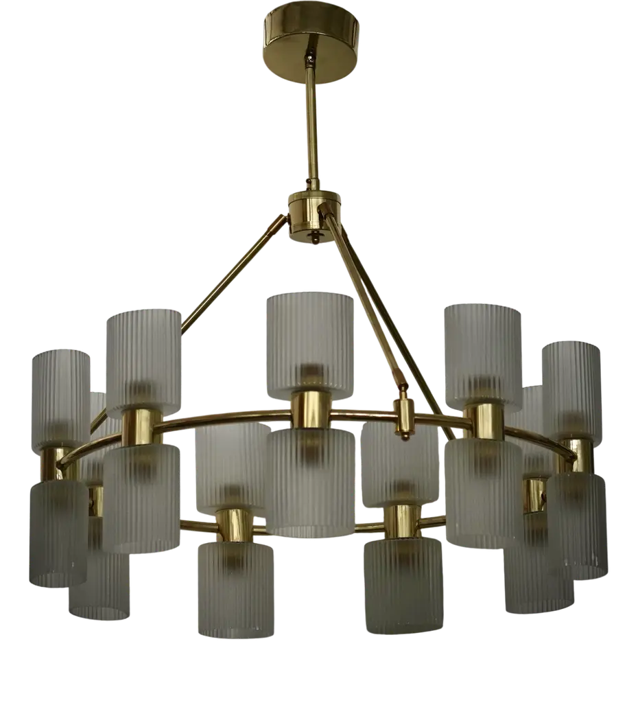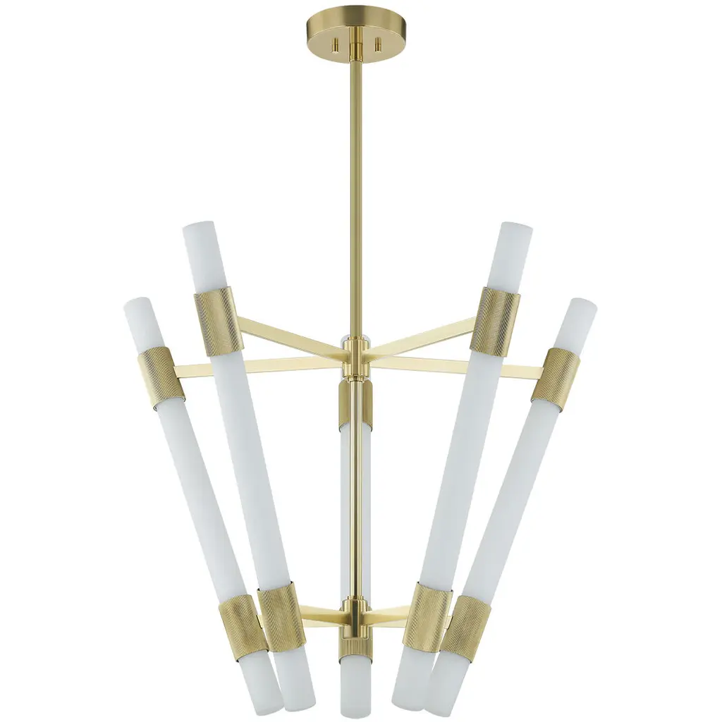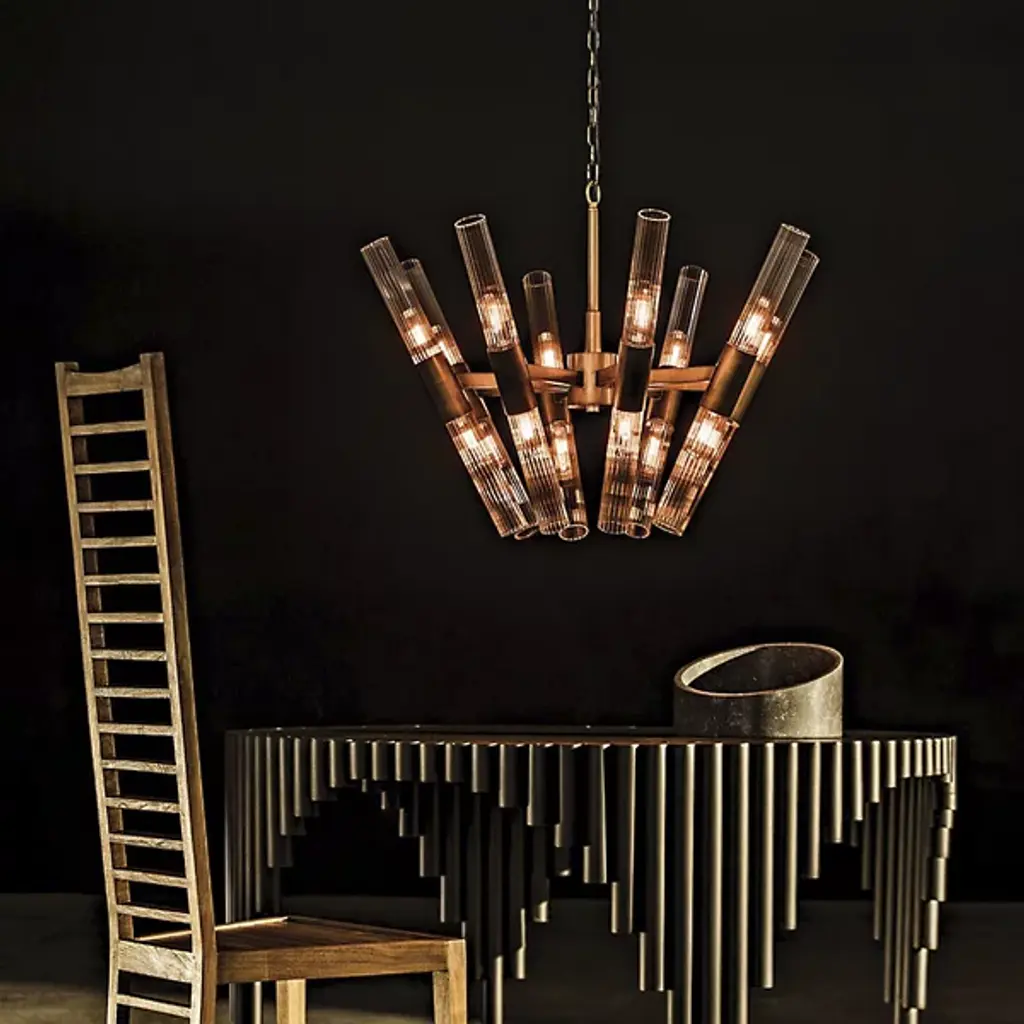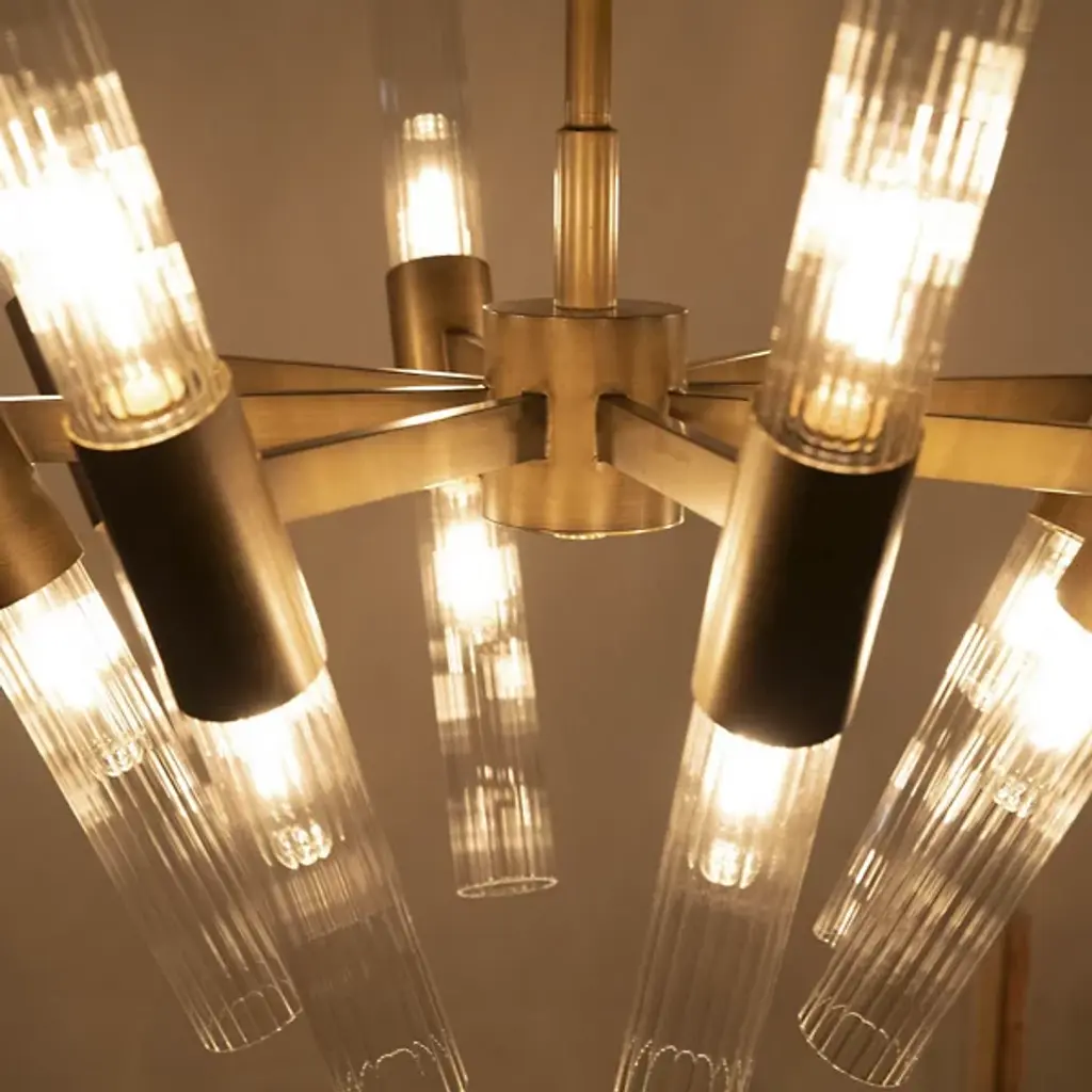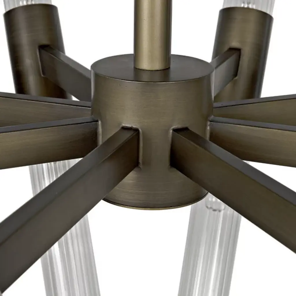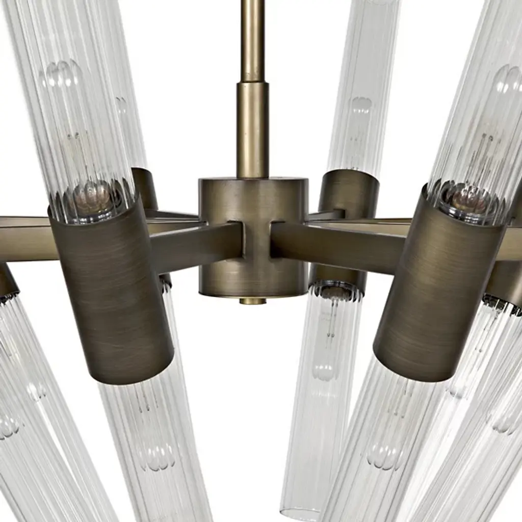 The Moira Chandelier from Noir is a dramatic and handsome industrial statement piece. The chandelier descends from a smooth circular canopy holding a chain and stem arrangement, boasting outward angled arms, each holding fluted glass "batons" as shades from the sleek metal collar. The chandelier design combines contemporary and industrial styles, creating an expressive, appealing design and dispensing an even, artful warmth to all sides that burnishes the metal with a gorgeous glow.