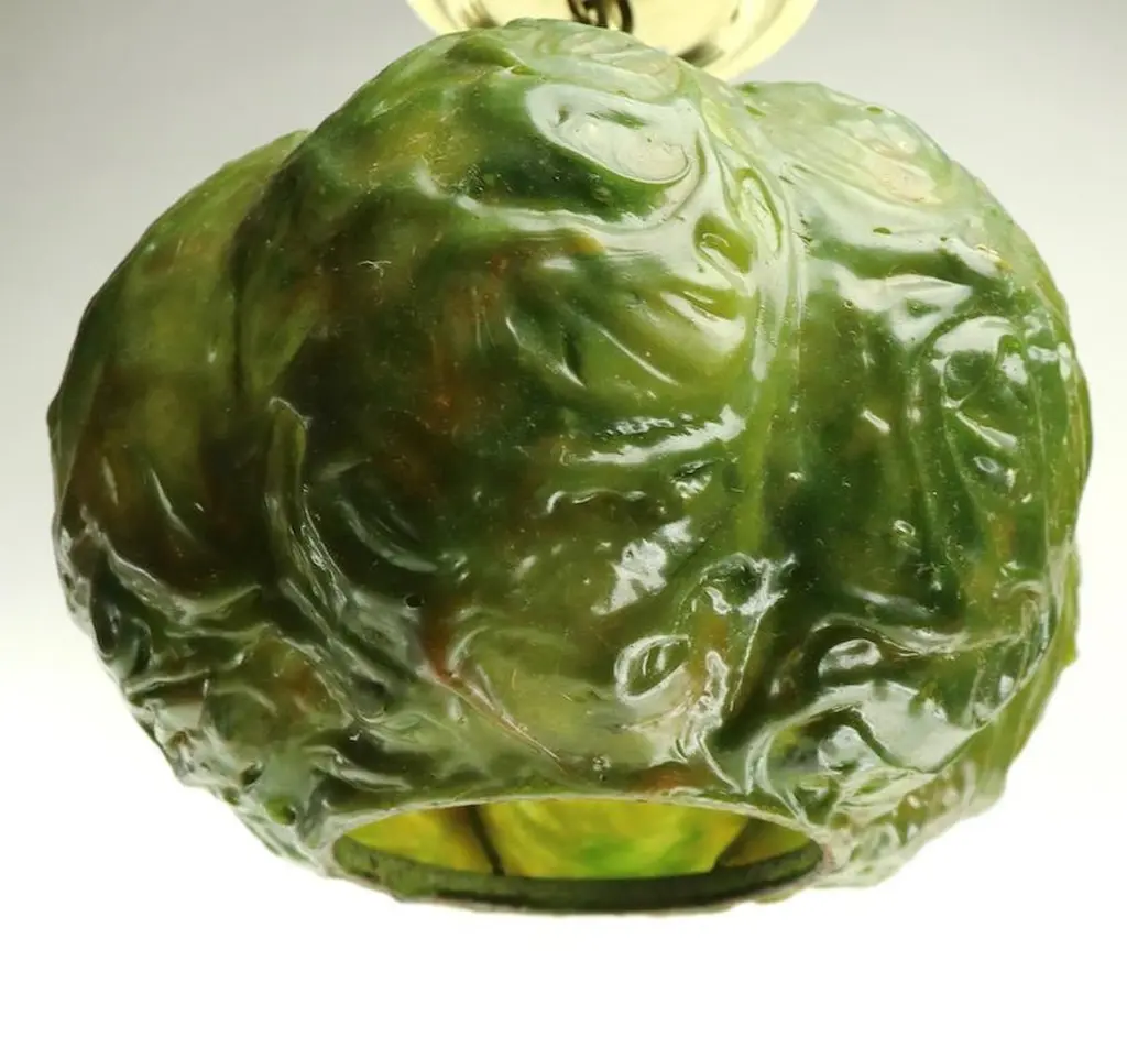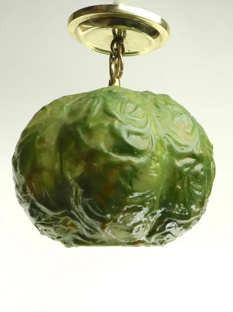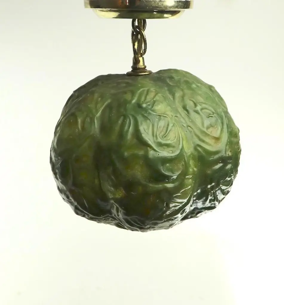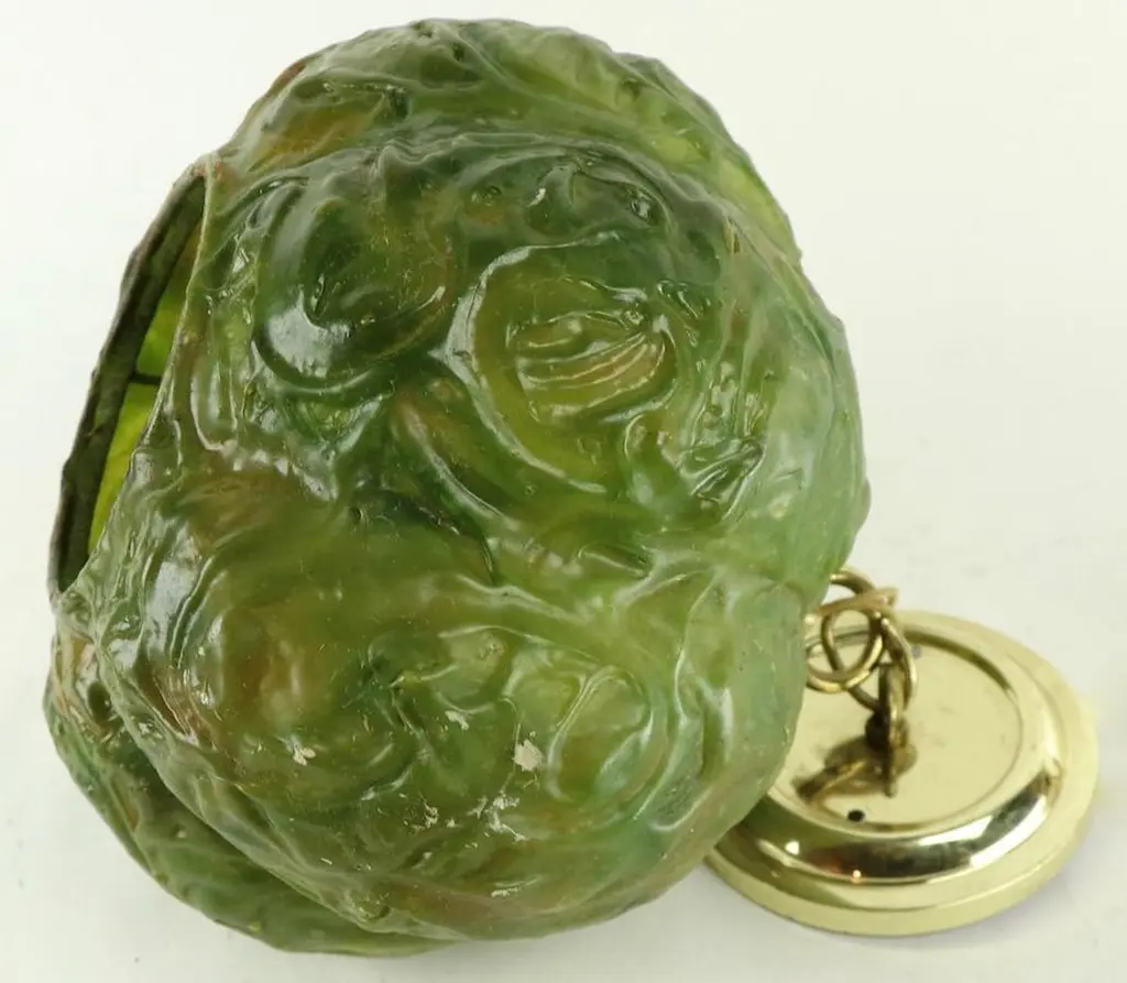 Unusual molded plastic ball fixture in the form of a head of cabbage by the Feldman Company. Weird and fun concept lights, in original, clean and working condition. Wired to accept standard size screw in bulbs. Priced and offered individually, but we would love to see them stay together.