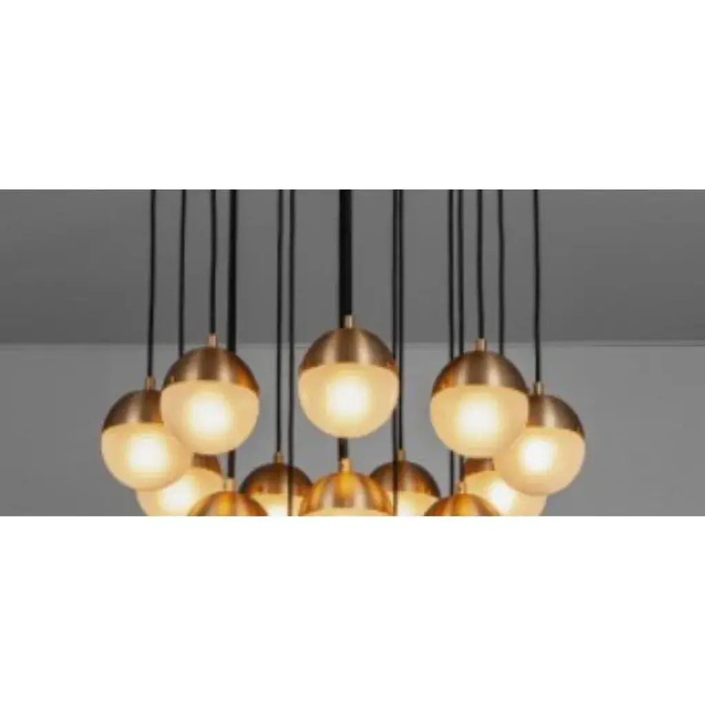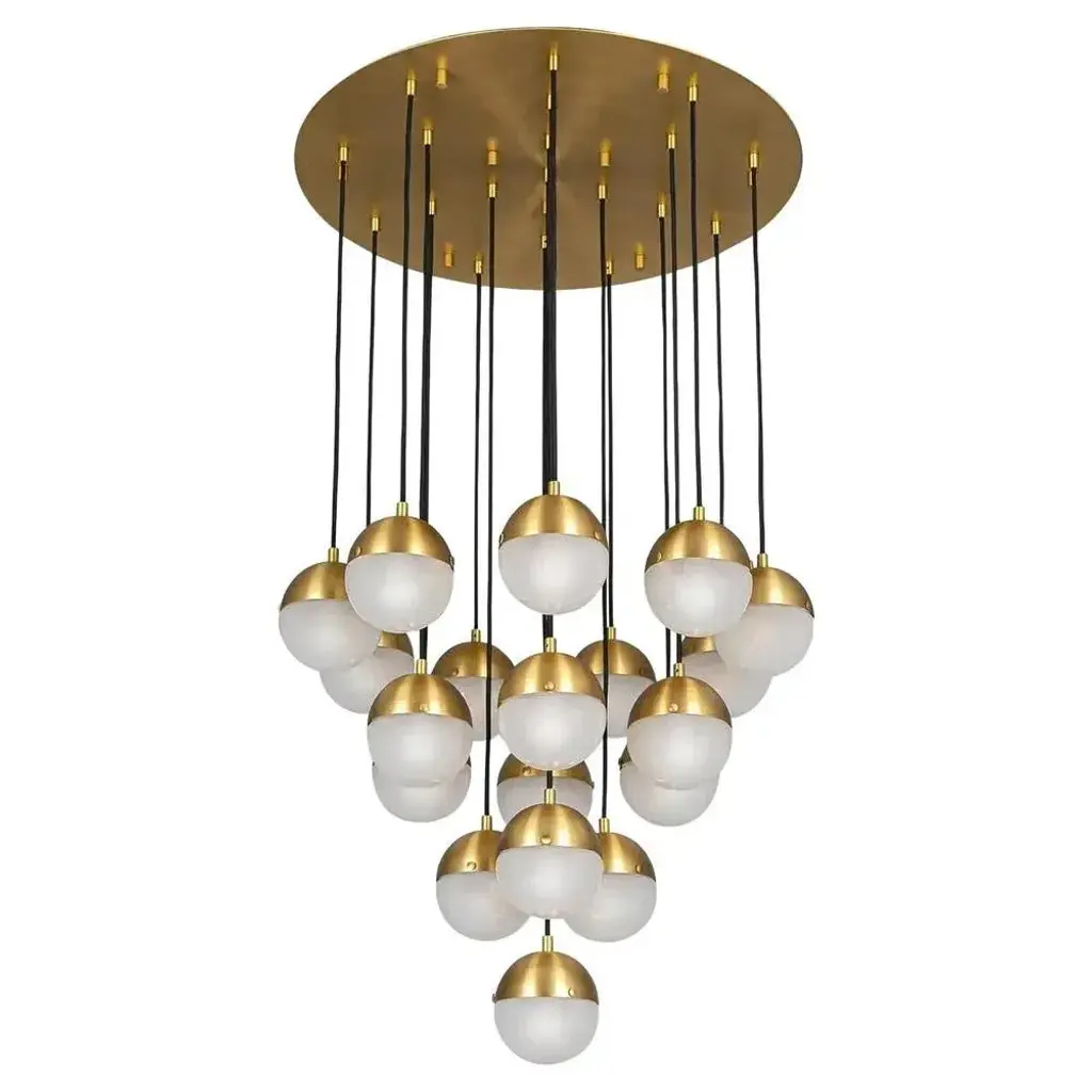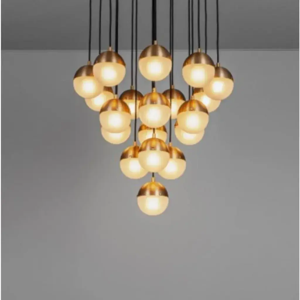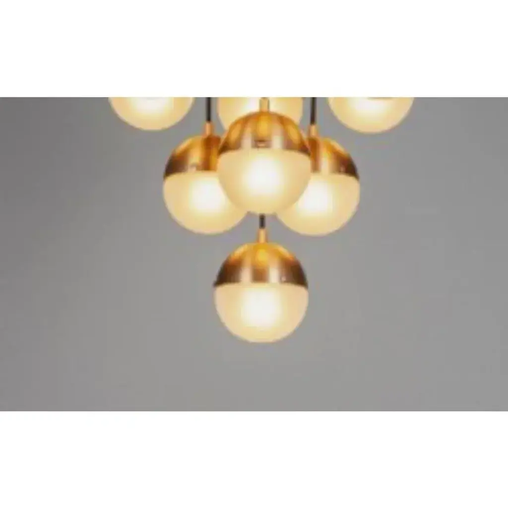 Molecule cluster 19 chandelier by Schwung Dimensions: D 63 x H 113, 3 cm Materials: Brass, Opal glass Weight: 20.9 kg Finishes available separately: Black gunmetal, polished nickel, brass Other sizes available. Schwung is a german word, and loosely defined, means energy or momentumm of a positive manner. synonyms: verve, zest, panache, momentum. Mission Developing lighting fixtures through simple and timeless materials, sustainably; we are committed to creating quality products that last. Beginning with the design we are constantly refining aesthetic and function. Both in the lamps themselves and throughout the manufacturing process we pursue a holistic approach to efficiency, and the reduction of environmental impact. Up to 250V (Europe/UK Standard).