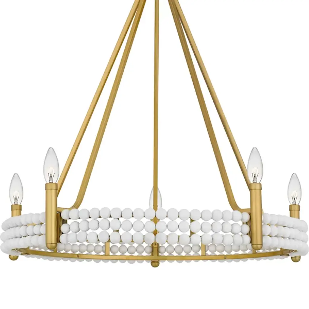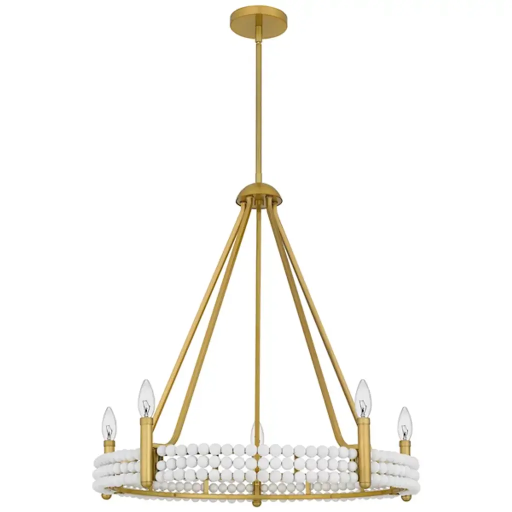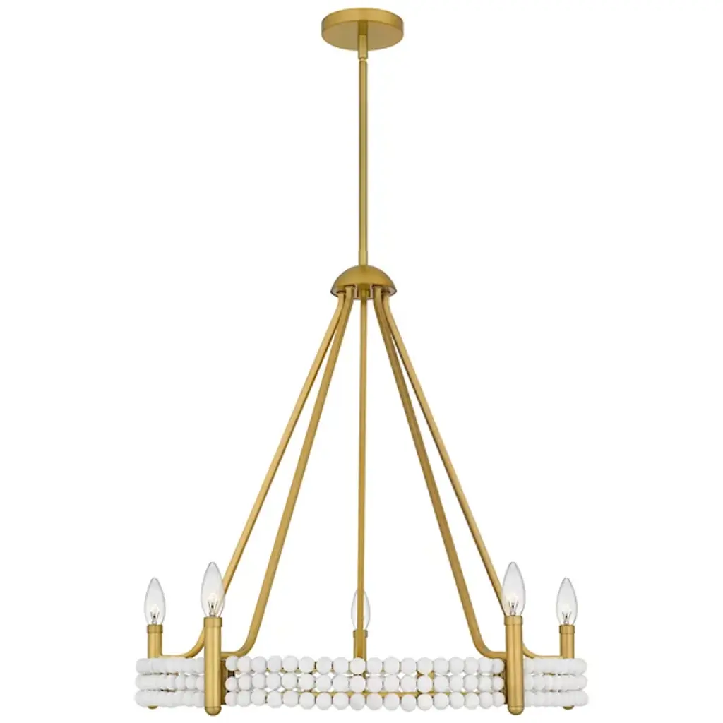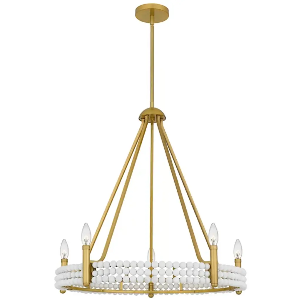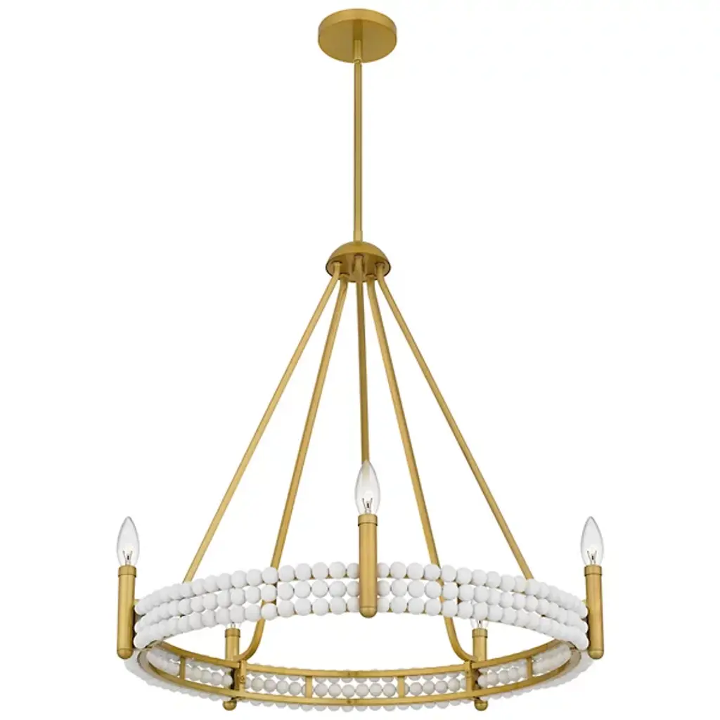 The Molly Chandelier from Quoizel is made of durable steel and maintains its glossy form over time. The steel frame contrasts with the matte beads, resulting in a visually engaging design. The beads form a refined drum shade, adding a coastal touch that brings warmth to any room. This versatile chandelier suits diverse spaces, from dining areas to foyers and kitchens. Offering adjustable height and sloped ceiling compatibility, the Molly Chandelier provides excellent installation flexibility.
