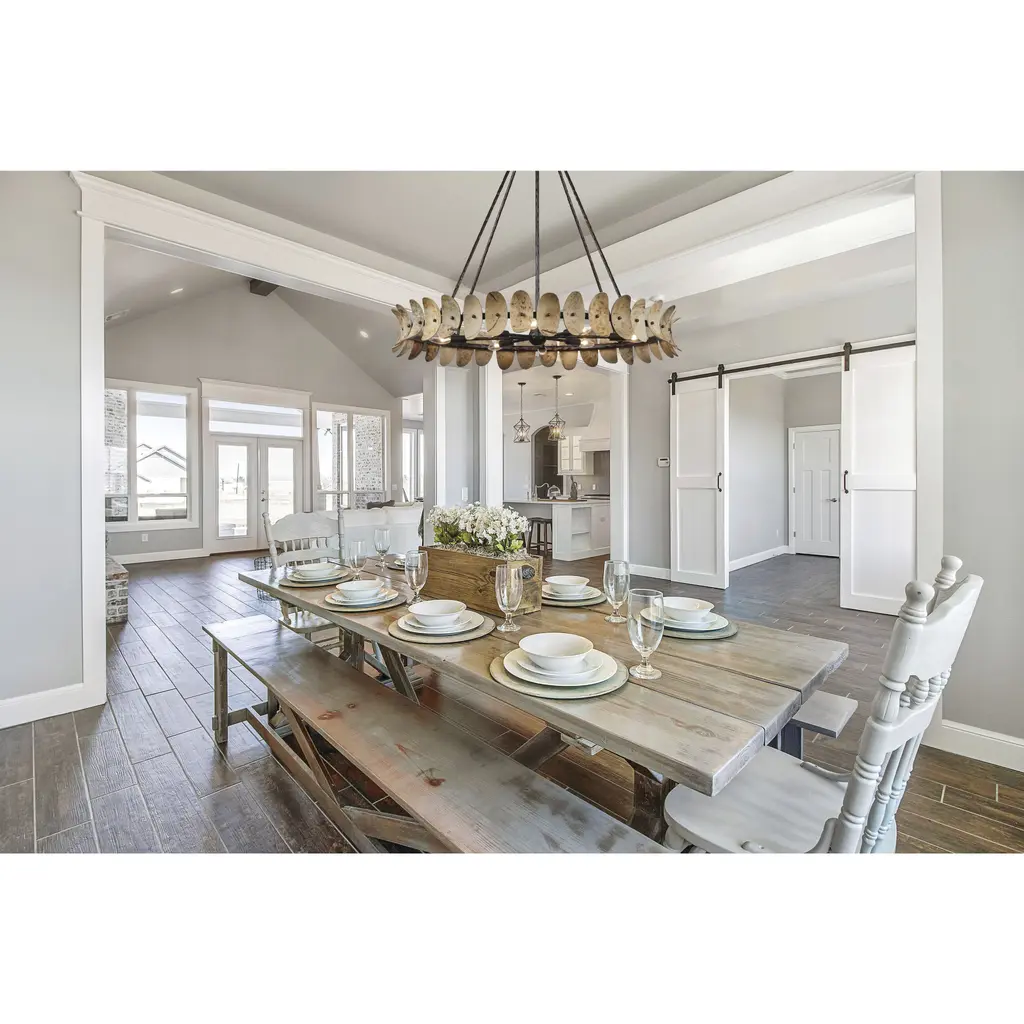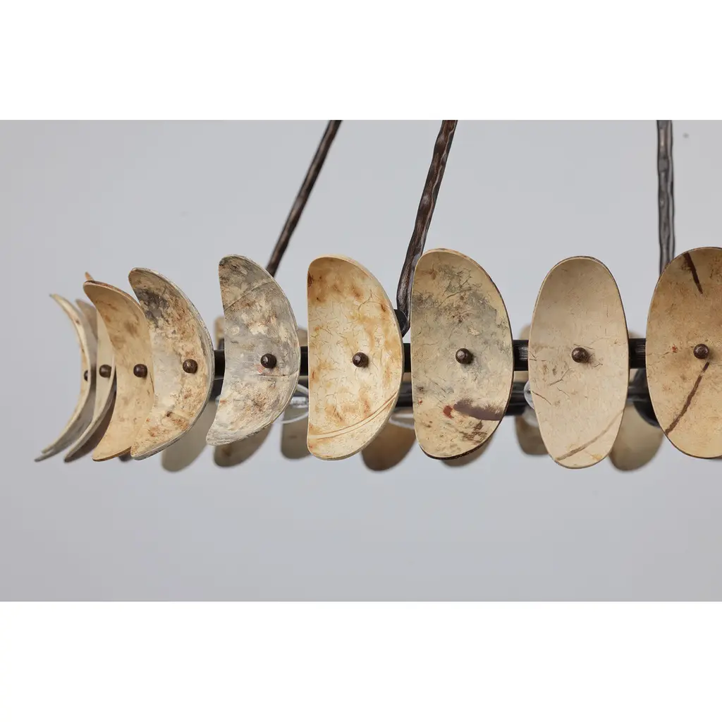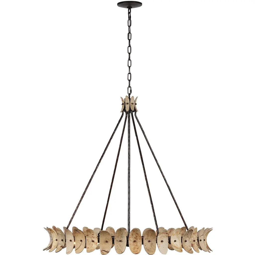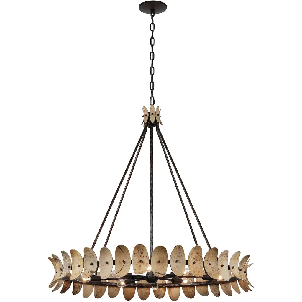The Savoy House Monarch 8-light pendant was designed by Breegan Jane, an award-winning interior designer and TV host. With a look like a statement bracelet, adorned with leaves crafted from stained natural coco shell pieces, Monarch is a standout example of Breegan's signature nature-inspired designs. Each piece of coco shell is unique and may feature variations in patterning and color. A hand-applied Champagne Mist finish adds richness and texture. Monarch is 35.20" in height and 36" in width. Comes with 120" of chain. Uses eight candelabra size bulbs of up to 60 watts per bulb. Bulbs not included.