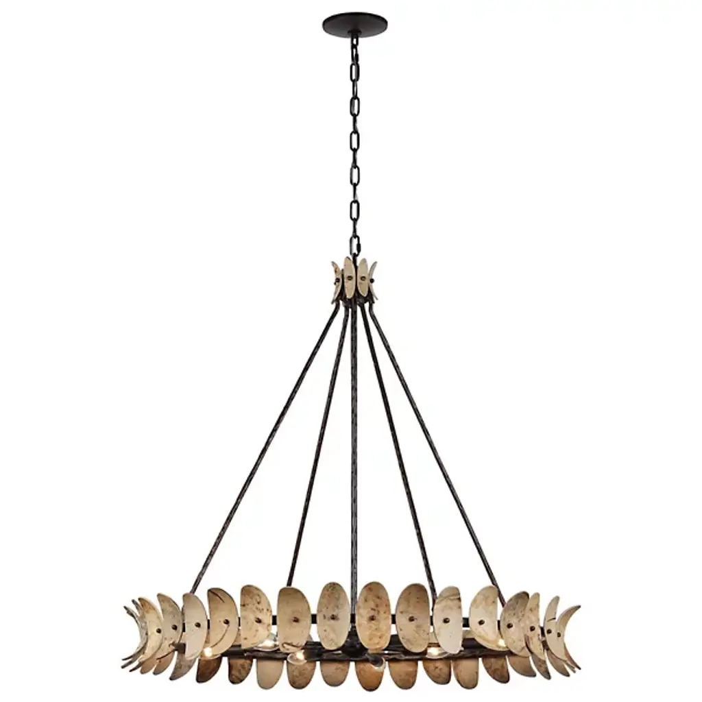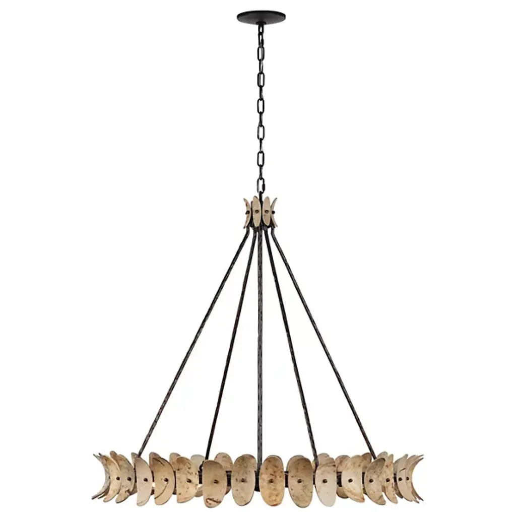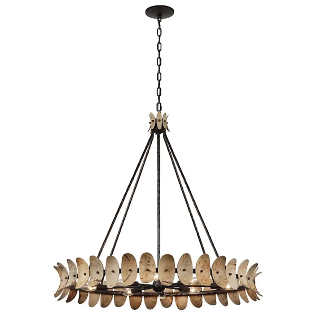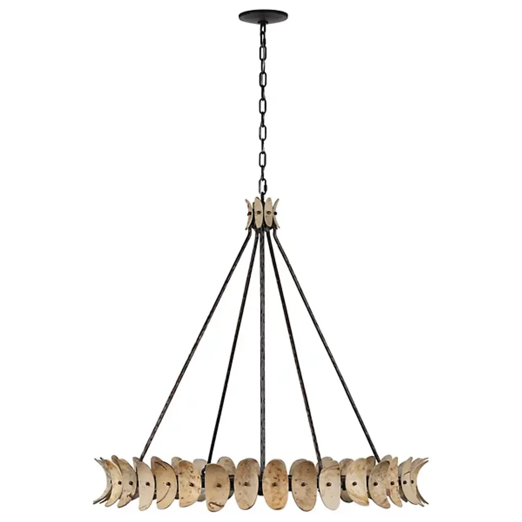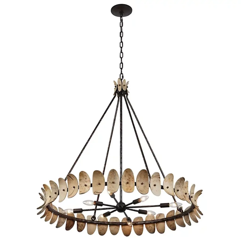 The Monarch Chandelier from Savoy House was designed by award-winning interior designer and TV host Breegan Jane and exemplifies her signature nature-inspired aesthetic. This striking fixture resembles an oversized statement bracelet adorned with leaves crafted from unique stained natural coco shell pieces. Each shell element features distinct variations in pattern and color, ensuring every Monarch Pendant is one-of-a-kind. With its organic materials and bold design, this fixture serves as a standout piece, bringing natural elegance and ample illumination to interior spaces.