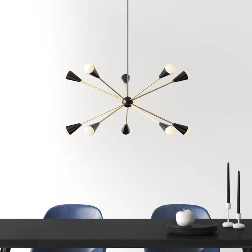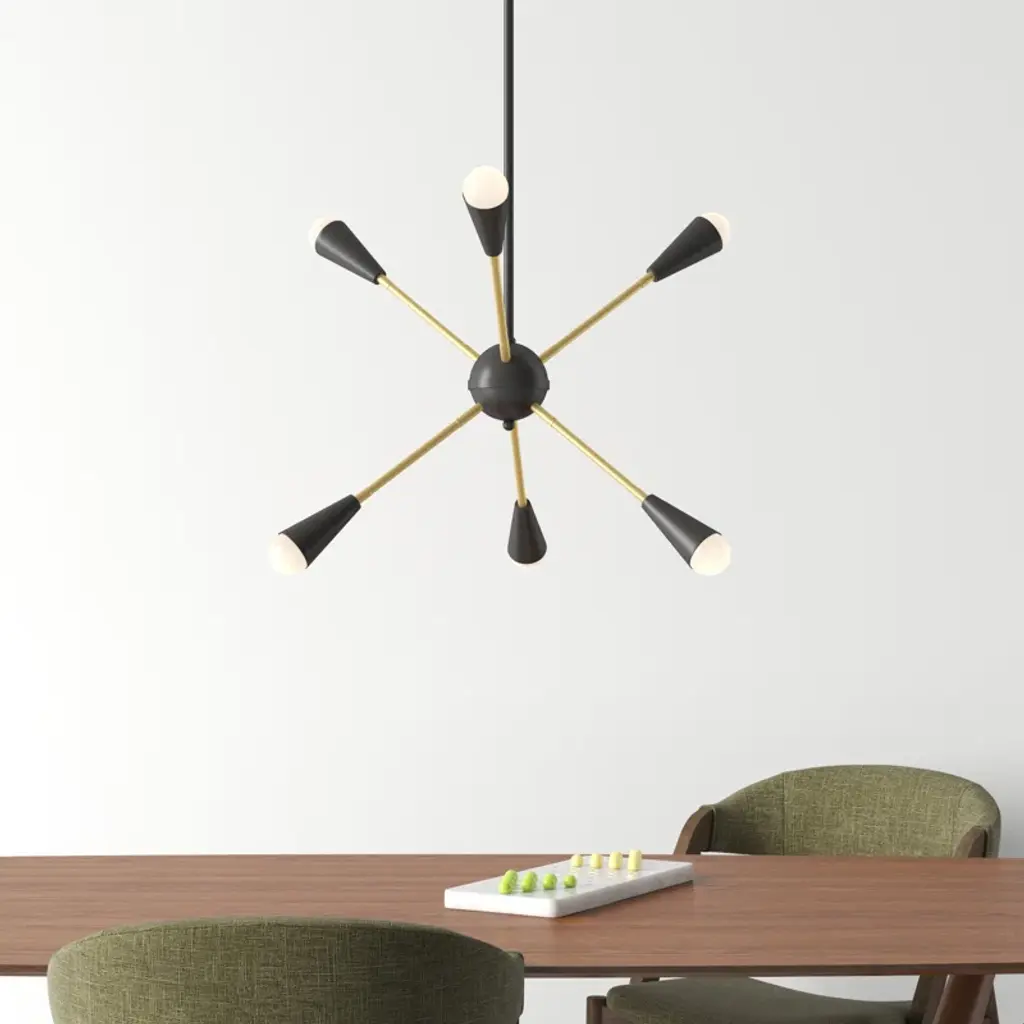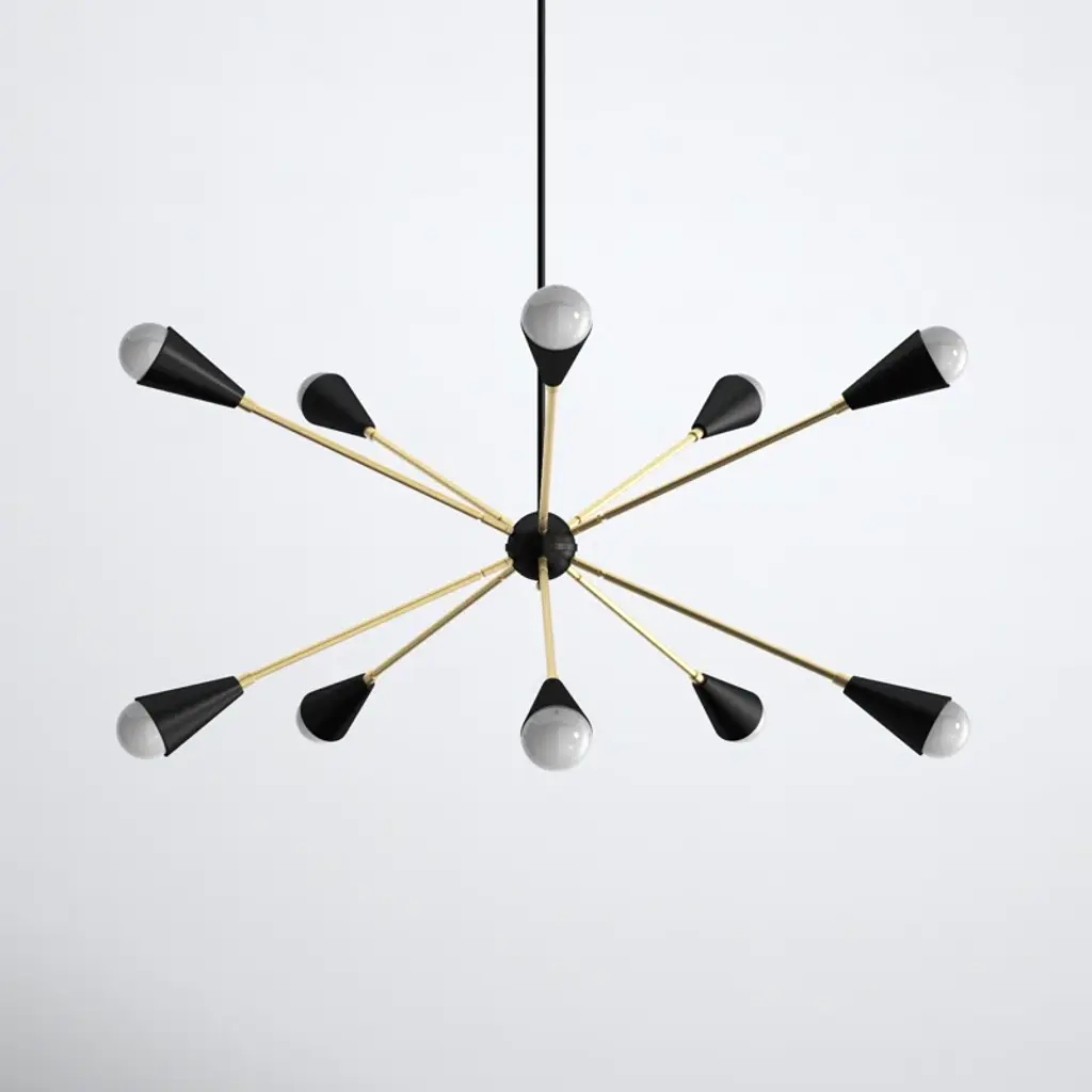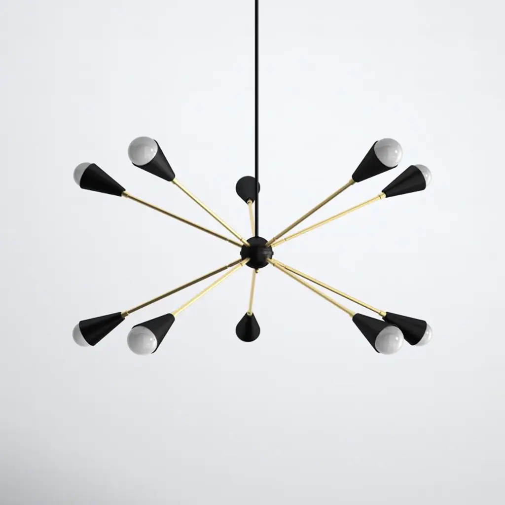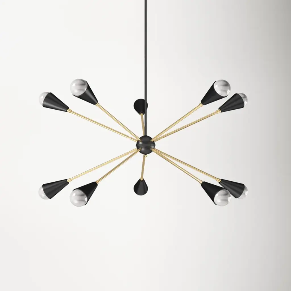 Brighten up your space with dynamic retro style. This sputnik chandelier features an expansive silhouette, with a central orb mount that supports the slim arms. Each arm ends in a cone shade that half conceals the included incandescent bulbs for a bright, retro design. A blend of black and brass finishes create bright modern contrast. It hangs from an adjustable height cord, and with its generous proportions, is best suited to larger rooms like living spaces and dining areas.