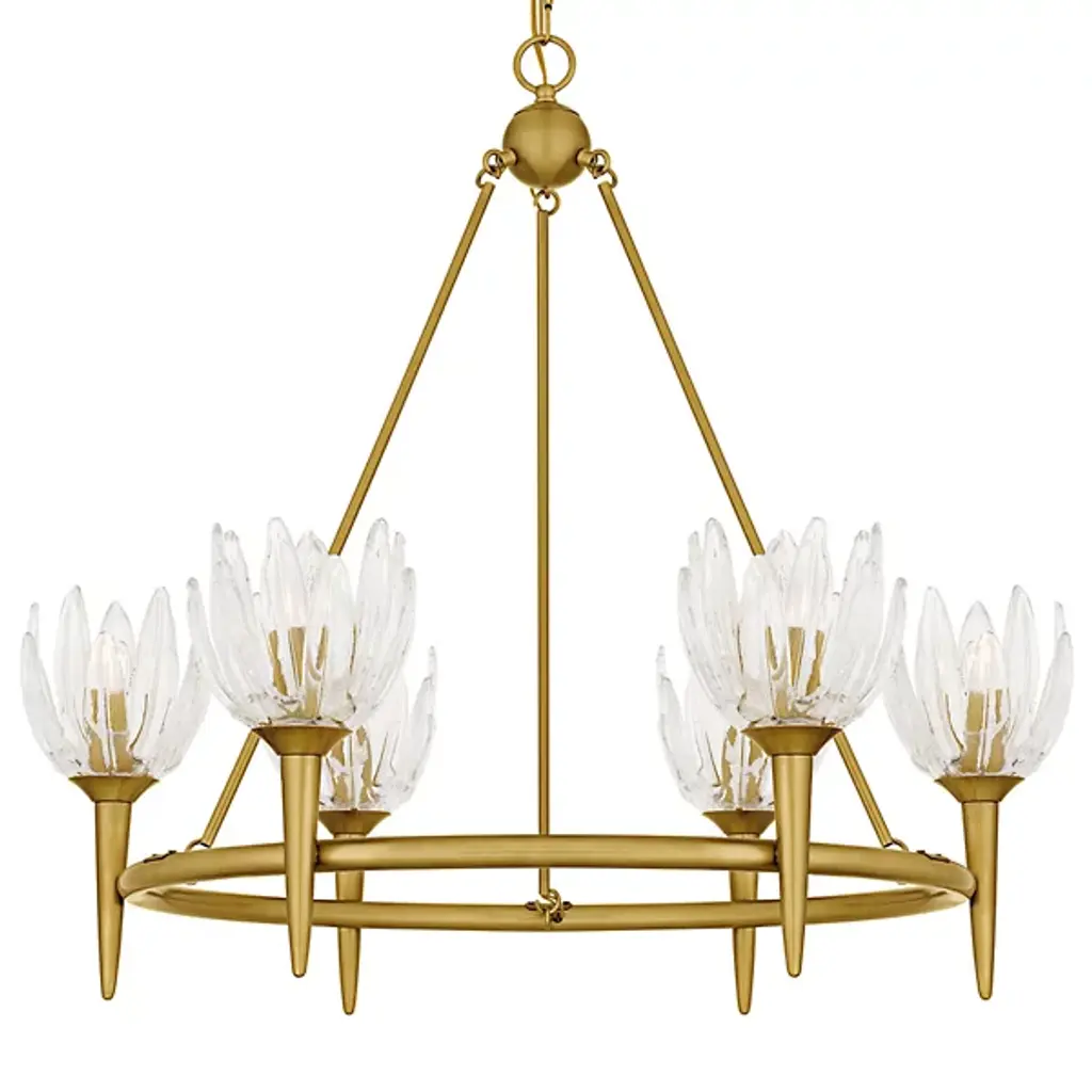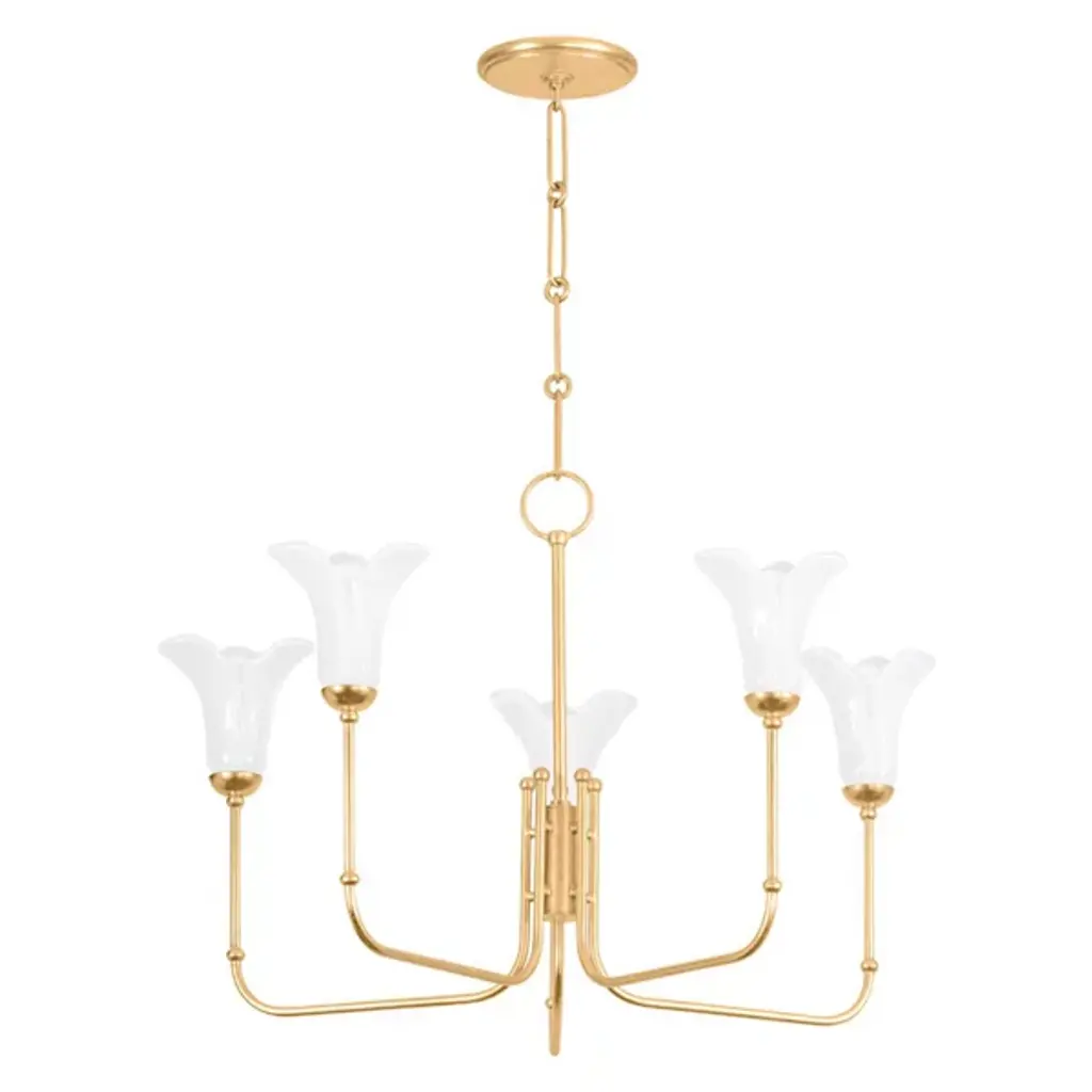 The Montclair Chandelier by Hudson Valley Lighting pays homage to nature's beauty, featuring white Bianca glass shades resembling blossoming flowers gracefully ascending on slender arms finished in metal leaf. Each shade varies slightly from the others due to the unique manufacturing of the shade construction. The opaque quality of the shades delicately diffuses light, creating a romantic ambiance. In a nod to Art Deco design, gold beads adorn the arms, adding a touch of fine jewelry-like elegance. It stands out as a transitional masterpiece, its design capturing the essence of natural elegance. Please note that due to the unique nature of the medium, colors and patterns may vary slightly from the image shown.
