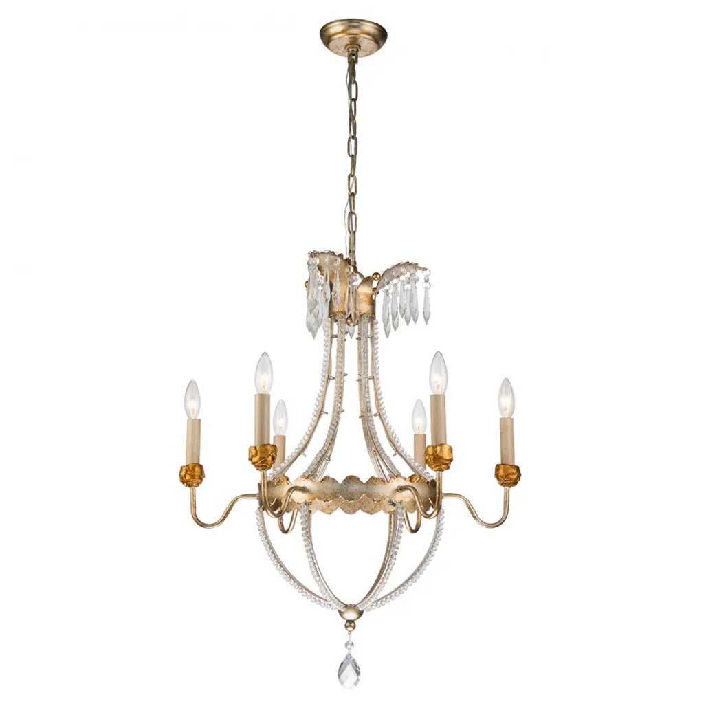 The Old World classic empire styled chandelier blends a traditionally designed shape with a unique and updated eclectic charm. Stunning rows of hand molded shapes grace the metal frame in an elegant horizontal design showing off the antique gold finish of this contemporary mini chandelier. Three candlestick lamps with weathered gold shaped bobeches and a traditional shape, give this Lucas McKearn classic a favorite status. Design elements include the unique mix of finishes, charming shape and French vintage inspired accents combined into a traditional piece that is on-trend for the updated traditional style that is at the top of design trends.