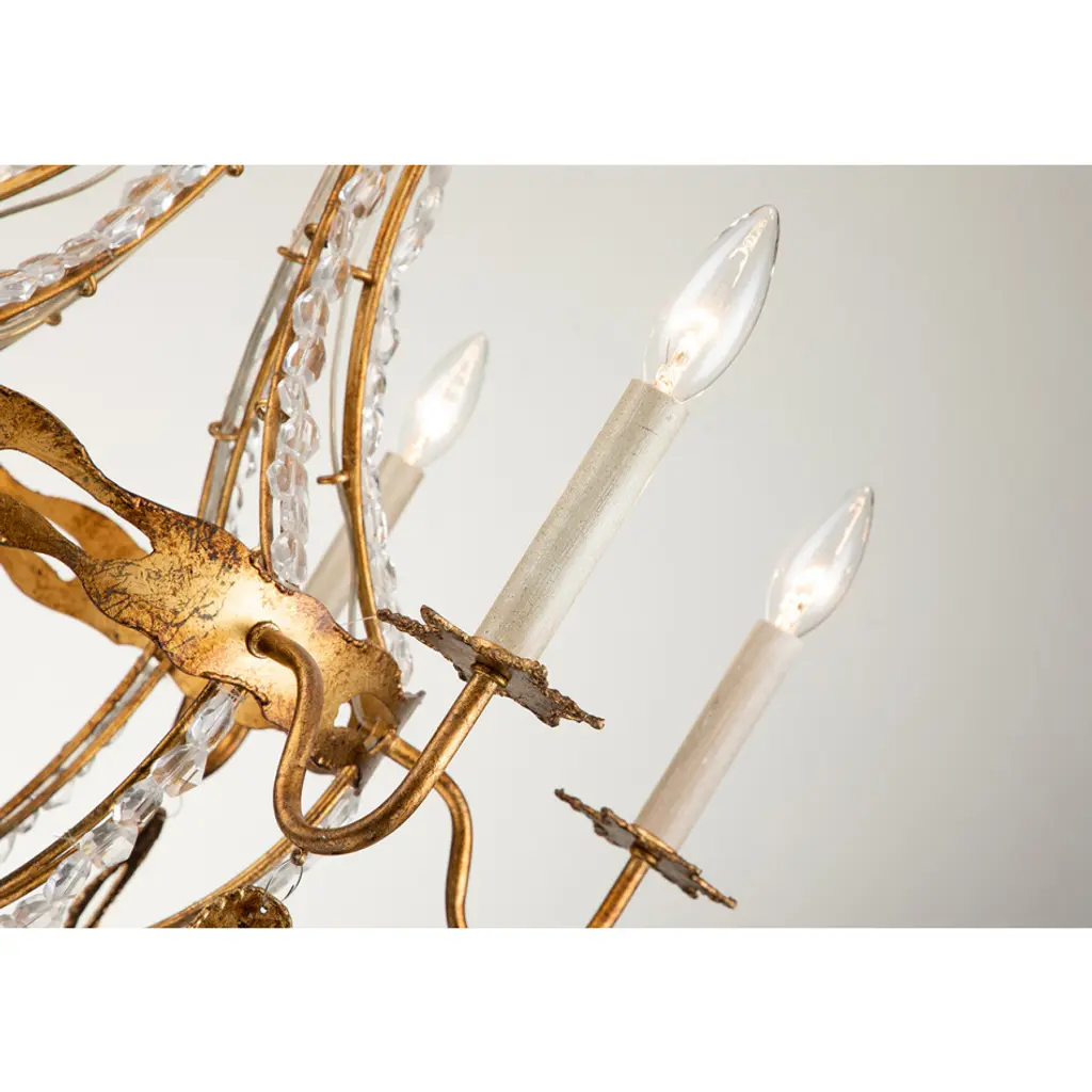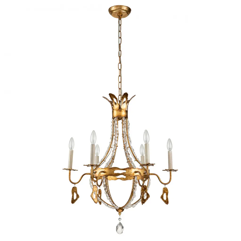 The Old World classic empire styled chandelier blends a traditionally designed shape with a unique and updated eclectic charm. Stunning rows of hand molded shapes grace the metal frame in an elegant horizontal design showing off the antique gold finish of this contemporary chandelier. Six candlestick lamps with weathered gold shaped bobeches and a traditional shape, give this Lucas McKearn classic a favorite status. Design elements include the unique mix of finishes, charming shape and French vintage inspired accents combined into a traditional piece that is on-trend for the updated traditional style that is at the top of design trends.